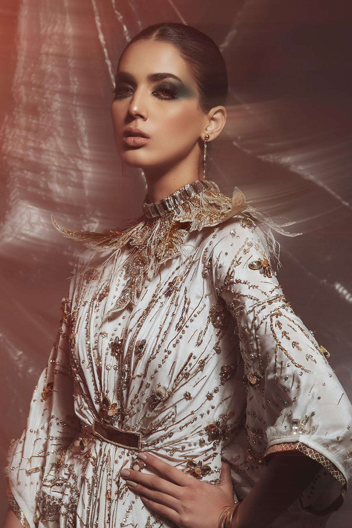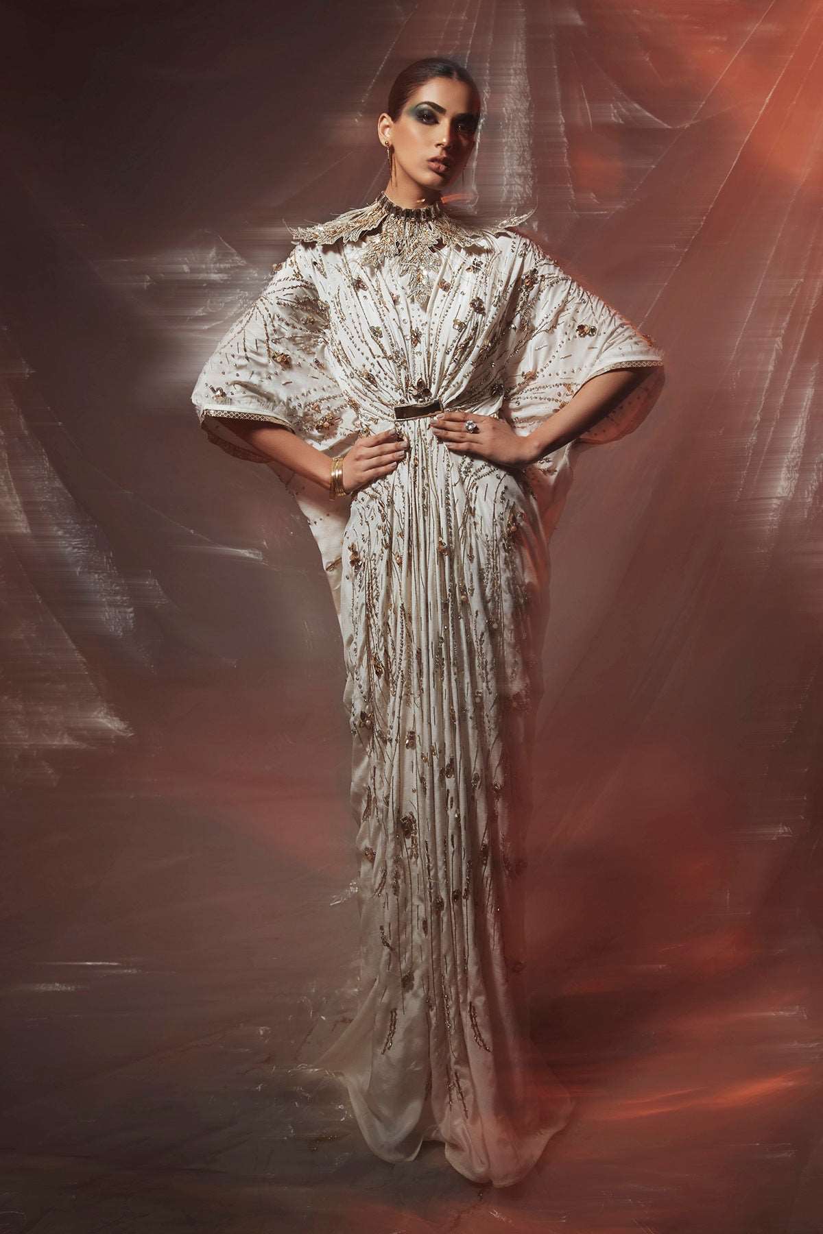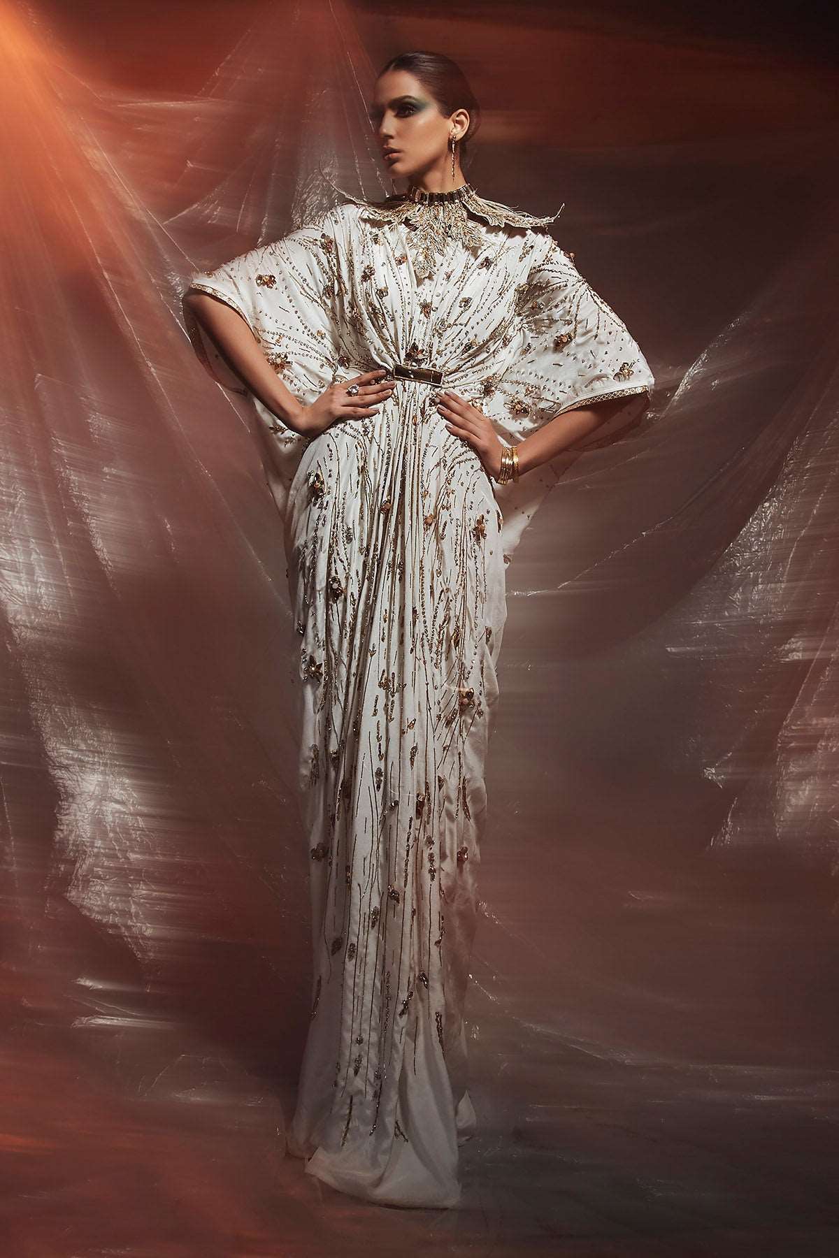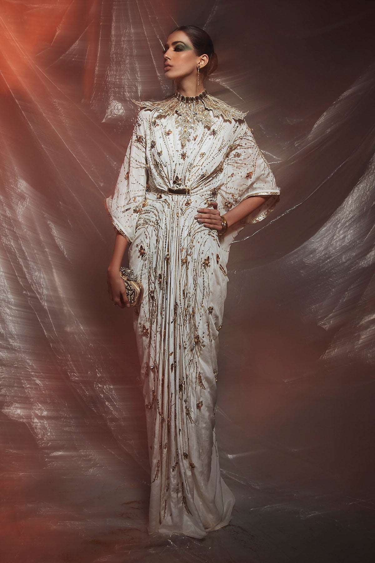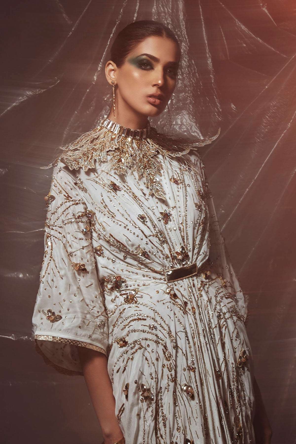 An ethereal Caftan with ganga jammni (gold & silver) intricate hand embroidery with a disperse of clustered stones and crystals all over on lush pure crépe. The back and front, both are laden with exquisite details