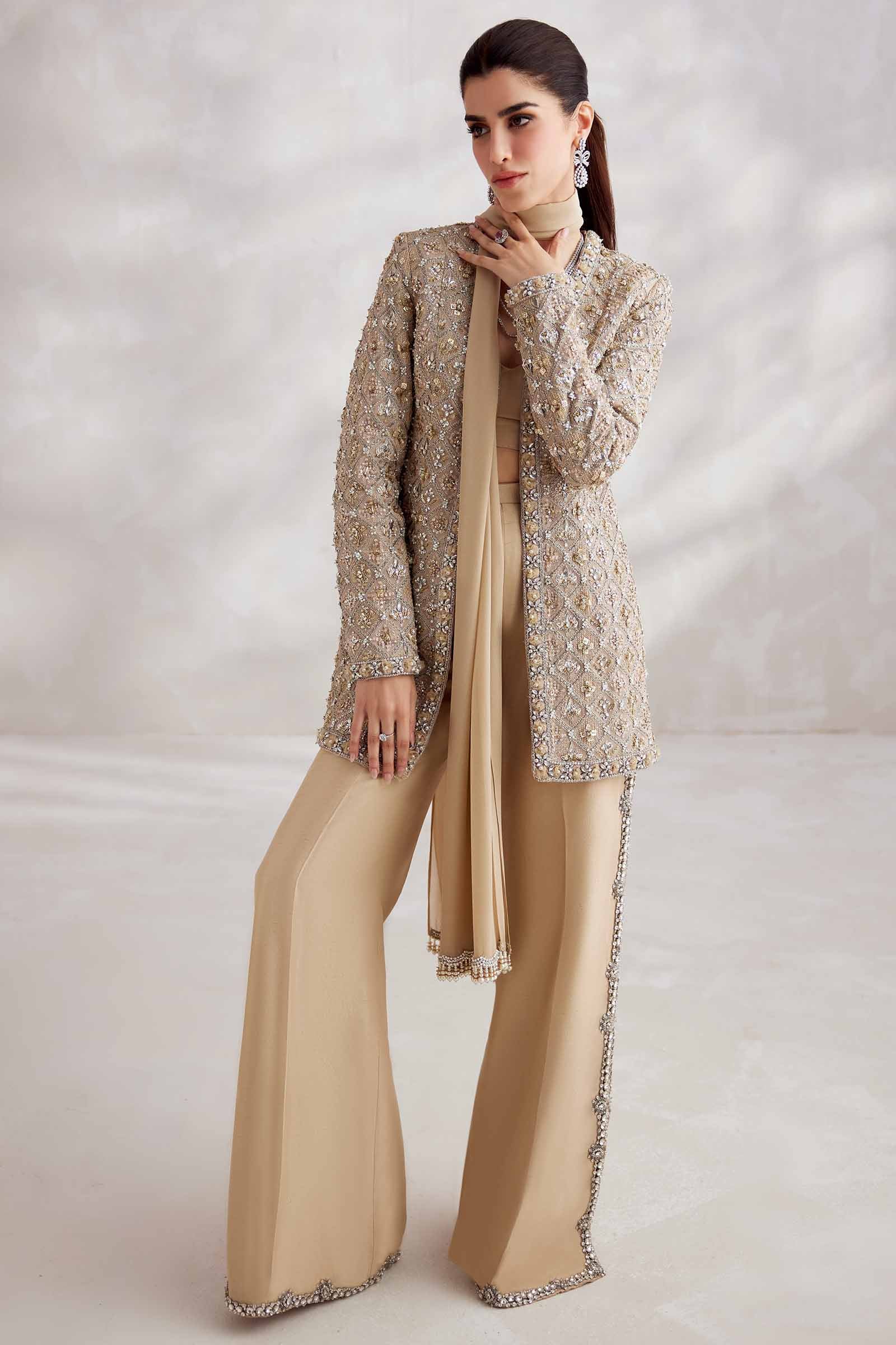 Component: Bustier | Jacket | Trouser | Dupatta Fabric Details: Chiffon | Raw Silk