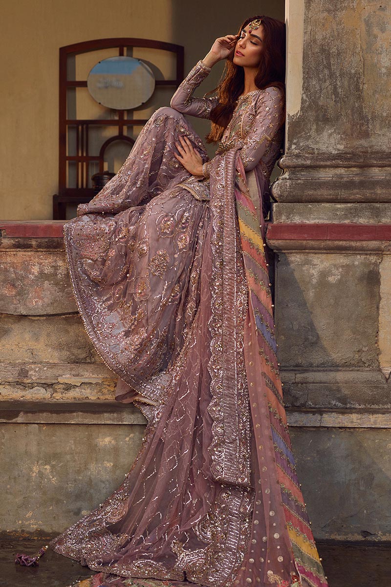 A 4 piece lilac bridal consisting of an elaborate kameez paired with a heavily embroidered farshi gharara set on a stunning organza base complimented with a lilac dupatta studded with golden zari and embroidery and a sequin spray dupatta complete with chatta patti borders.
