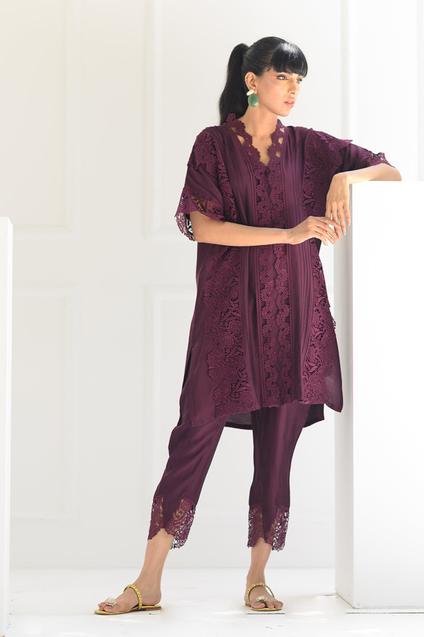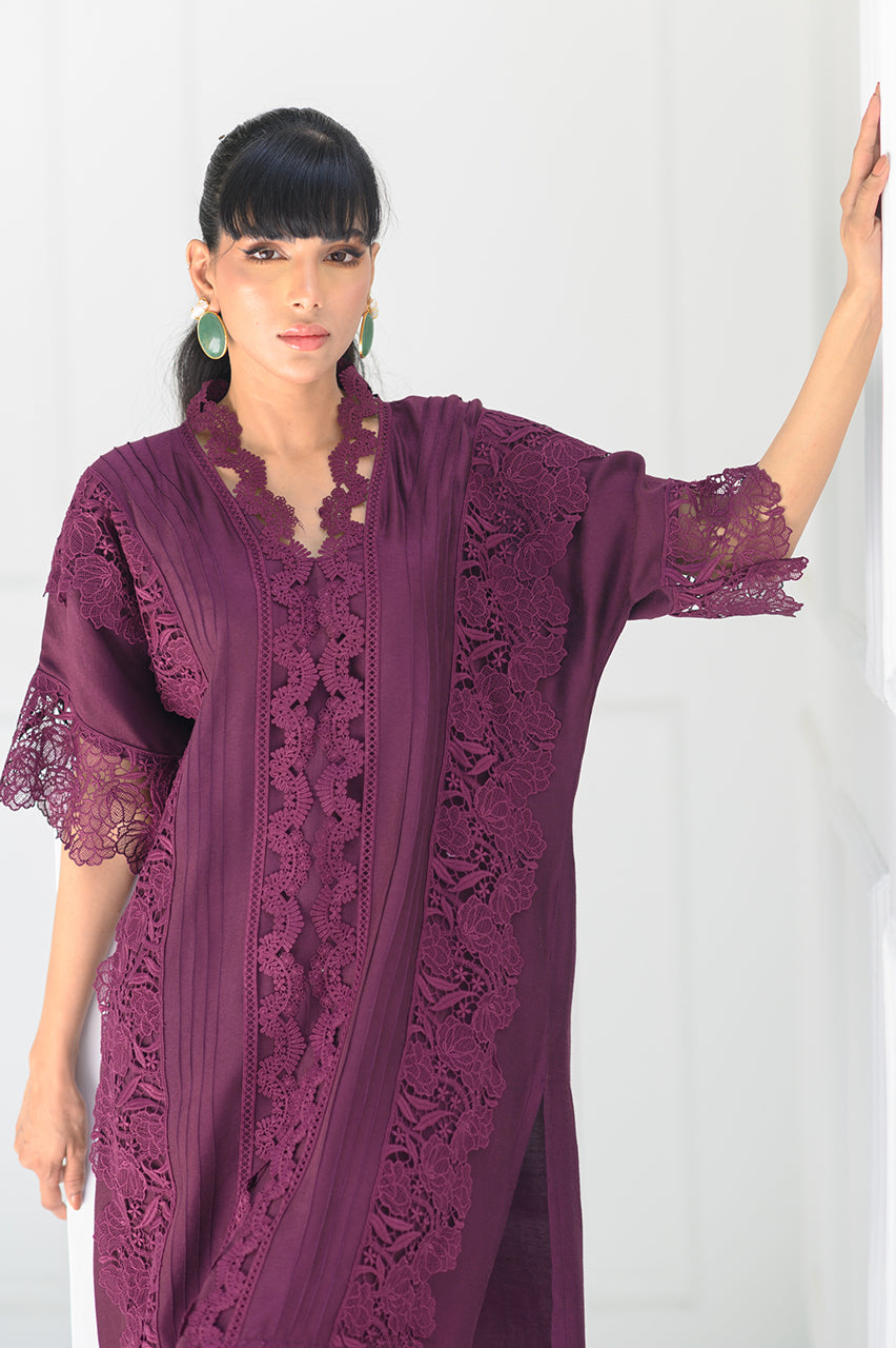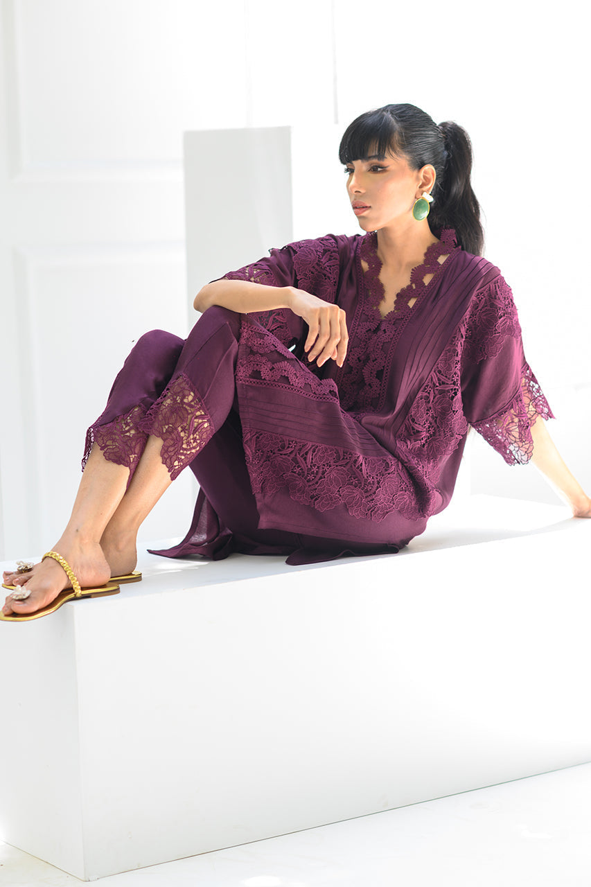 A boxy oversized drop shoulder shirt featuring pintuck details and laces. The artfully curated laces on the neckline further add elegance to this royal palette. Pair it with matching shalwar pant for a look that will take you from evening to night.