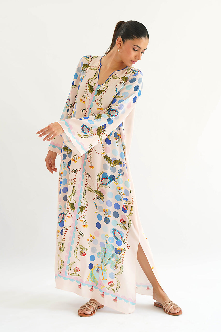"A flattering silhouette cut from crepe, this ivory kaftan is designed to make you feel beautiful, comfortable, and confident. The botanical print in refreshing shades of aqua cascades fluidly along the slender length, making it a must-have for the season."