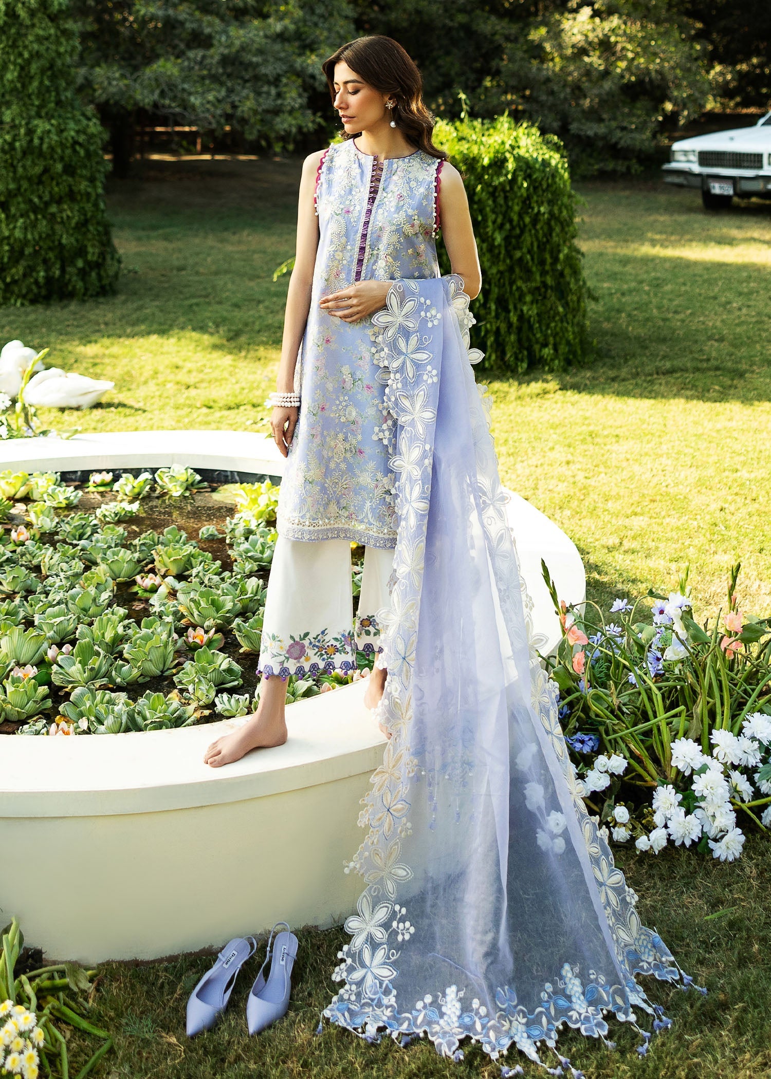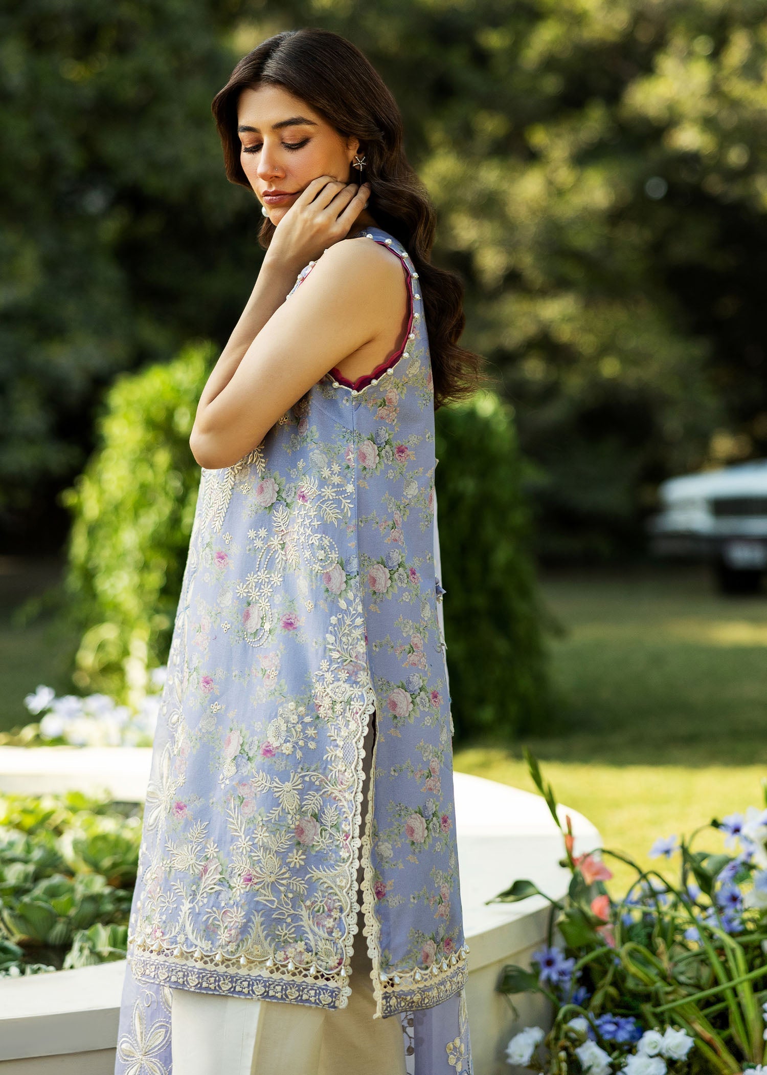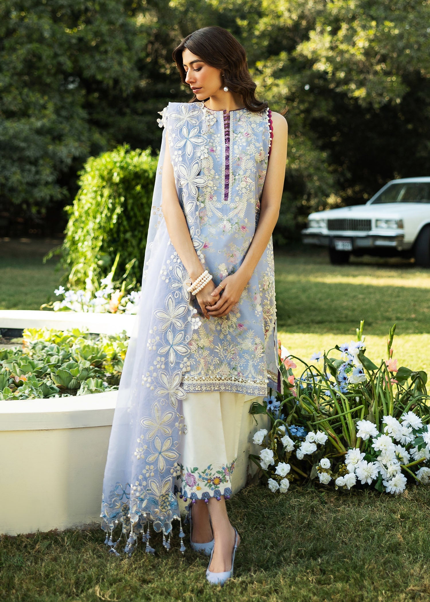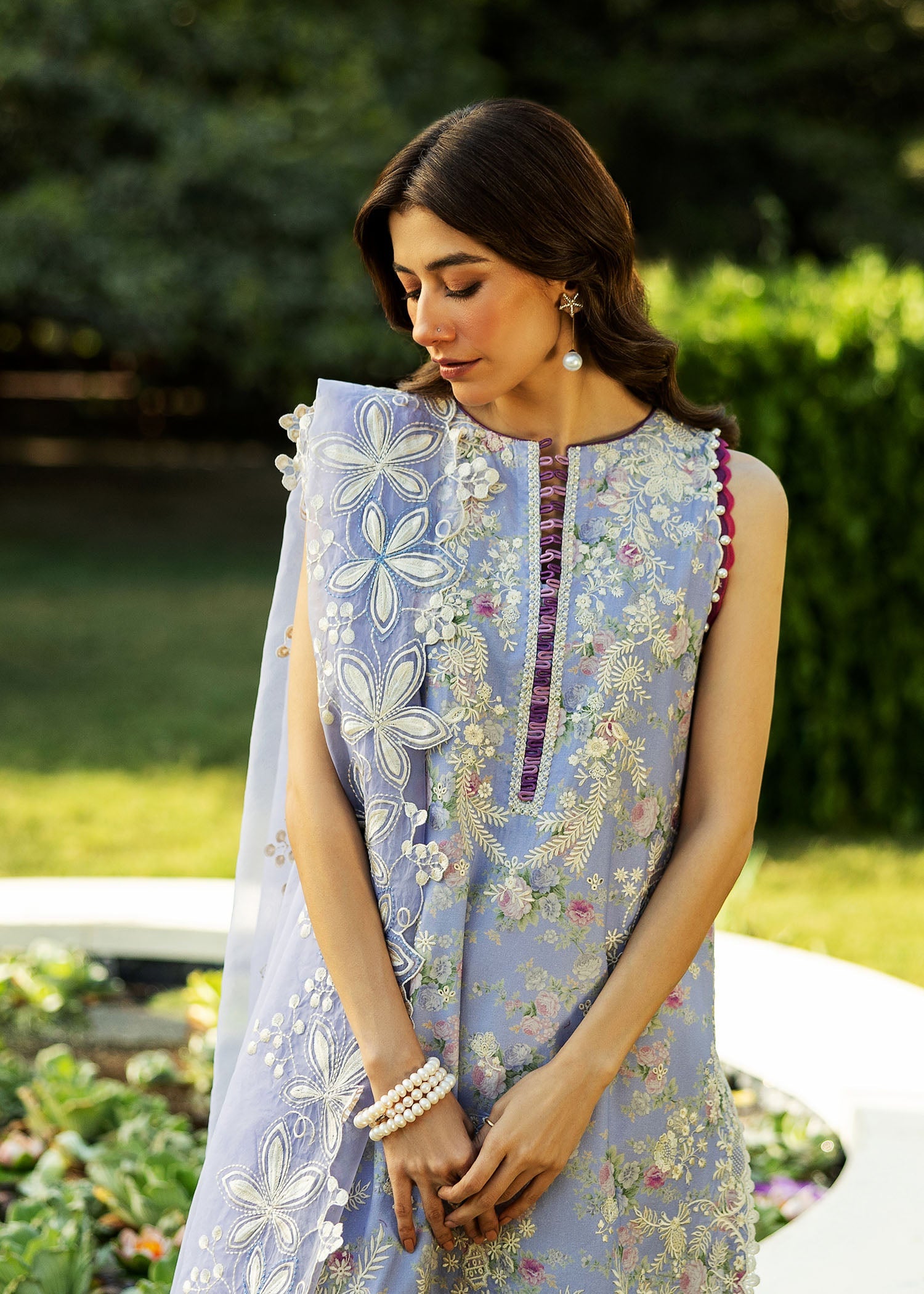 Offering the best of intrinsic femininity to your wardrobe, a floral canvas blooms with delicate embroideries and statement color accents. Finely crafted organza dupatta framed with prominent florals is a keeper for many more summers of feminine flirtation.