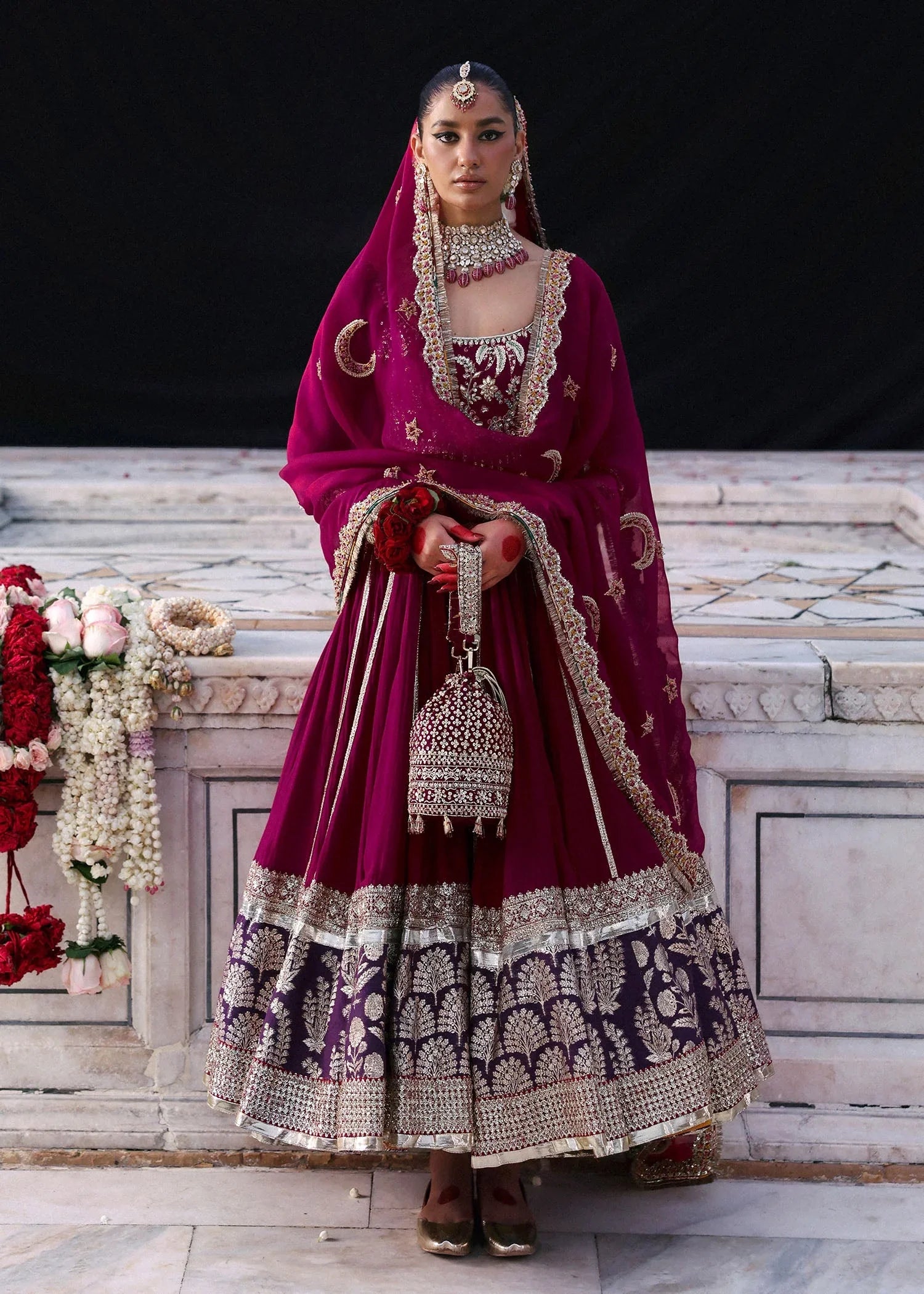 This red pishwas with purple accents is a stunning blend of boldness and sophistication. This chanderi pishwas with heavy borders and embellished attached bodice paired with contrast colored banarsi churidar is a timeless, regal silhouette that blends traditional Mughal grandeur with modern craftsmanship. Paired with an ordanza , scalloped dupatta, celestial-inspired piece that blends delicate craftsmanship with whimsical charm. It’s perfect for mehndi, sangeet, receptions, or even as part of a bridal look for someone seeking an ethereal, romantic aesthetic..