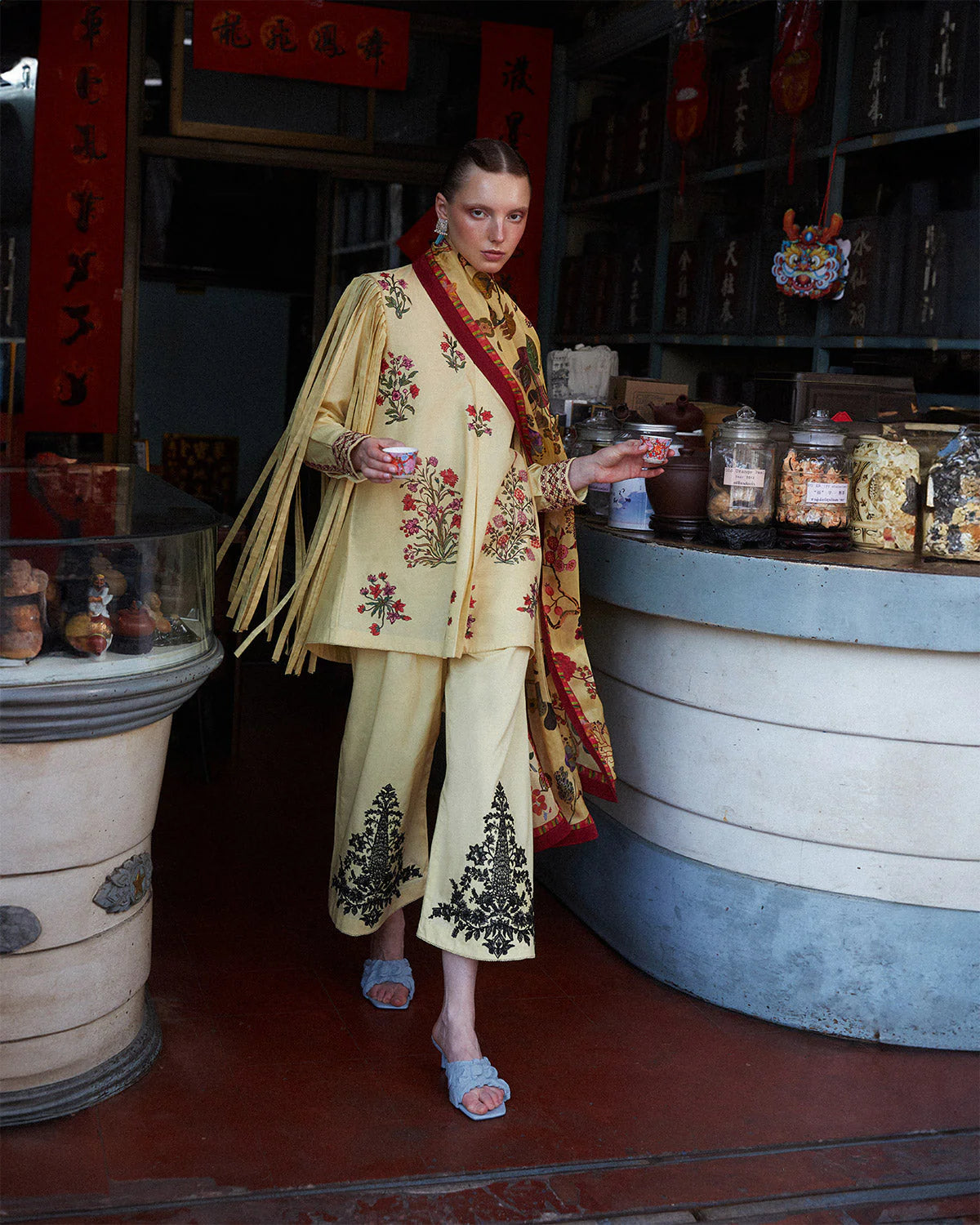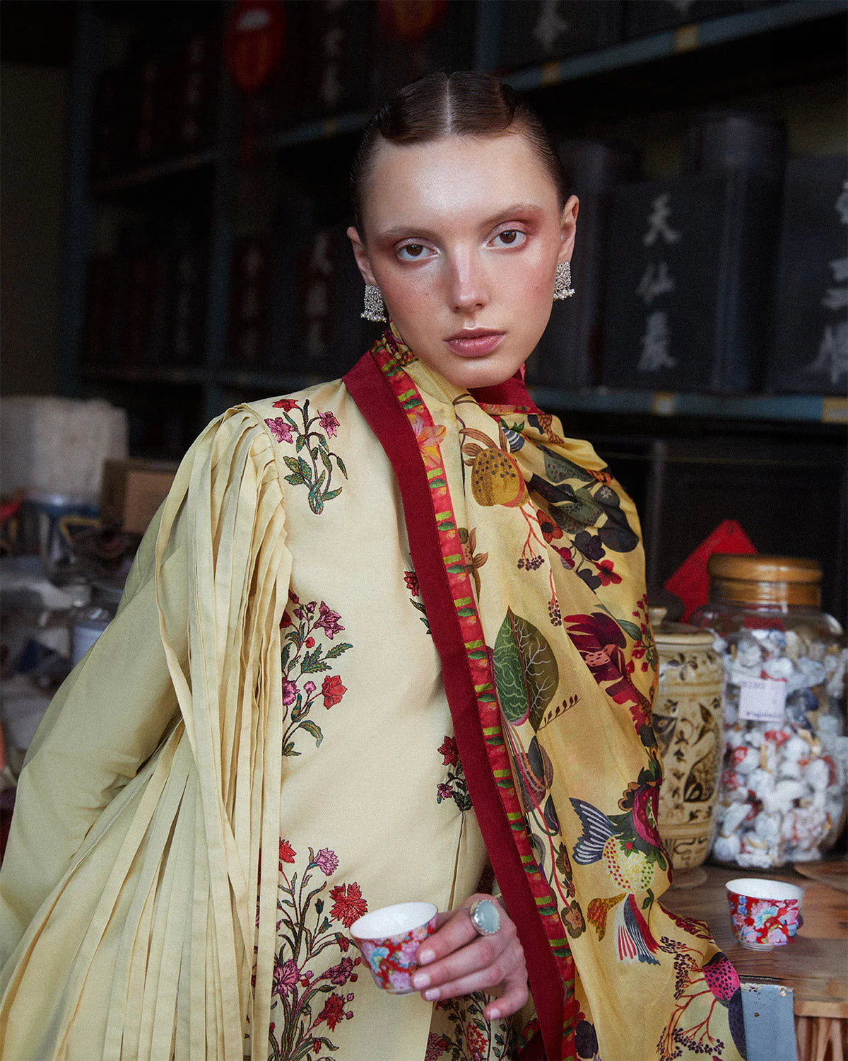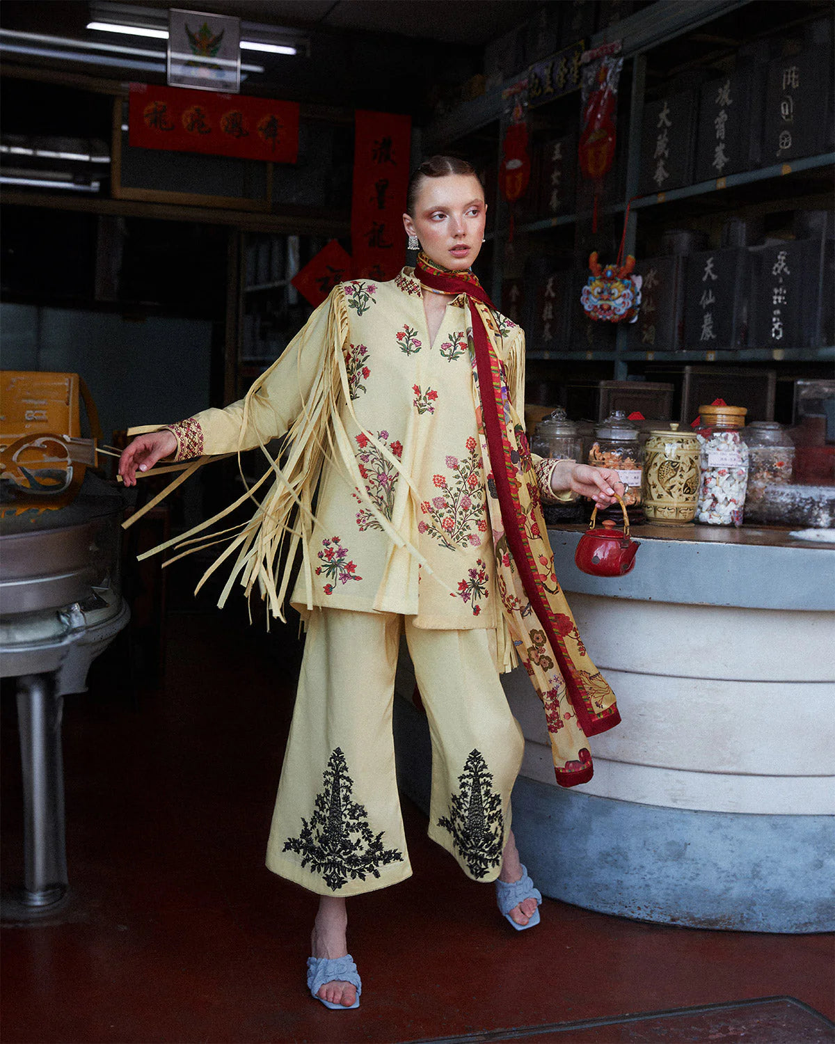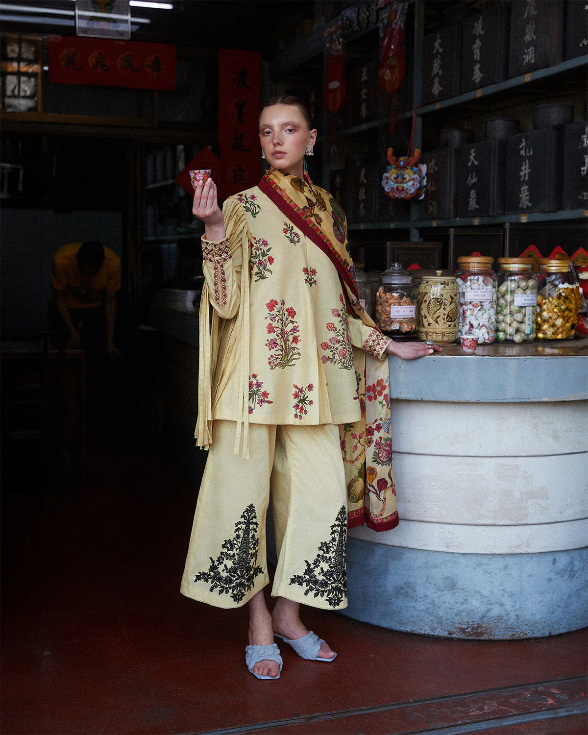 Product Description: Eclat captures the essence of sunshine with its powder yellow hue. The embroidered shirt boasts multicolor motifs that add a lively and artistic touch, while the fringed sleeves bring a playful element to the design. The matching trousers in powder yellow feature black embroidered motifs that create a striking contrast and enhance the overall aesthetic. Completing the ensemble is a printed silk dupatta that adds a touch of elegance with its captivating patterns