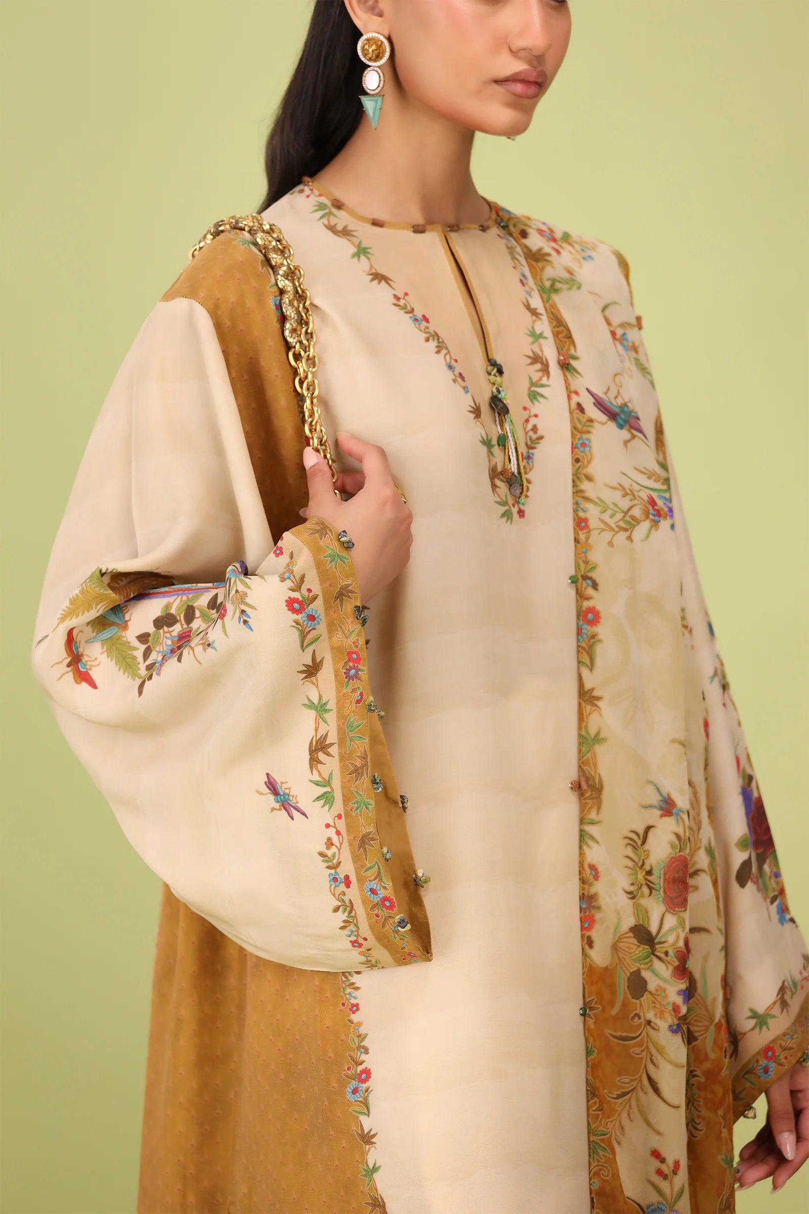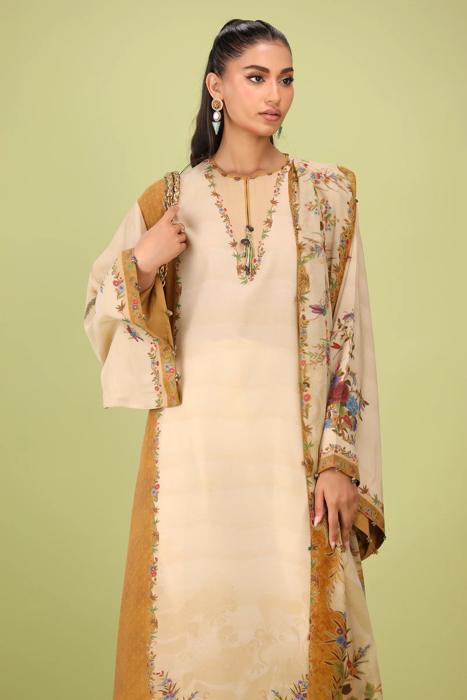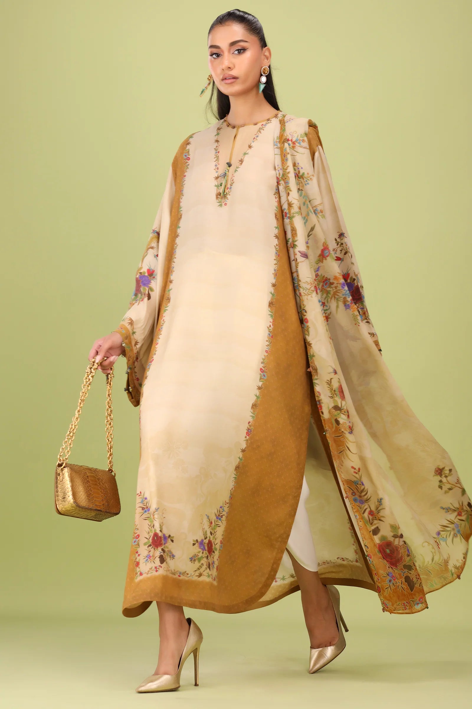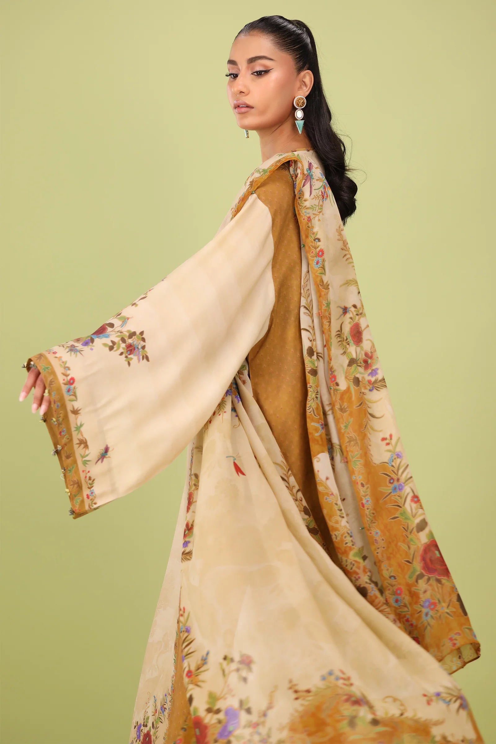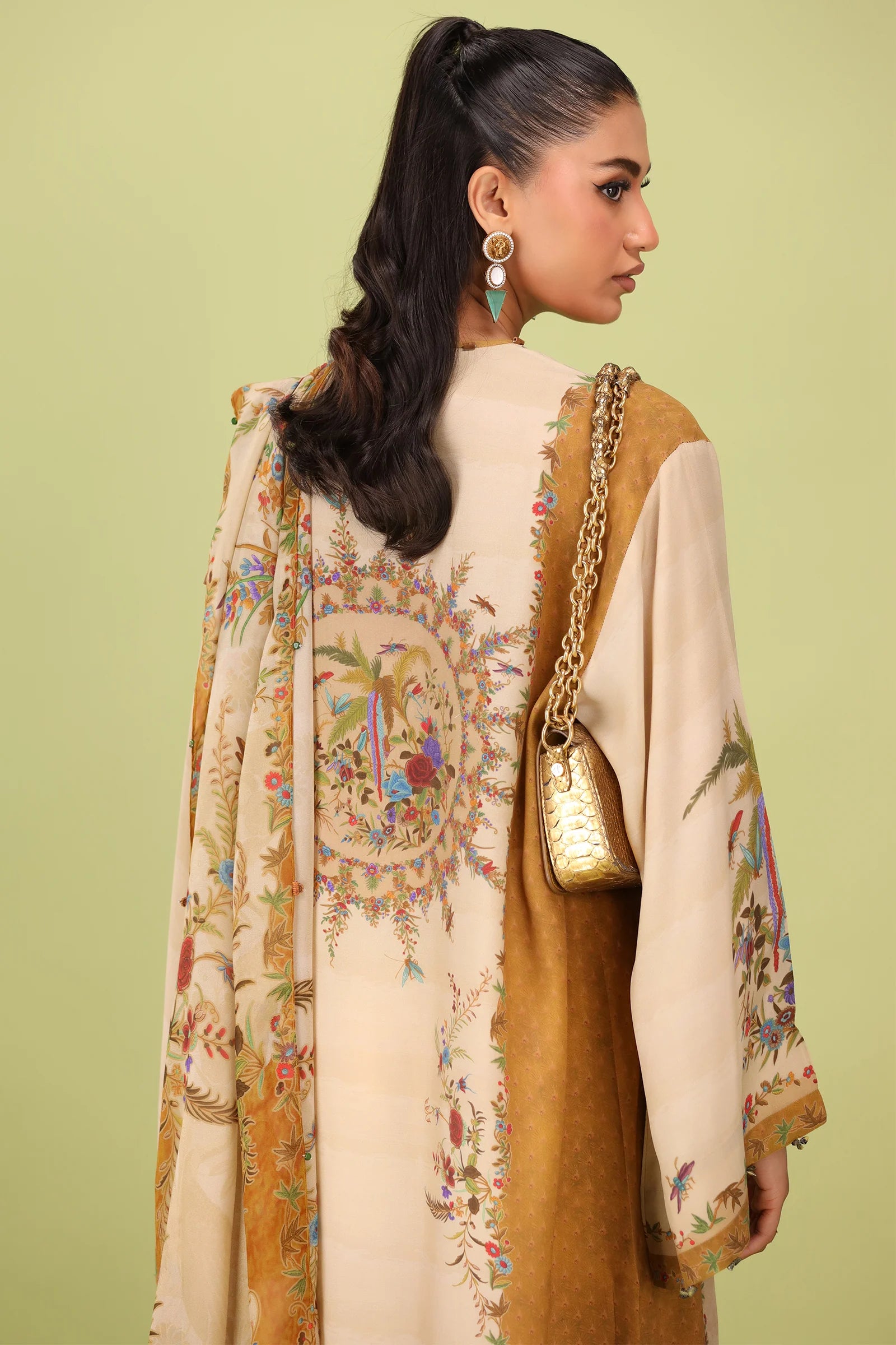 A mesmerizing botanical reverie, "Edena" from unfolds like a secret garden on a delicate silk canvas. At its heart, a beige-gold hue blooms, seamlessly blending into a color-blocked yellow ochre, reminiscent of golden dawn filtering through lush foliage. An artsy floral print unfurls across the silhouette, echoing the untamed beauty of nature, while a sumptuous printed silk dupatta—a masterpiece adorned with florals, fluttering butterflies, and swaying palm leaves—evokes the enchantment of a garden in full bloom. The pièce de résistance? A beautifully illustrated back motif, adding a final touch of splendor to this botanical dream.