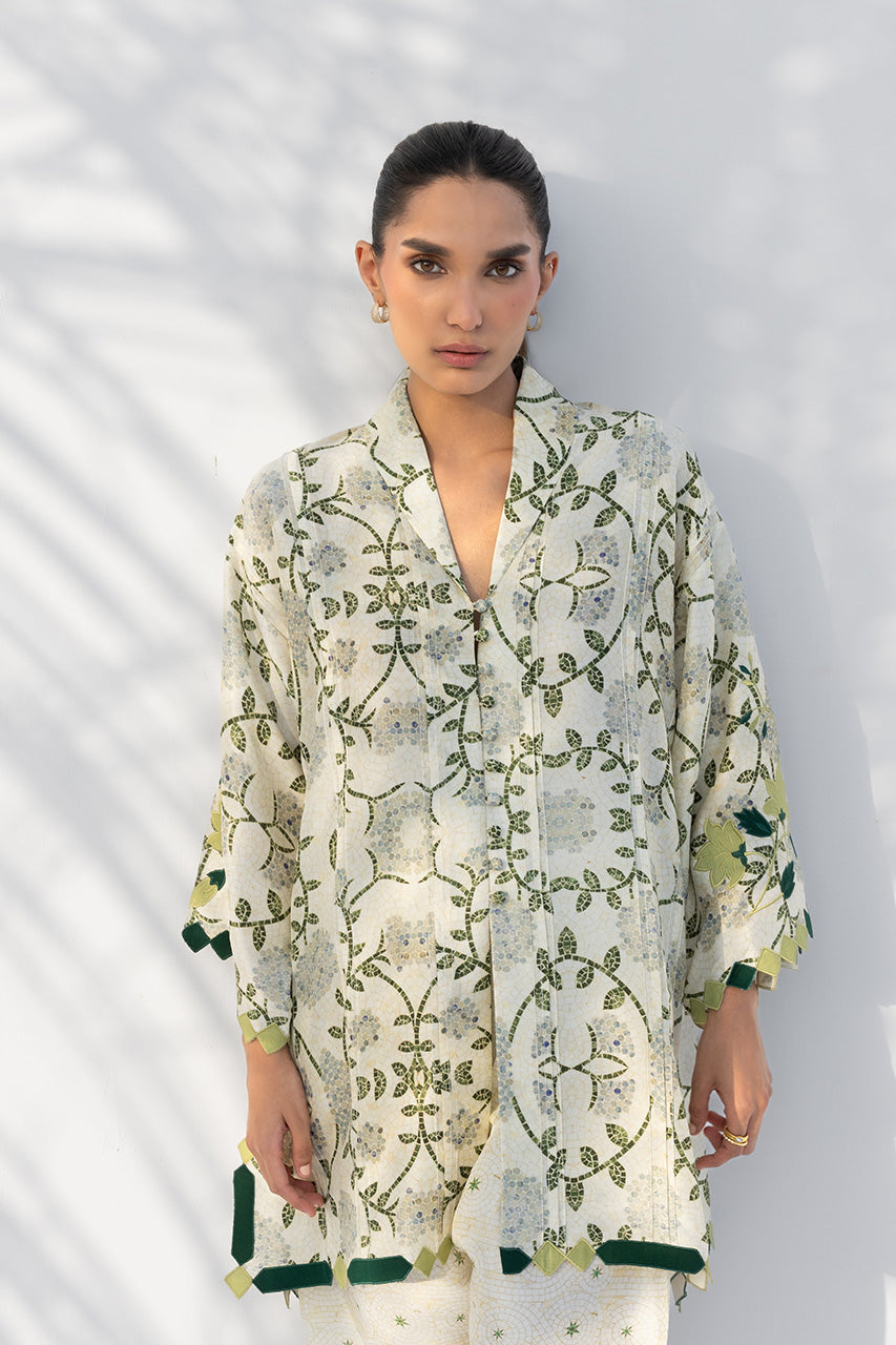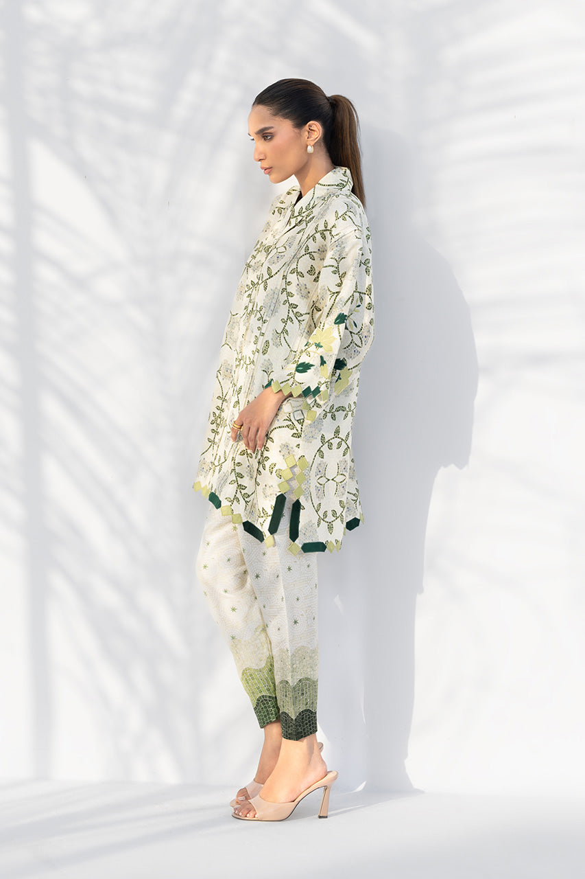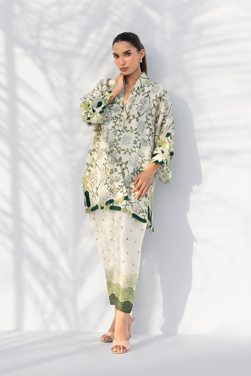 A buttermilk-hued pure Raw Silk ensemble captures a fresh, botanical charm. The tailored shirt is adorned with delicate floral vine prints in soft sage green and misty grey, featuring a collared neckline and pleat detailing along the front. Scalloped deep forest green borders frame the hem and cutwork sleeves, enhanced with dimensional appliqué leaf accents. It is paired with a tapered shalwar in a coordinating print, finished with a striking, patterned green border at the cuff.