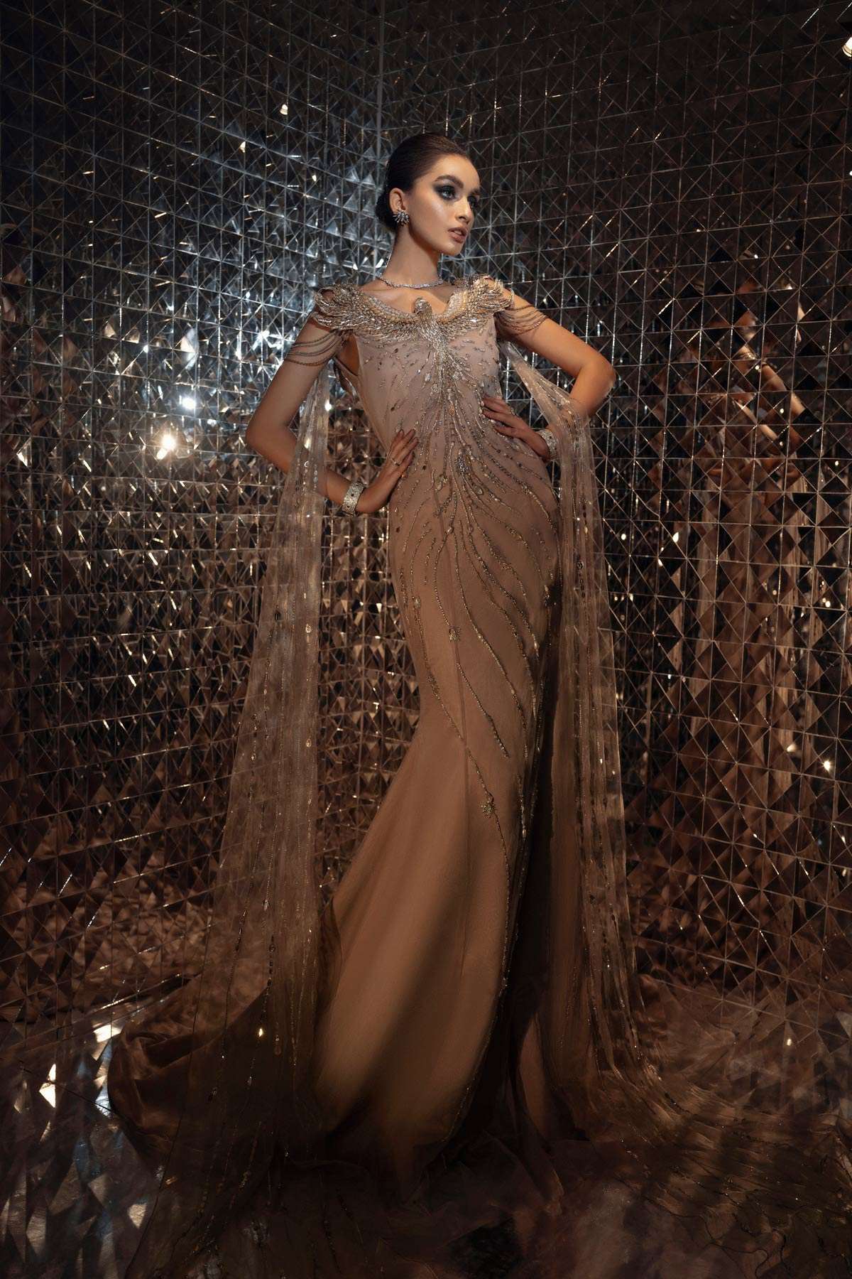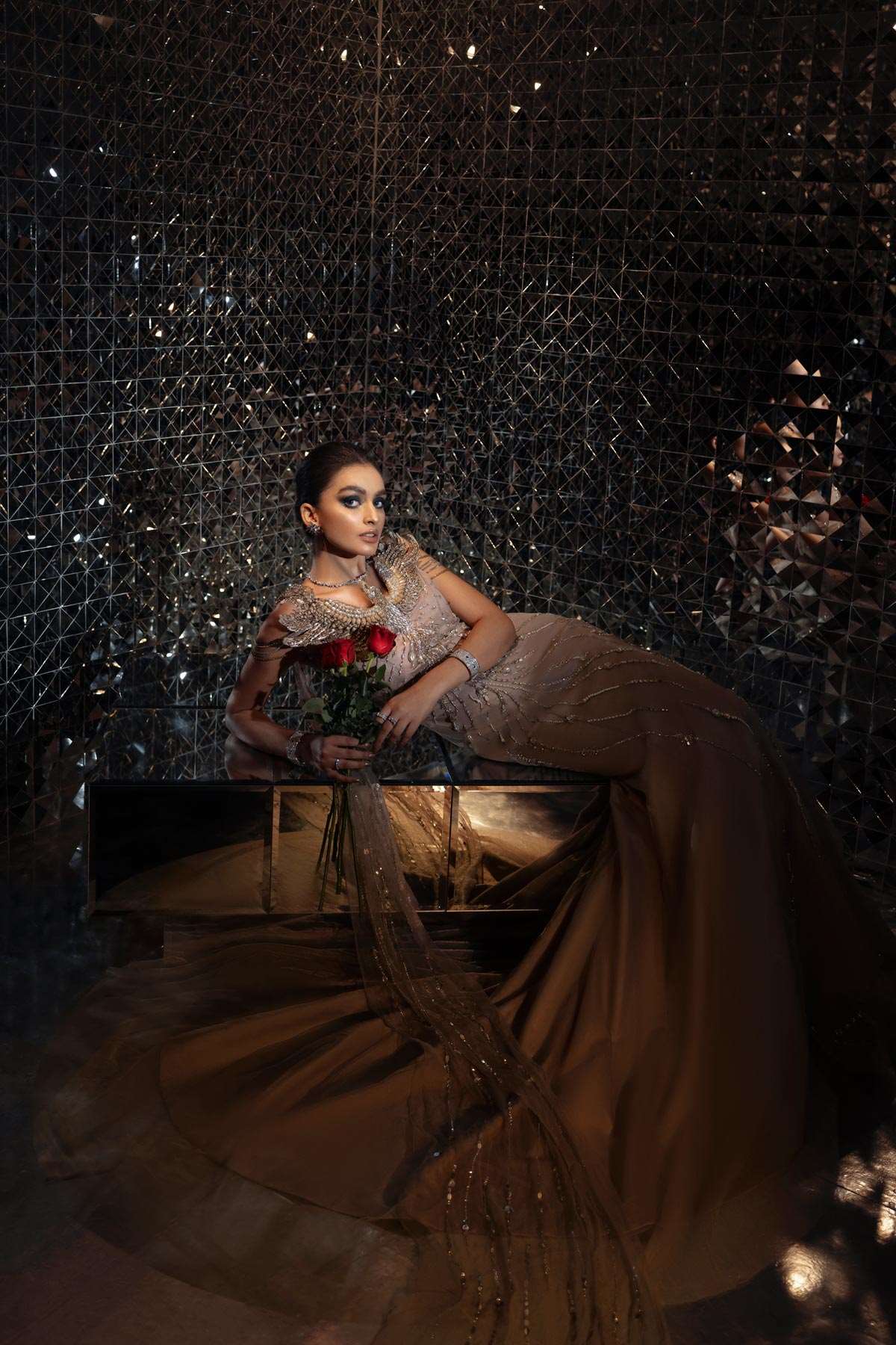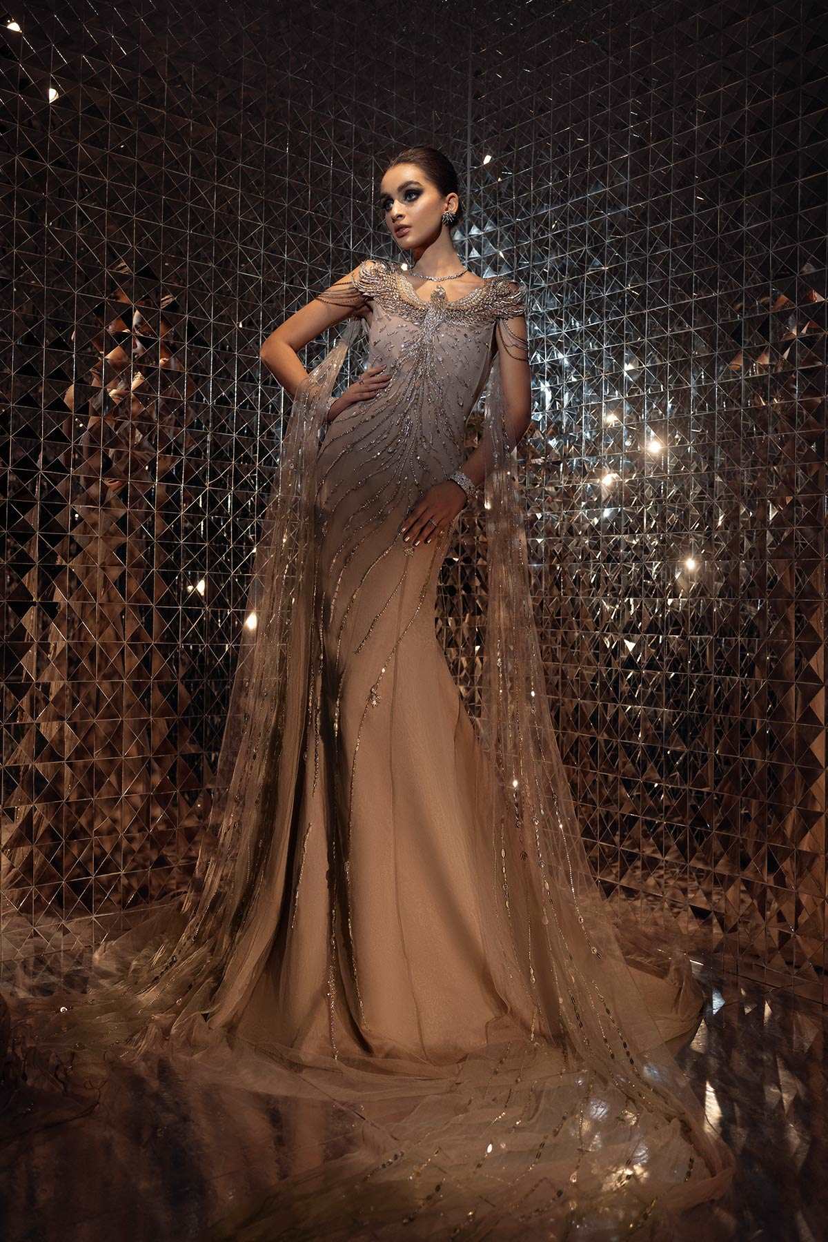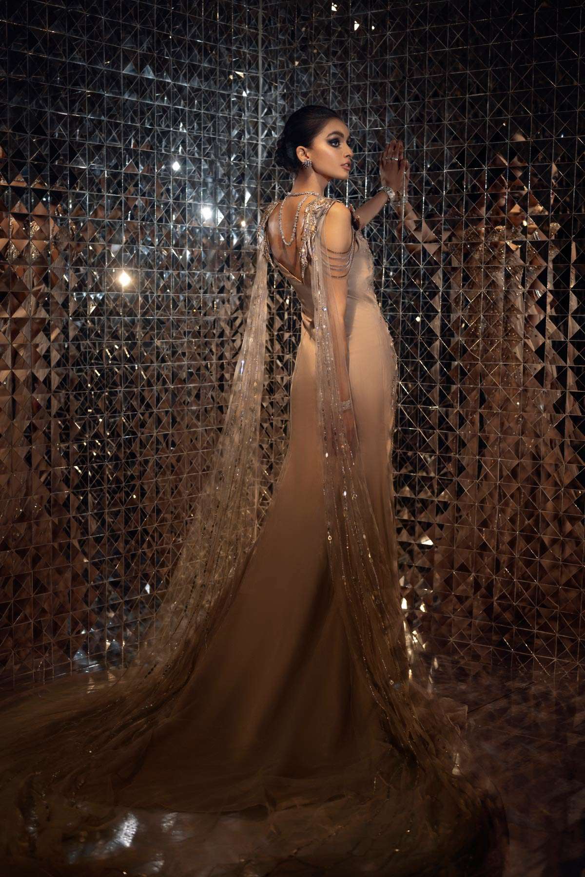 Drapes of surreal, cloud-Ivory hued tulle, artistically illustrated with a rising Phoenix. Hand-worked details and appliqués dazzle with exquisite dabka, naqshi, crystals and delicate glass-cut beads.