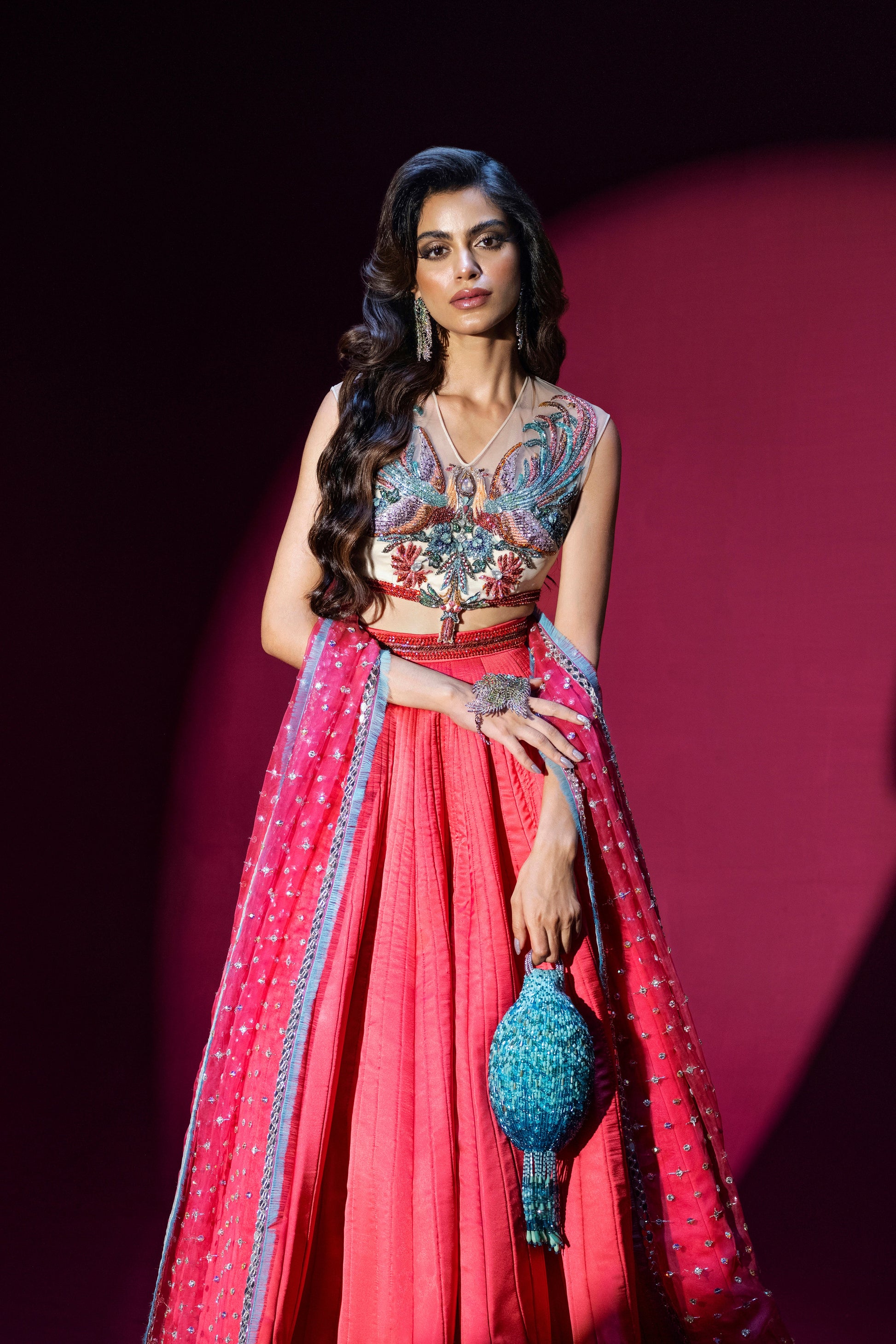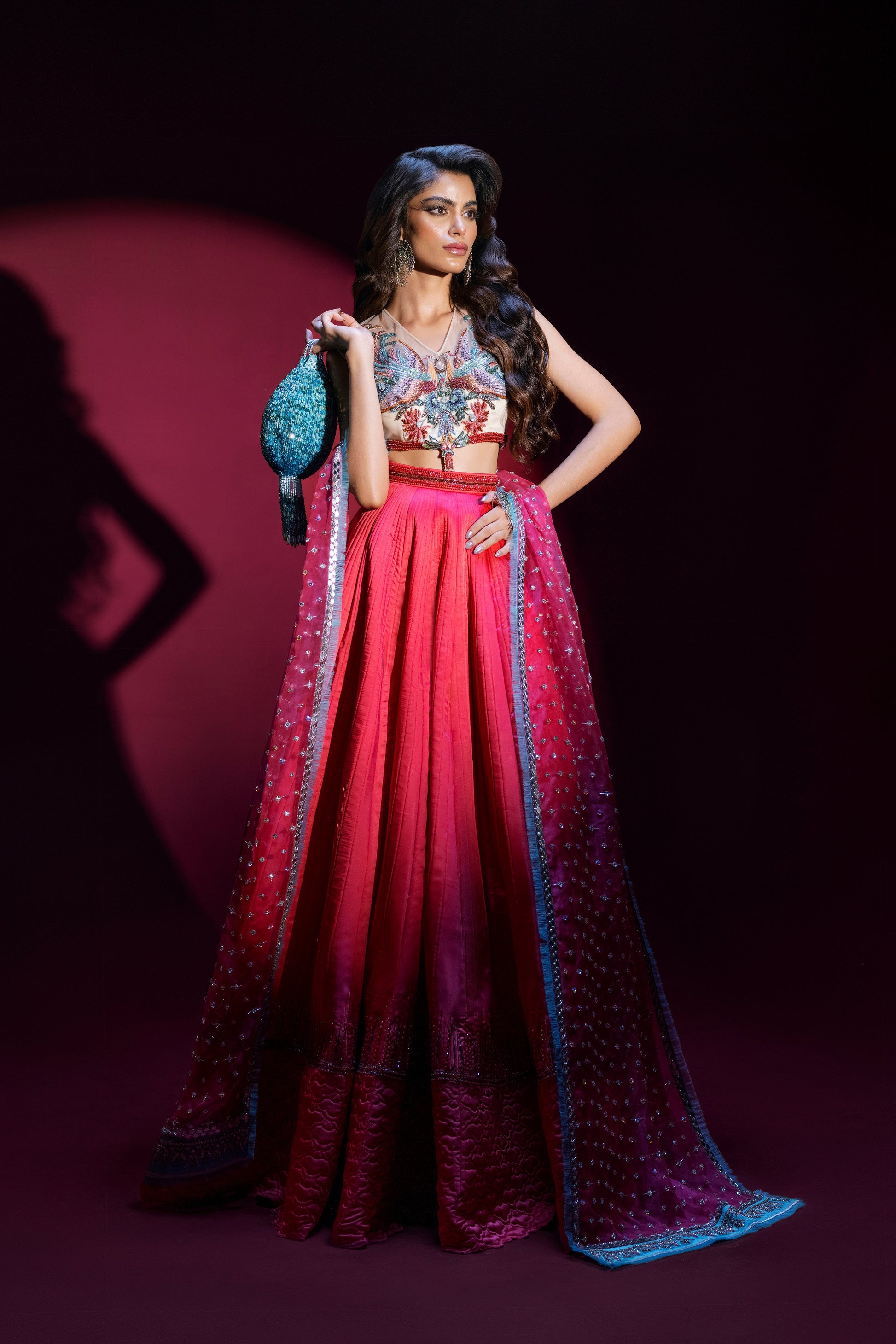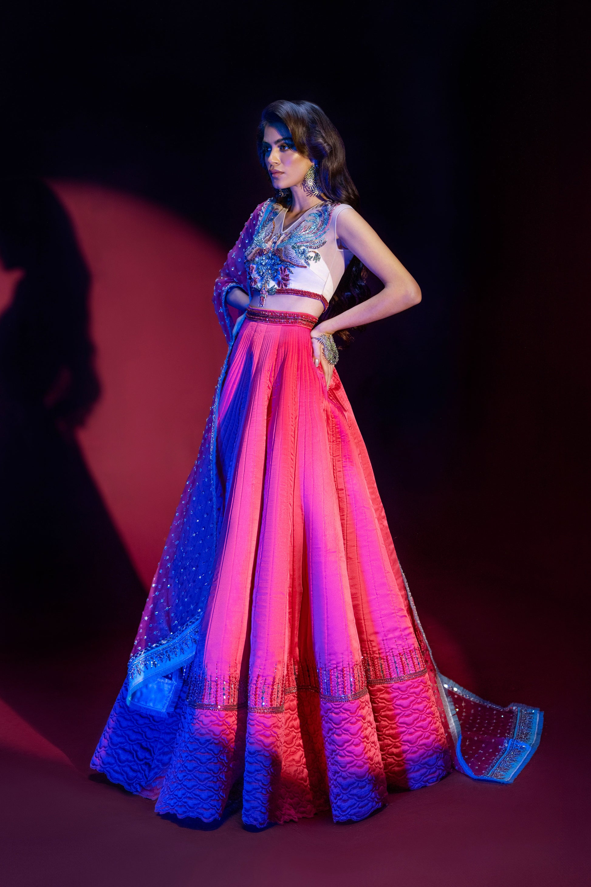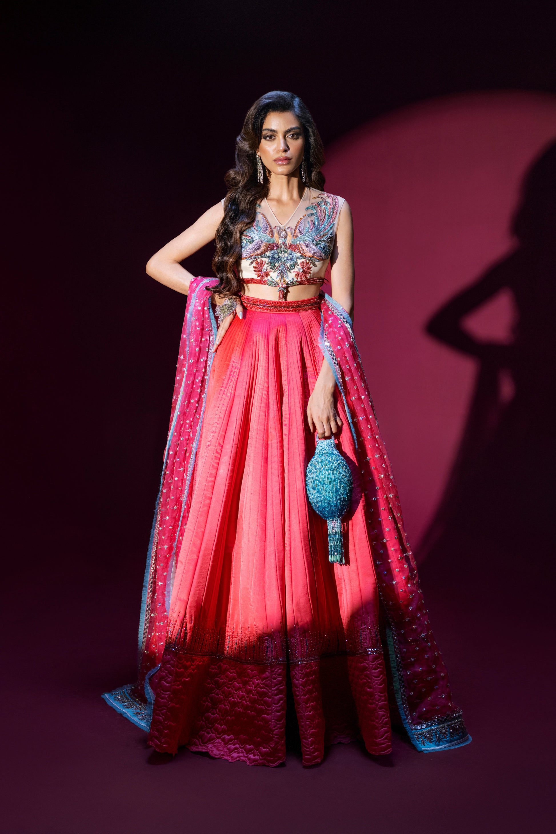What can be more high-spirited than a hot pink quilted silk lehenga, a multi-coloured choli and a blingy narrow tulle dupatta? Exquisite hand-crafted details in shaded Kat Dana, crystals and sequins sparkle away creating an absolute head turner.