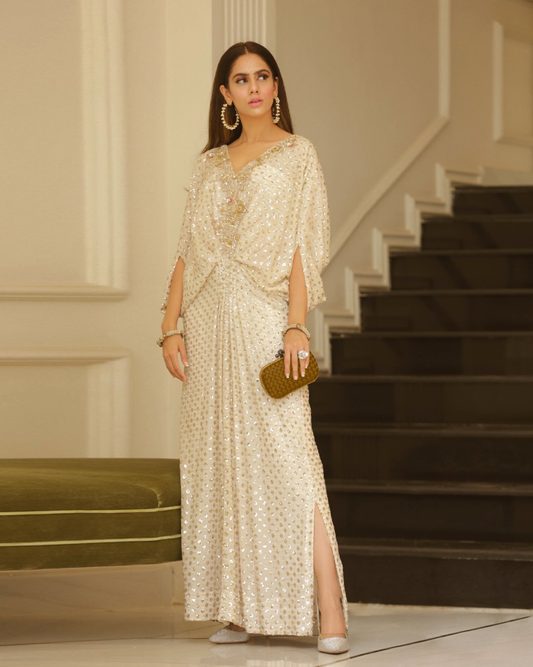 A feminine silhouette featuring a luxuriously handmade neckline. Dazzle your way through a sunlit affair or an evening soirée in this chikankari kaftaan that is artfully embellished to add the right sheen.