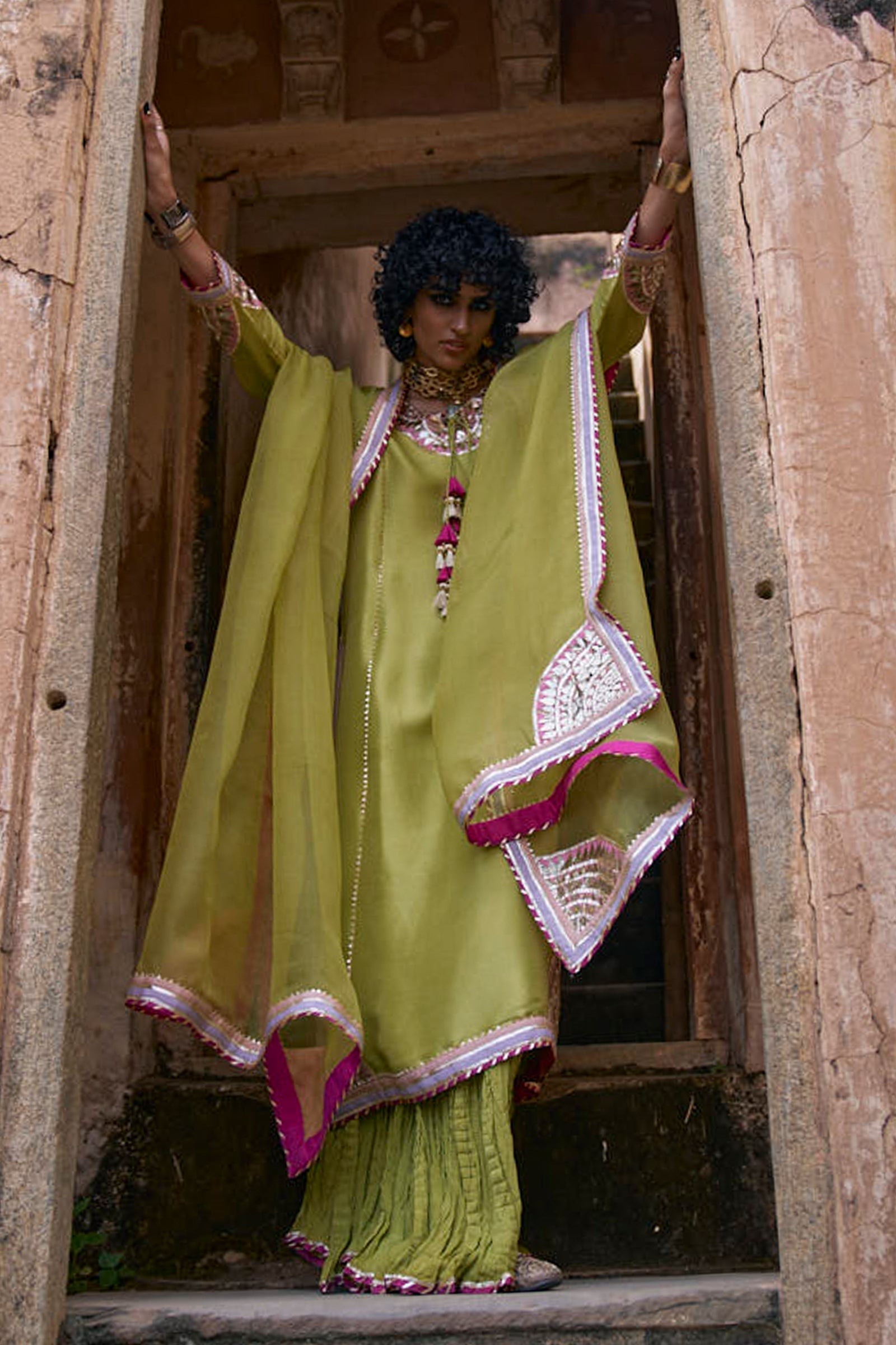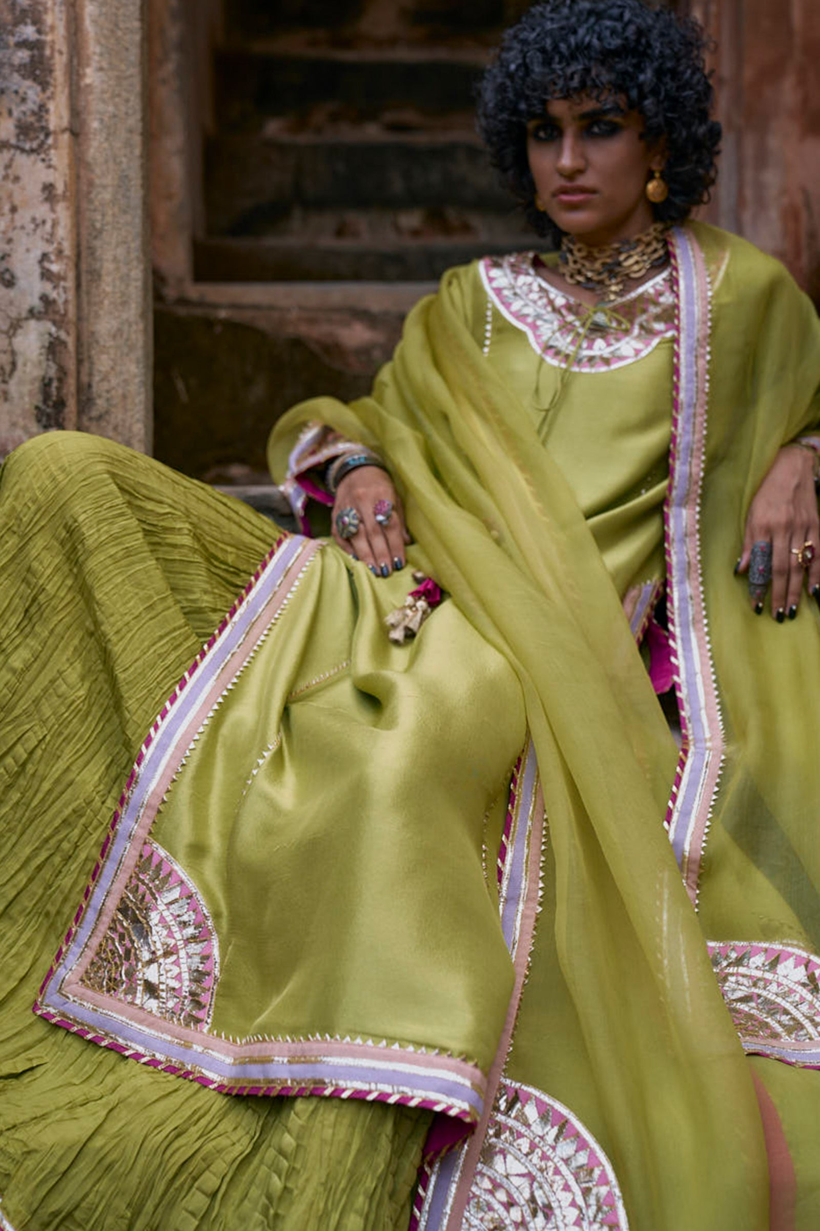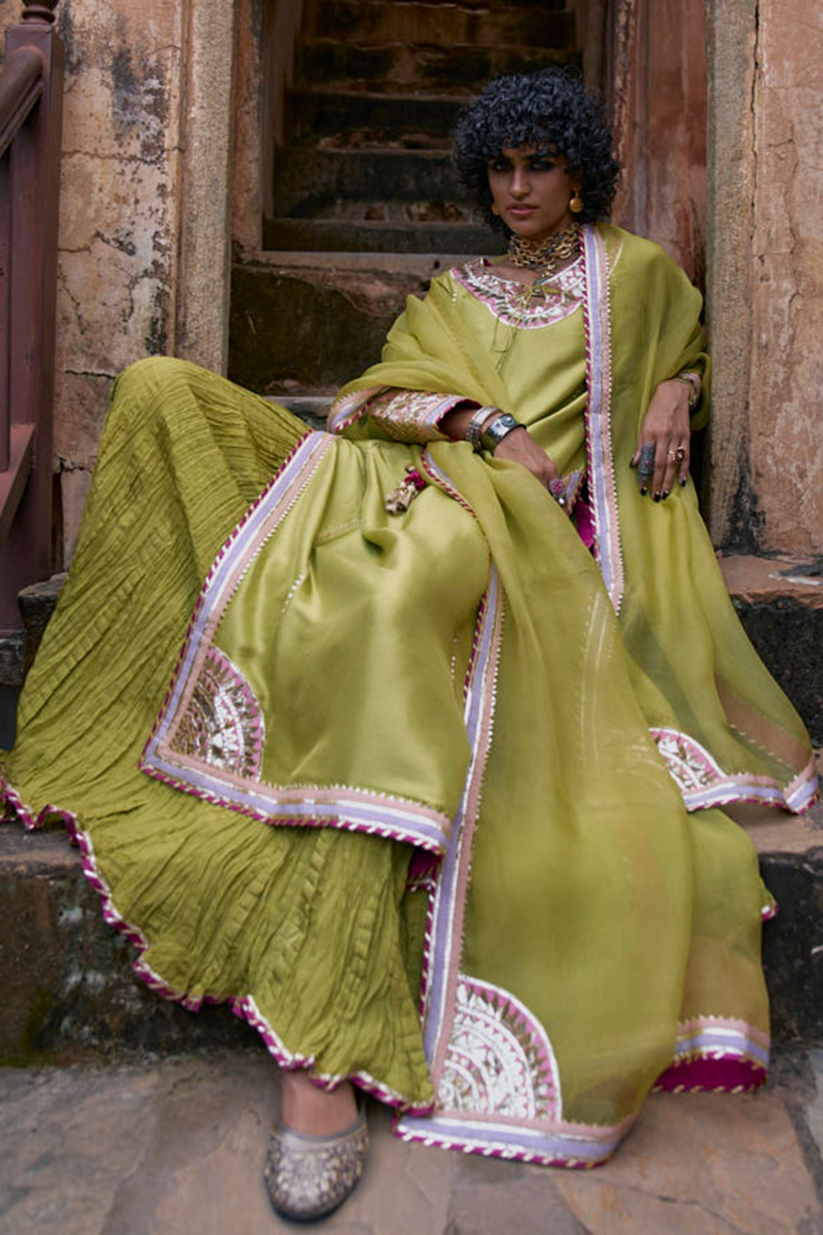 Dupatta: Parrot green pure organza dupatta with four side applique and gota work along with gota work on 4 corners
