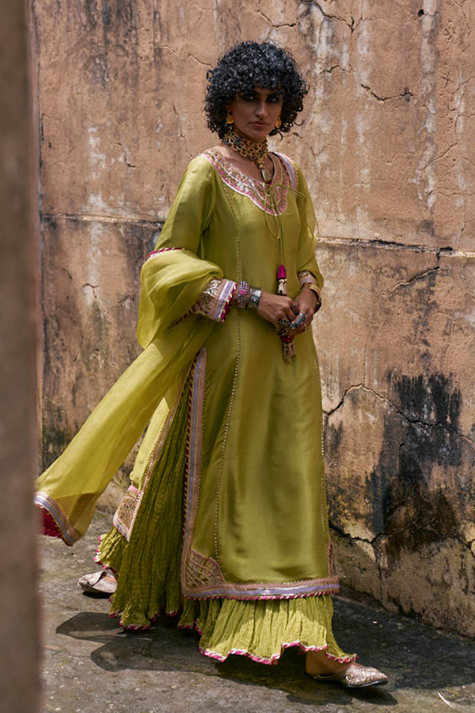 Shirt: Parrot green pure raw silk shirt with applique and gota work