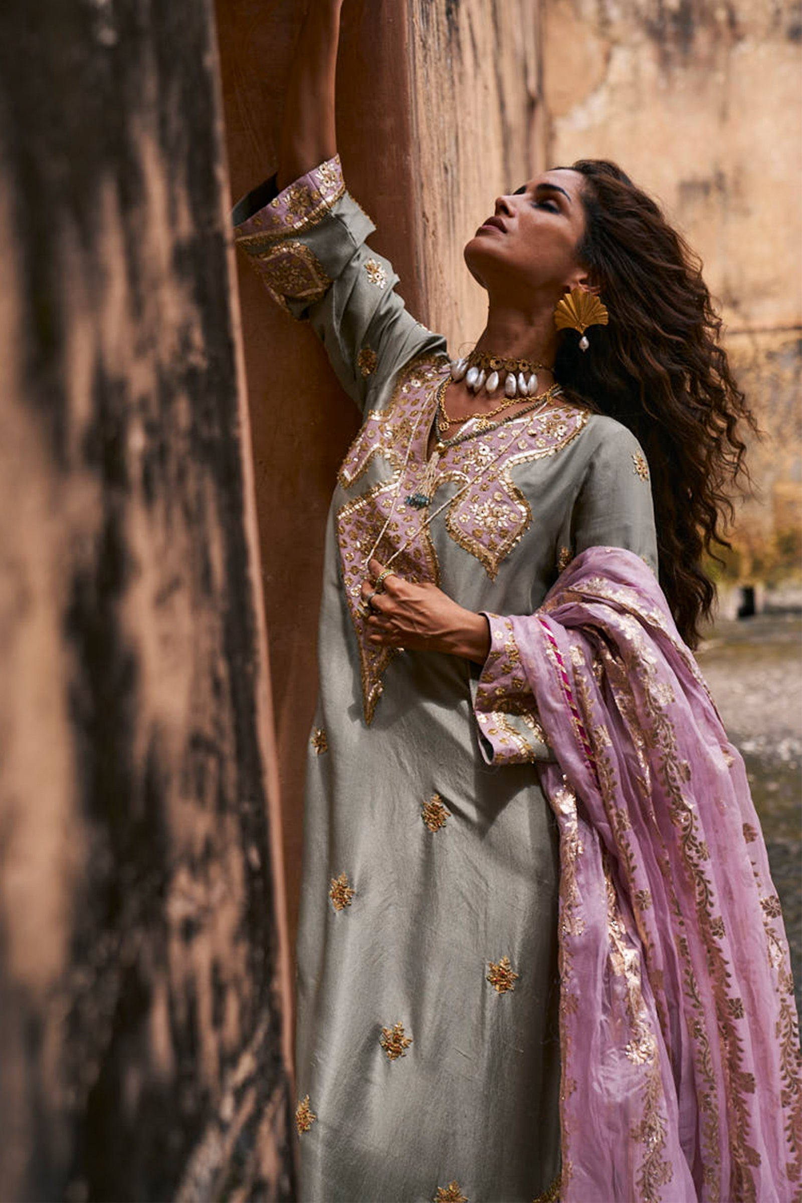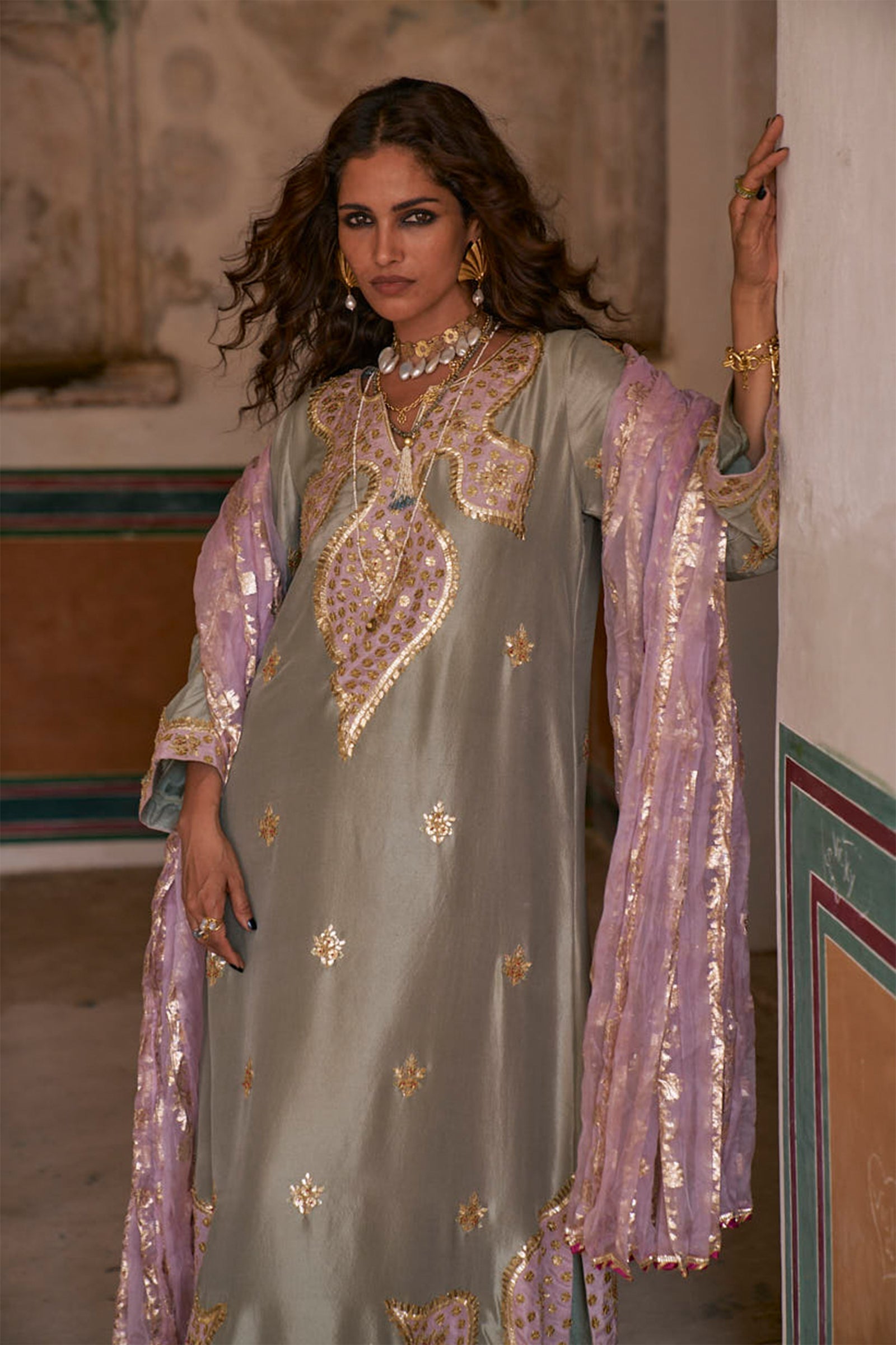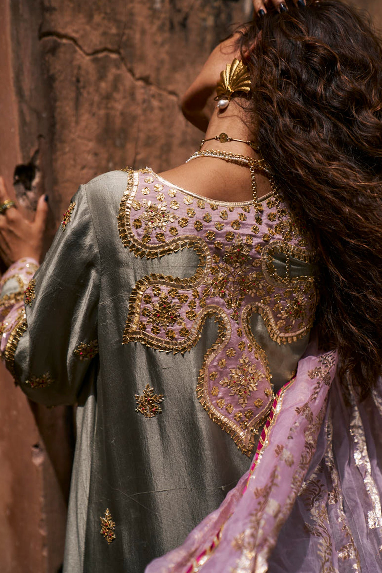 Shirt: Mint green pure raw silk shirt with mauve applique and gota work with small side slits