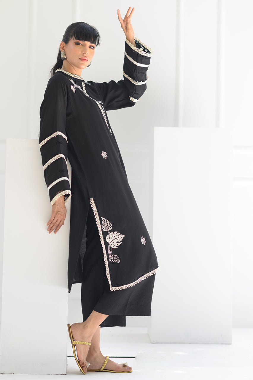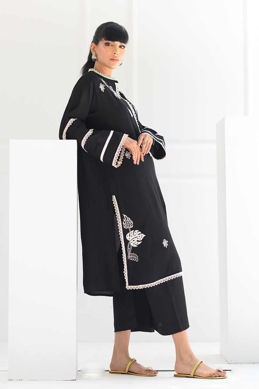 A classic silhouette and soft textures set a refined new look. This cotton net shirt has delicate resham embroideries, signature cutwork and lace trimmings for a chic look. Complete the look with our matching culottes.