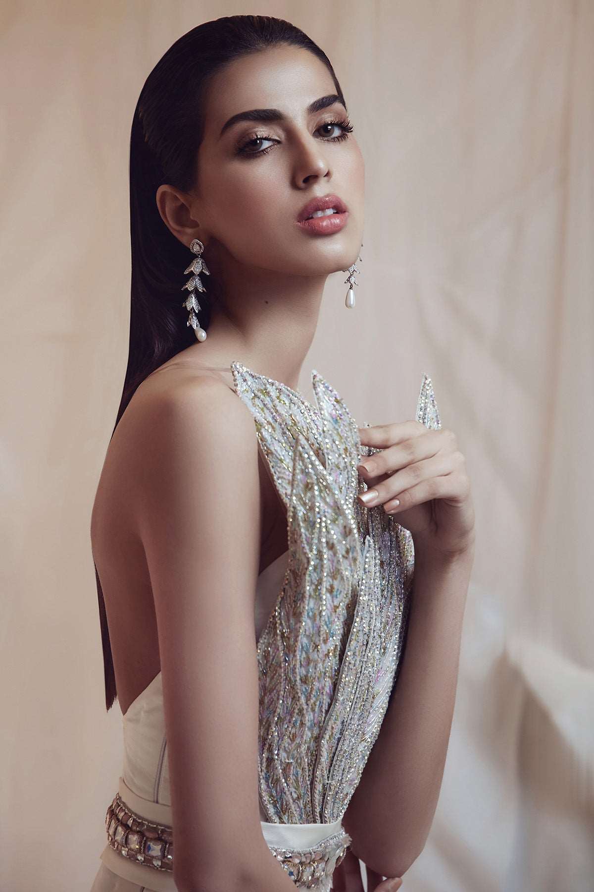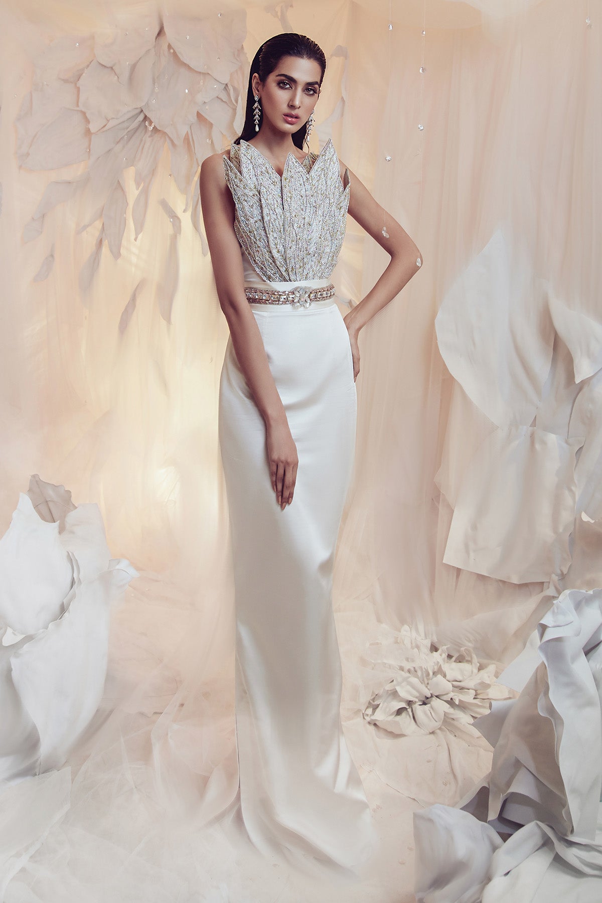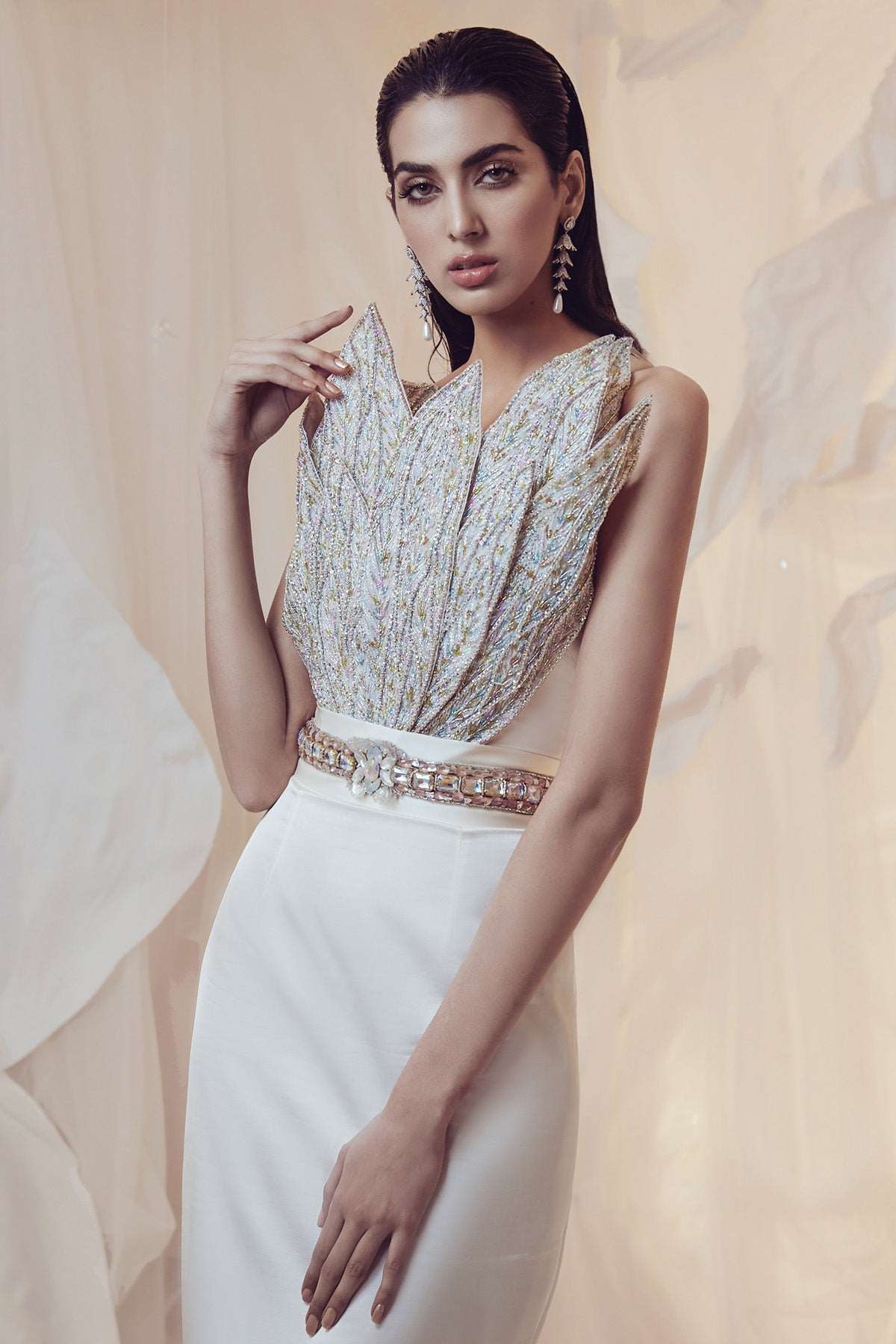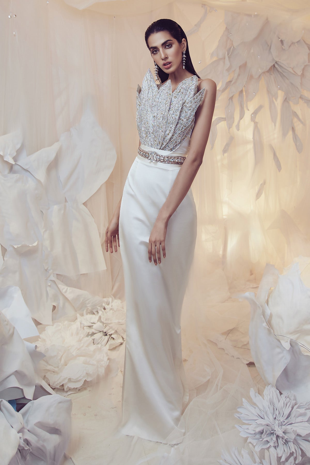 A layered petal dress laden with exquisitely shaded glass beads and heaven crystals. It comes with a bejewelled belt wrapped in soft hued tulle.