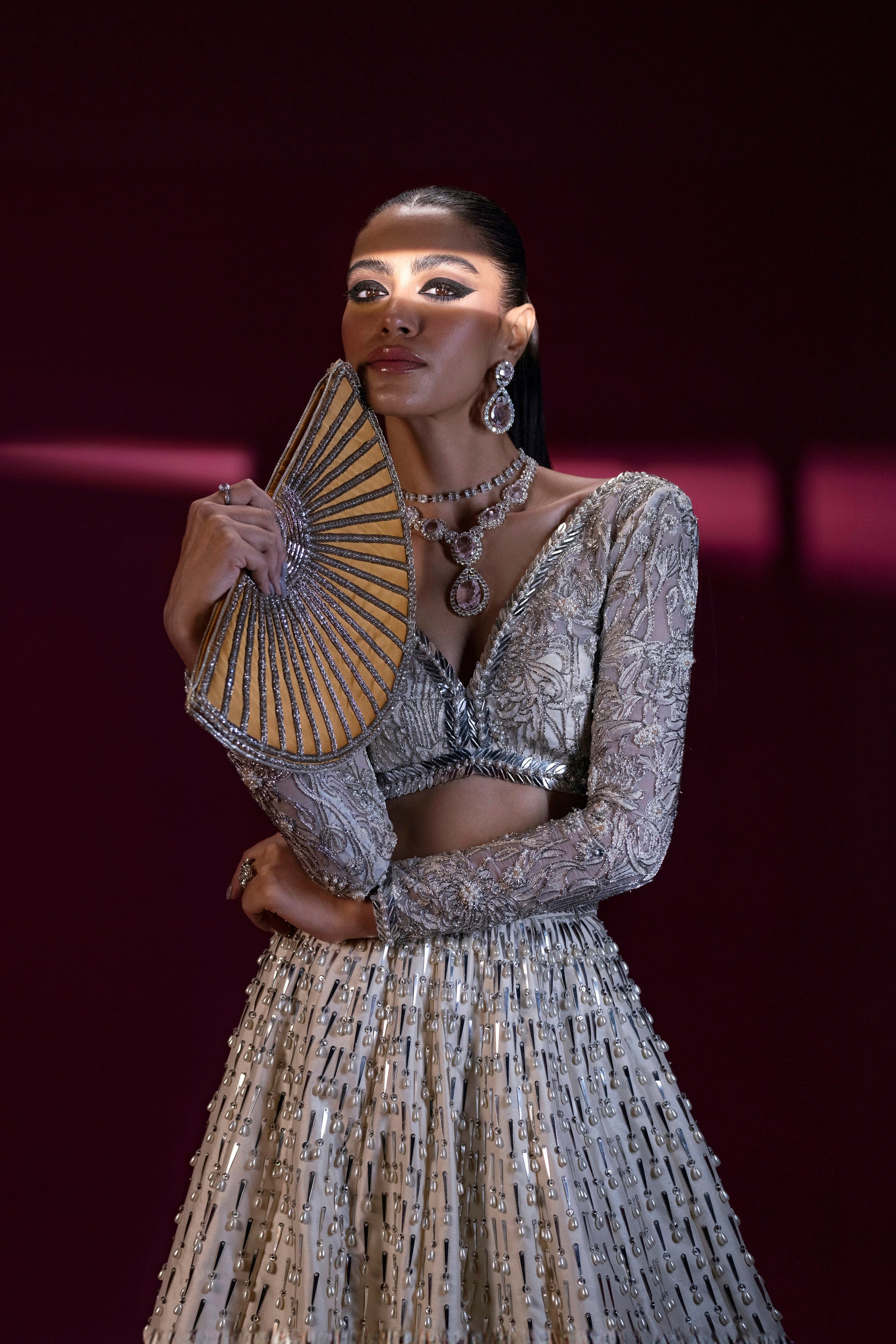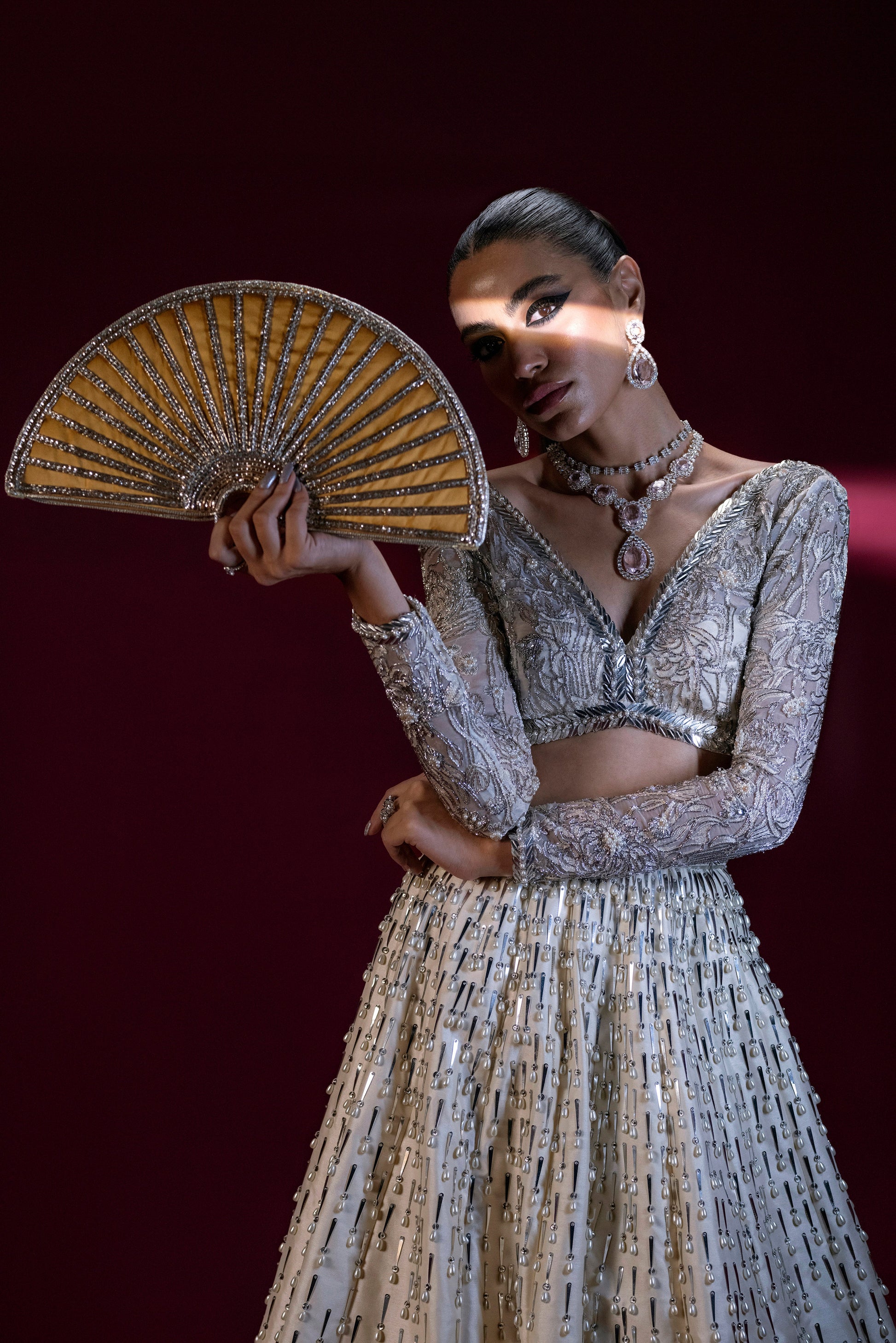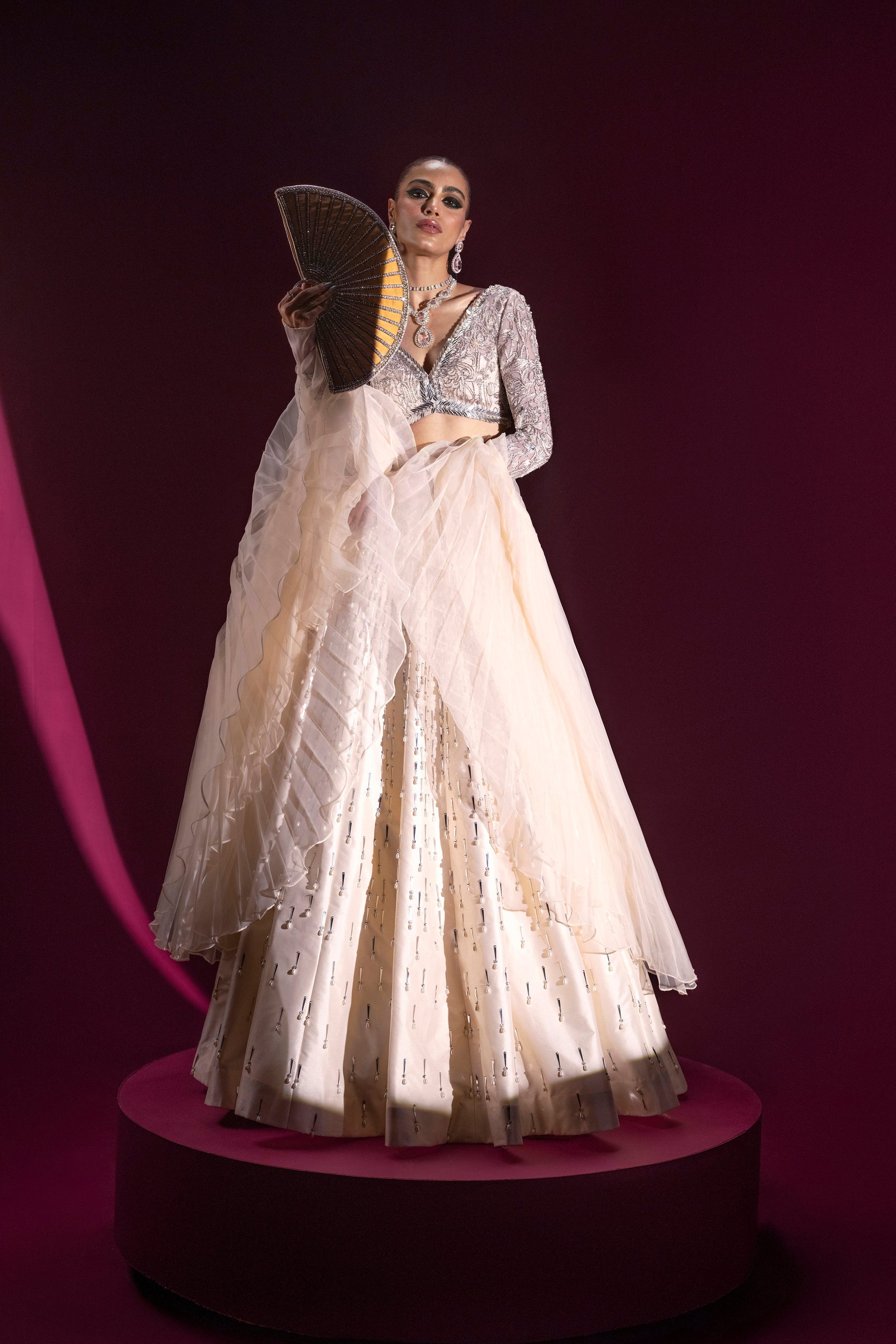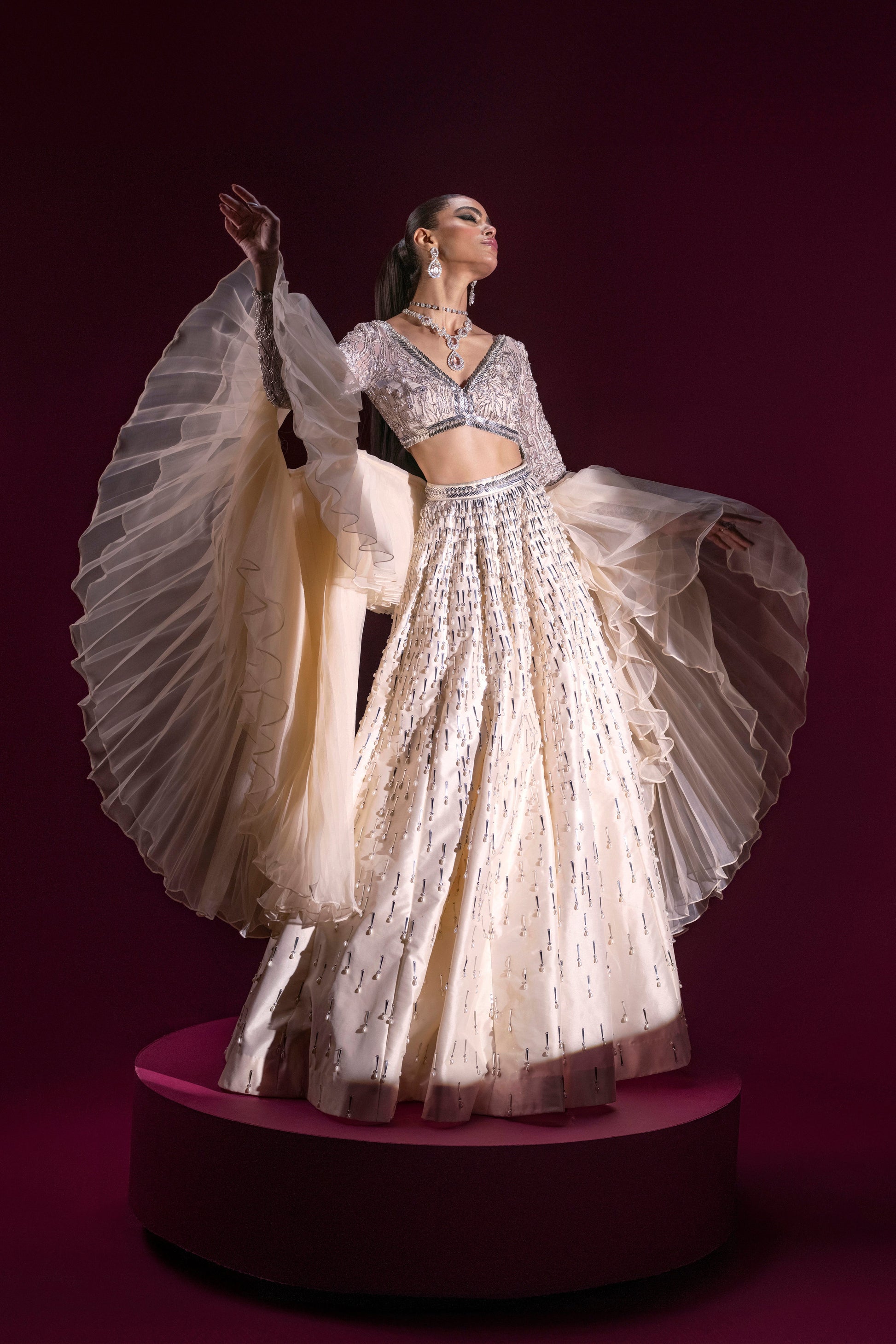 Sparkle like a diamond in an ivory panelled lehenga, floral choli and pleated swan-cut dupatta. Bedazzling details completely hand-worked with crystals, pearls, sequins and naqshi create an exotic look, an absolute statement for the season.