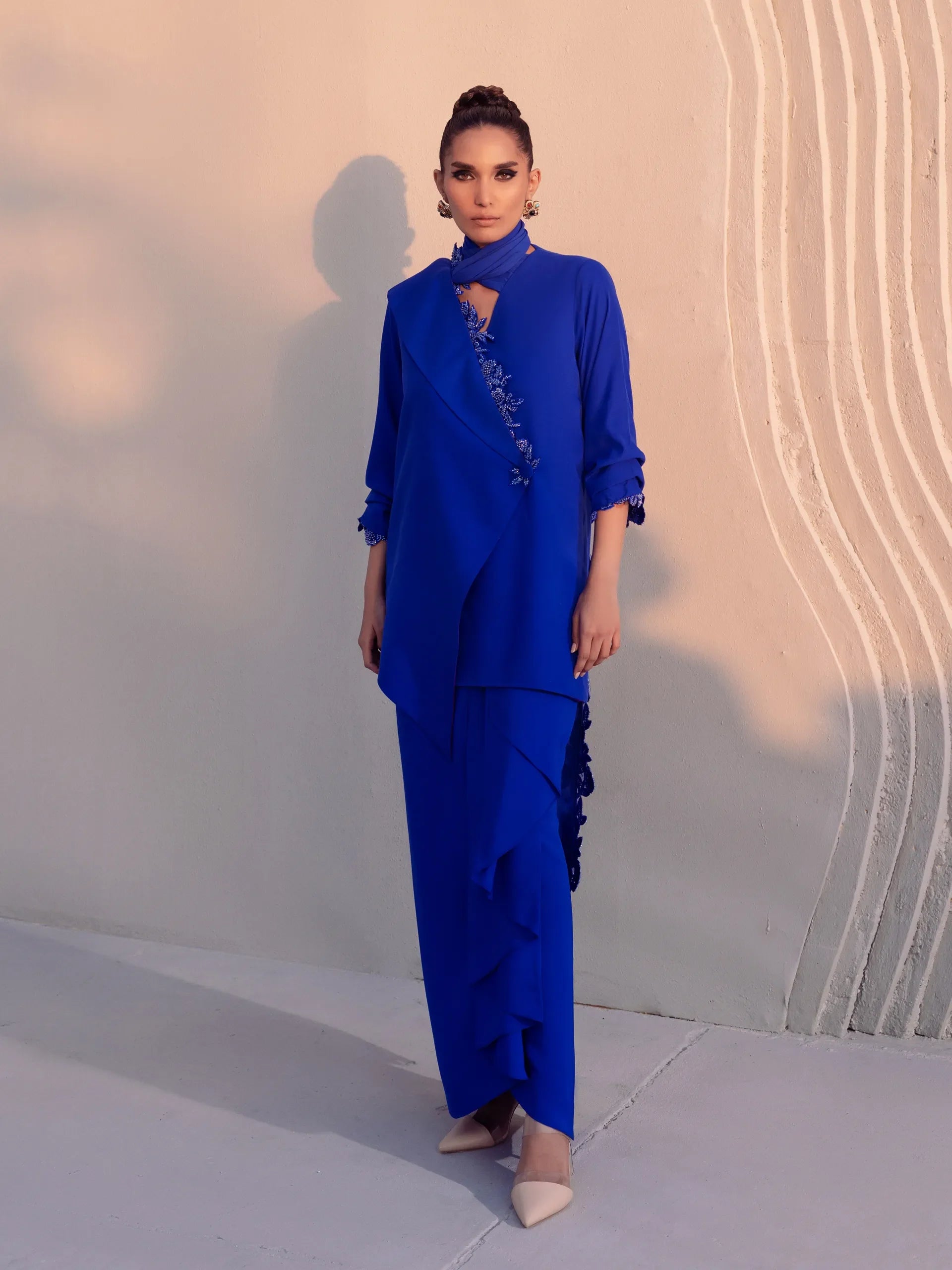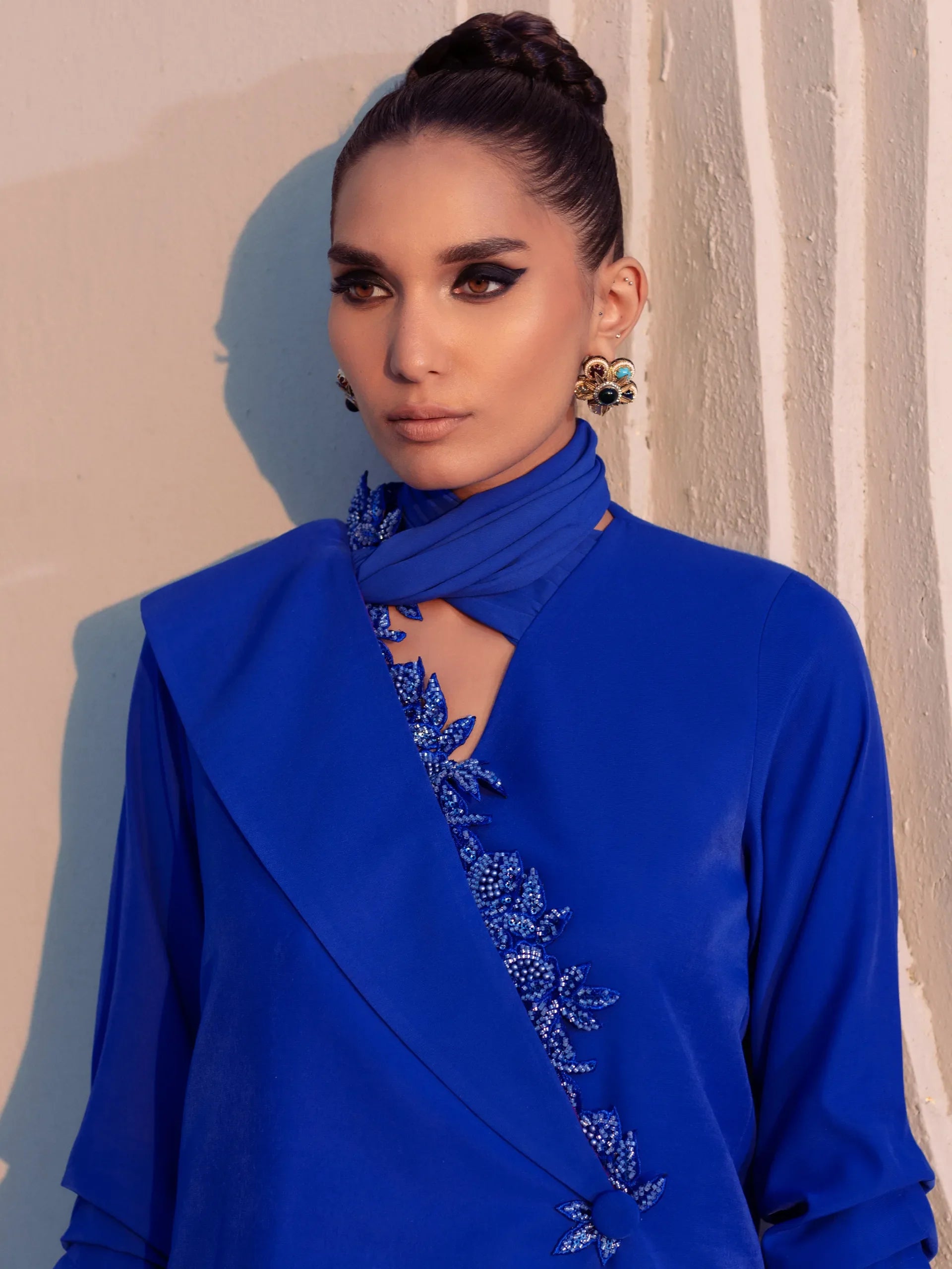 - Ink blue structured top with purple lining and appliqué attached with thin mix crepe scarf