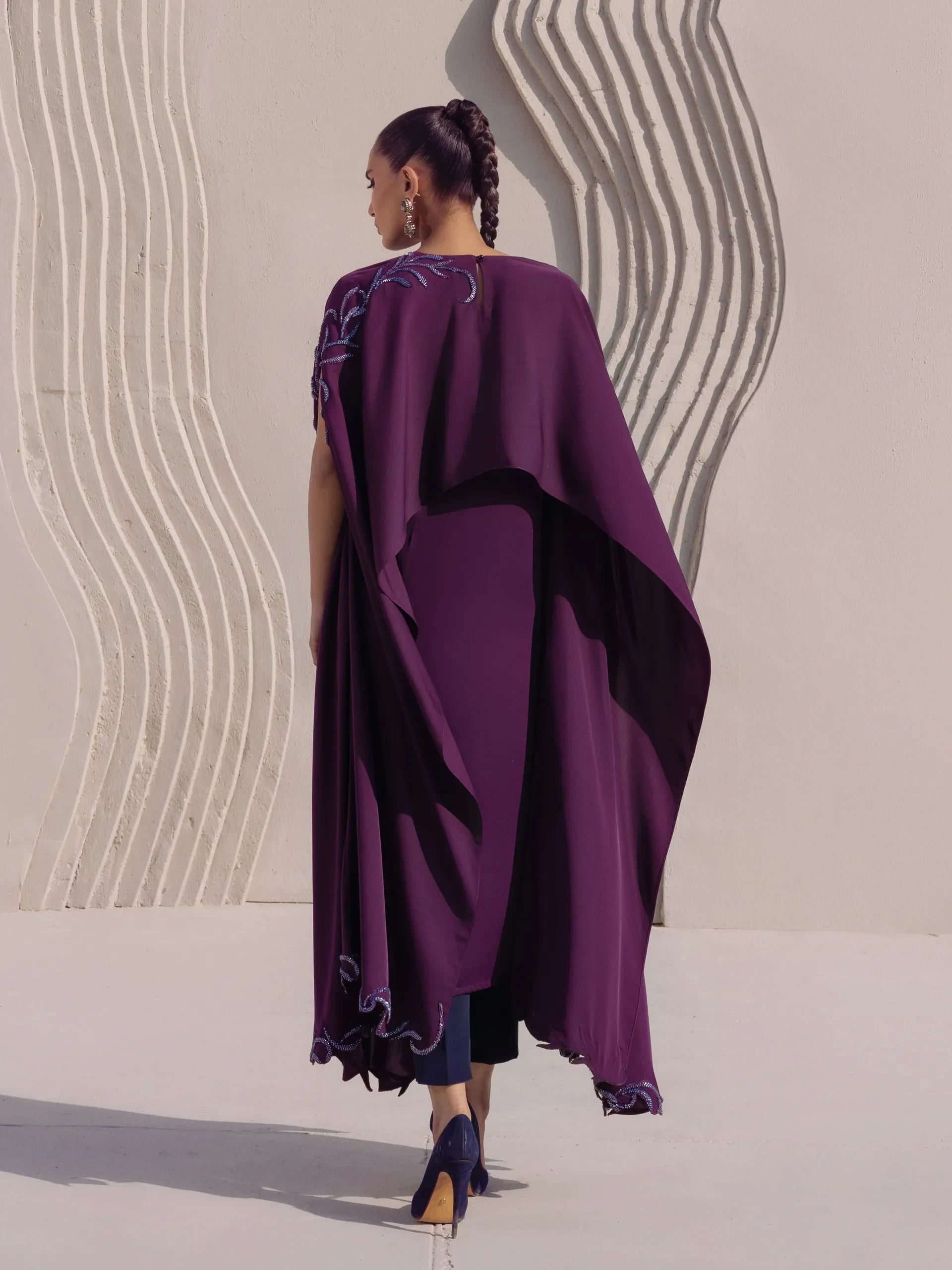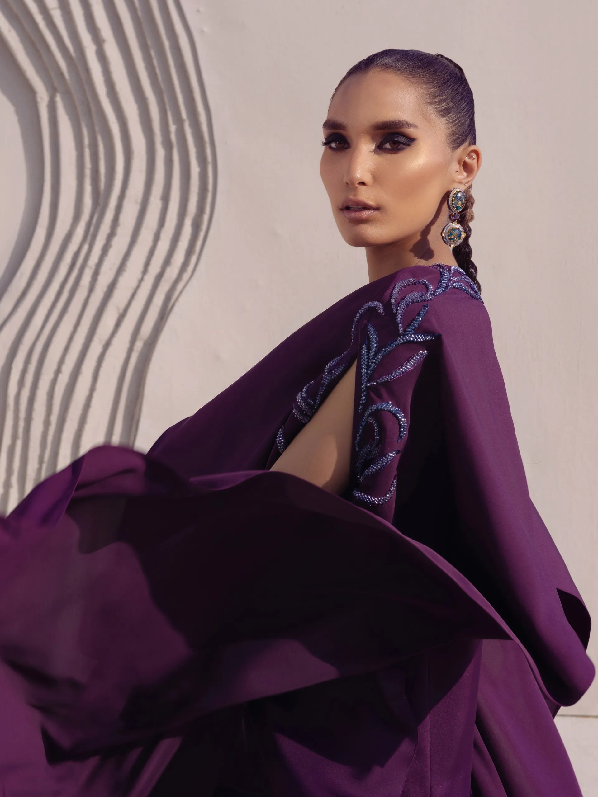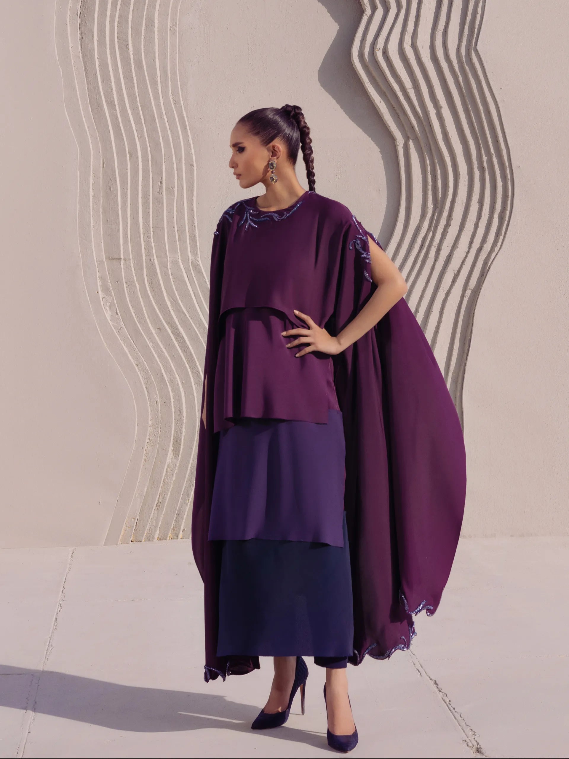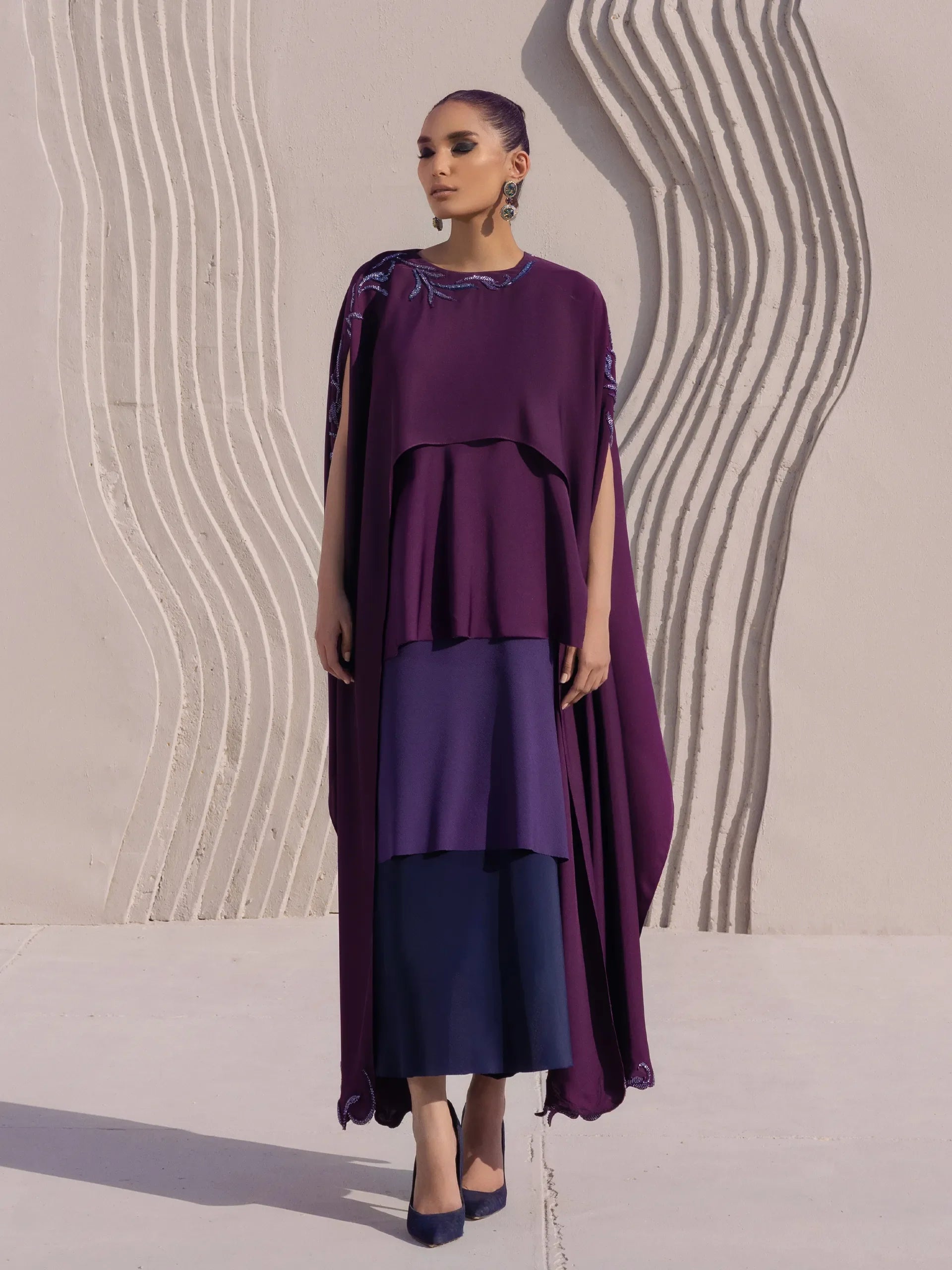 - Purple fully appliquéd cape attached with shades of purple and blue long slip