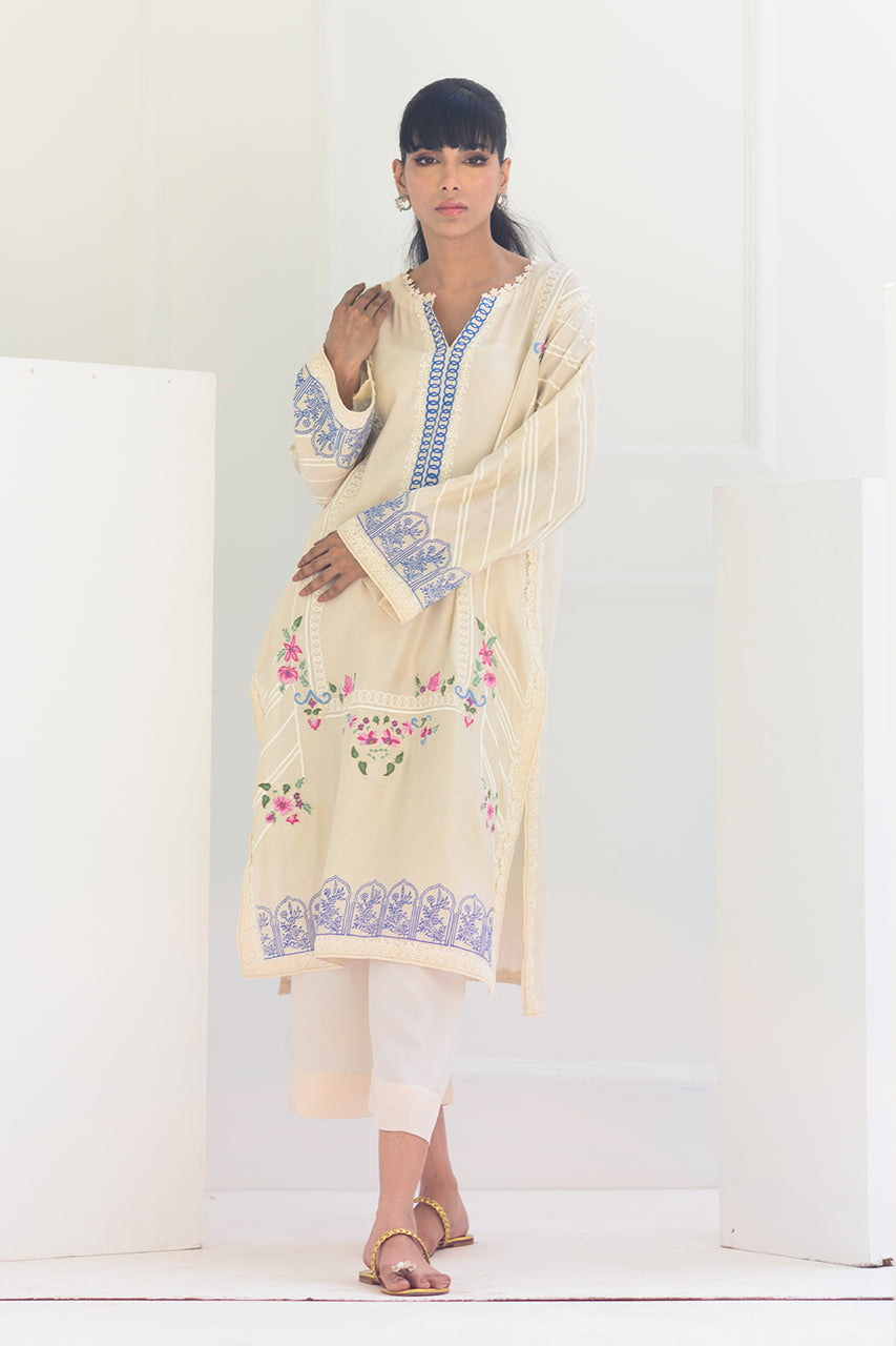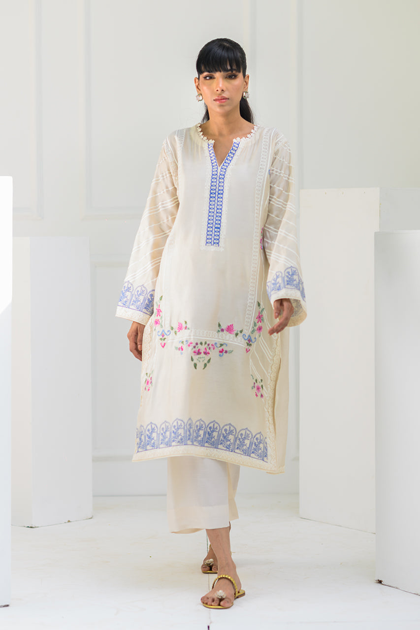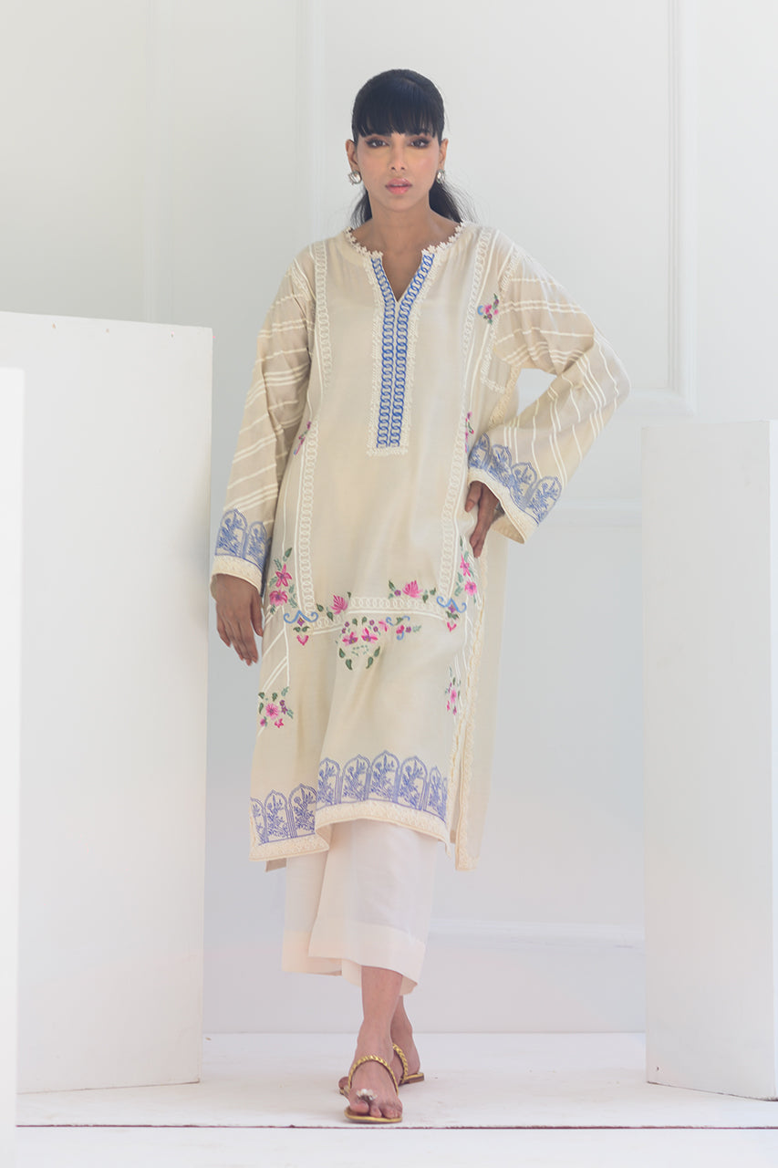 Introducing our luxurious 'Ivory Affair' outfit, made in pure cotton net in a stunning ivory hue. This exquisite design is replete with block print, embroidery and finished with lace details. Pair it with matching culottes to complete the look.
