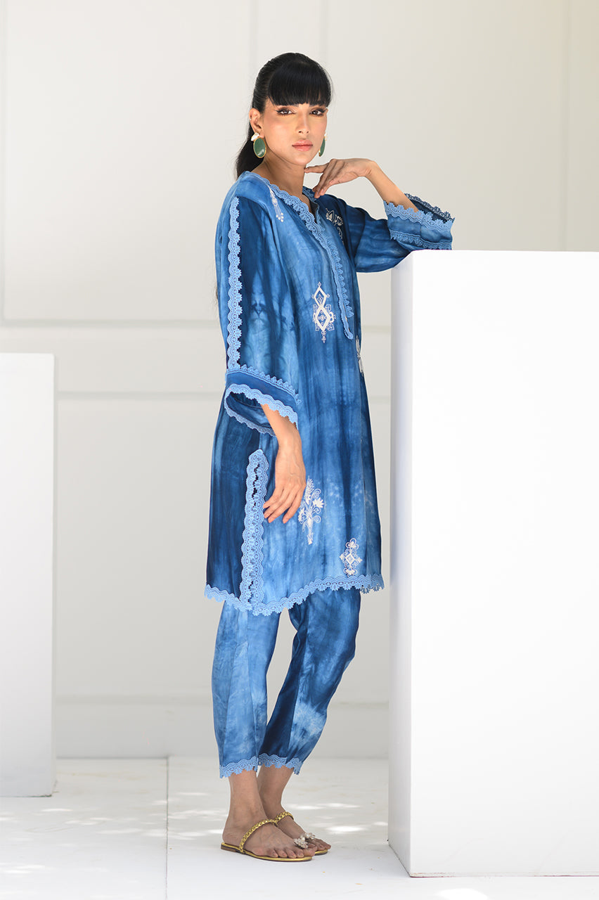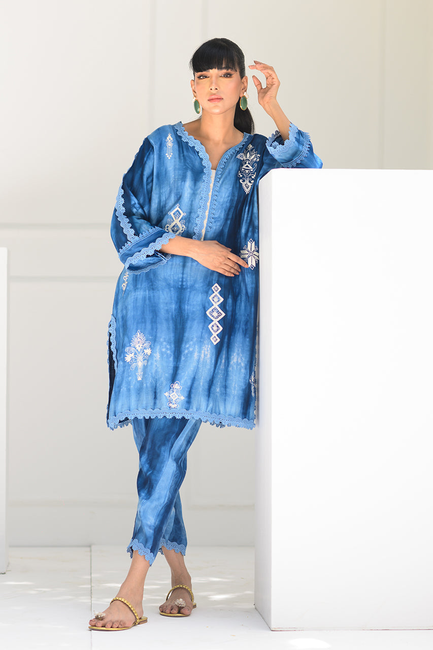 Make a statement in our cotton net tye and dye shirt with intriguing lace details. The kurta is highlighted with embroidered motives along the shirt front. Pair it with a matching pant shalwar and add a touch of perfect elegance to the outfit.