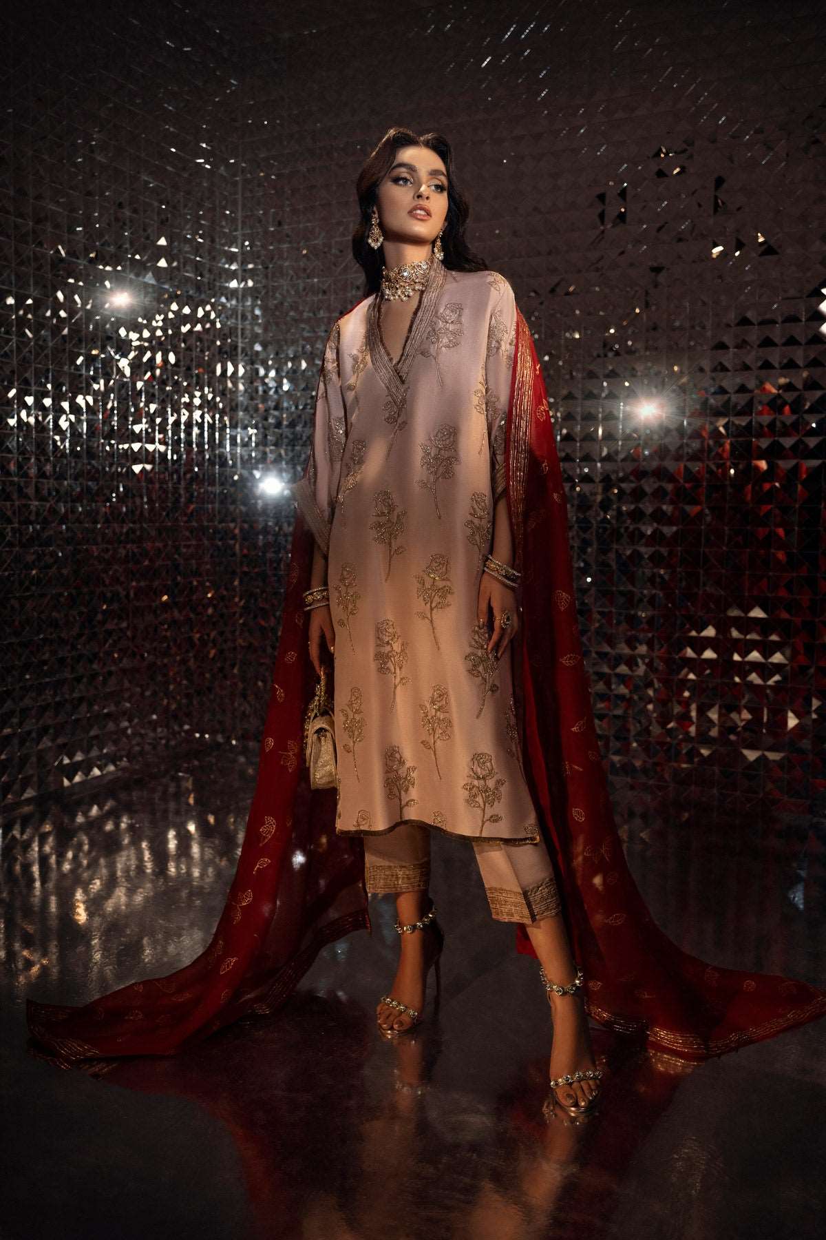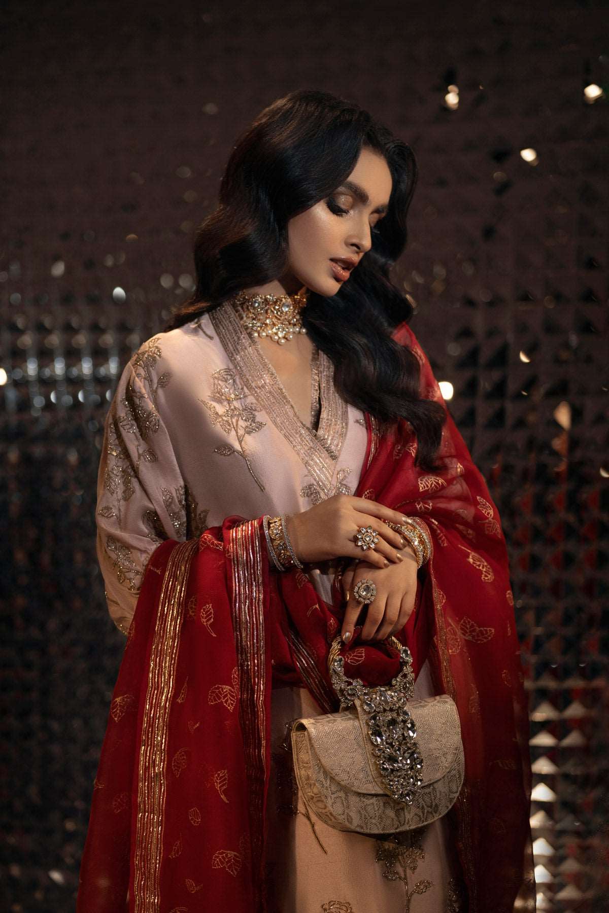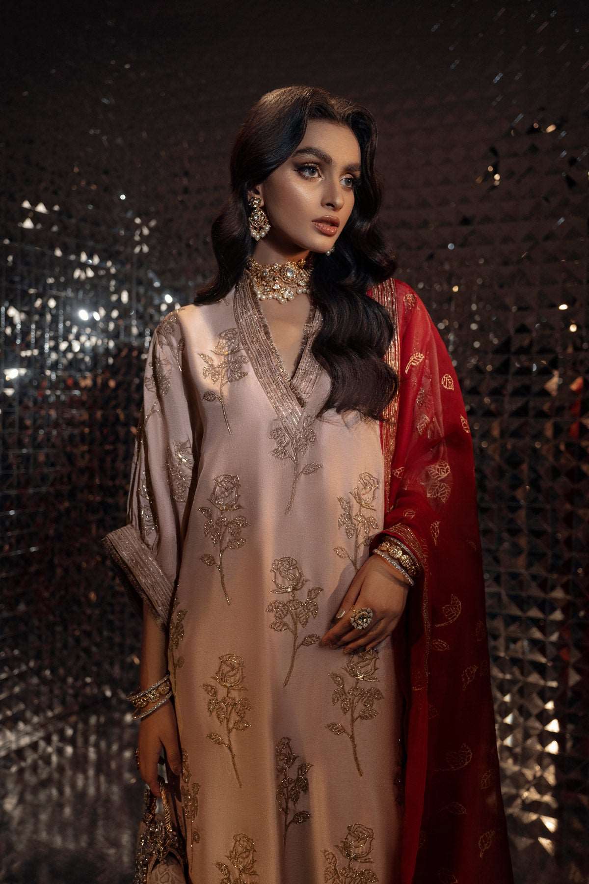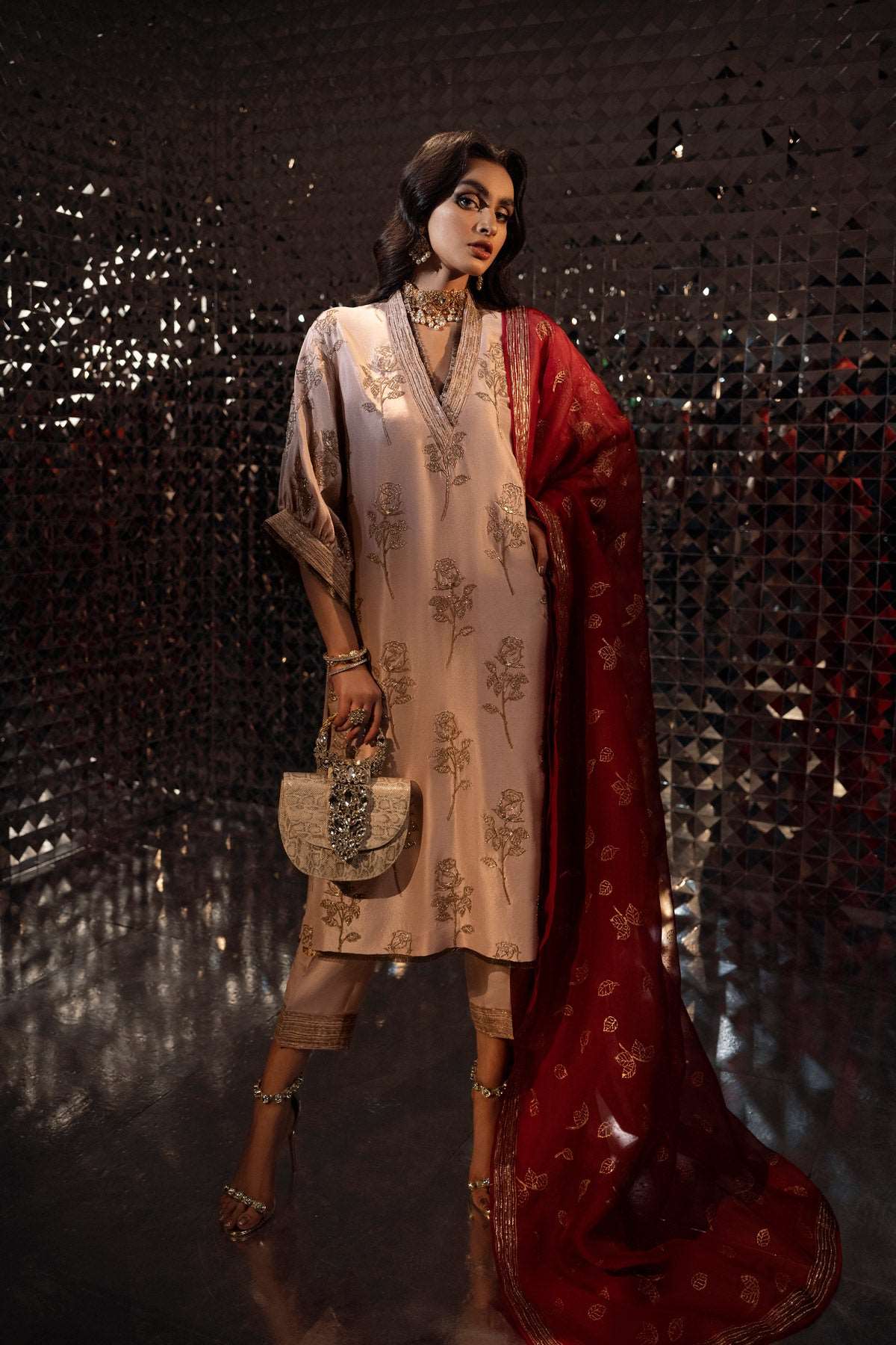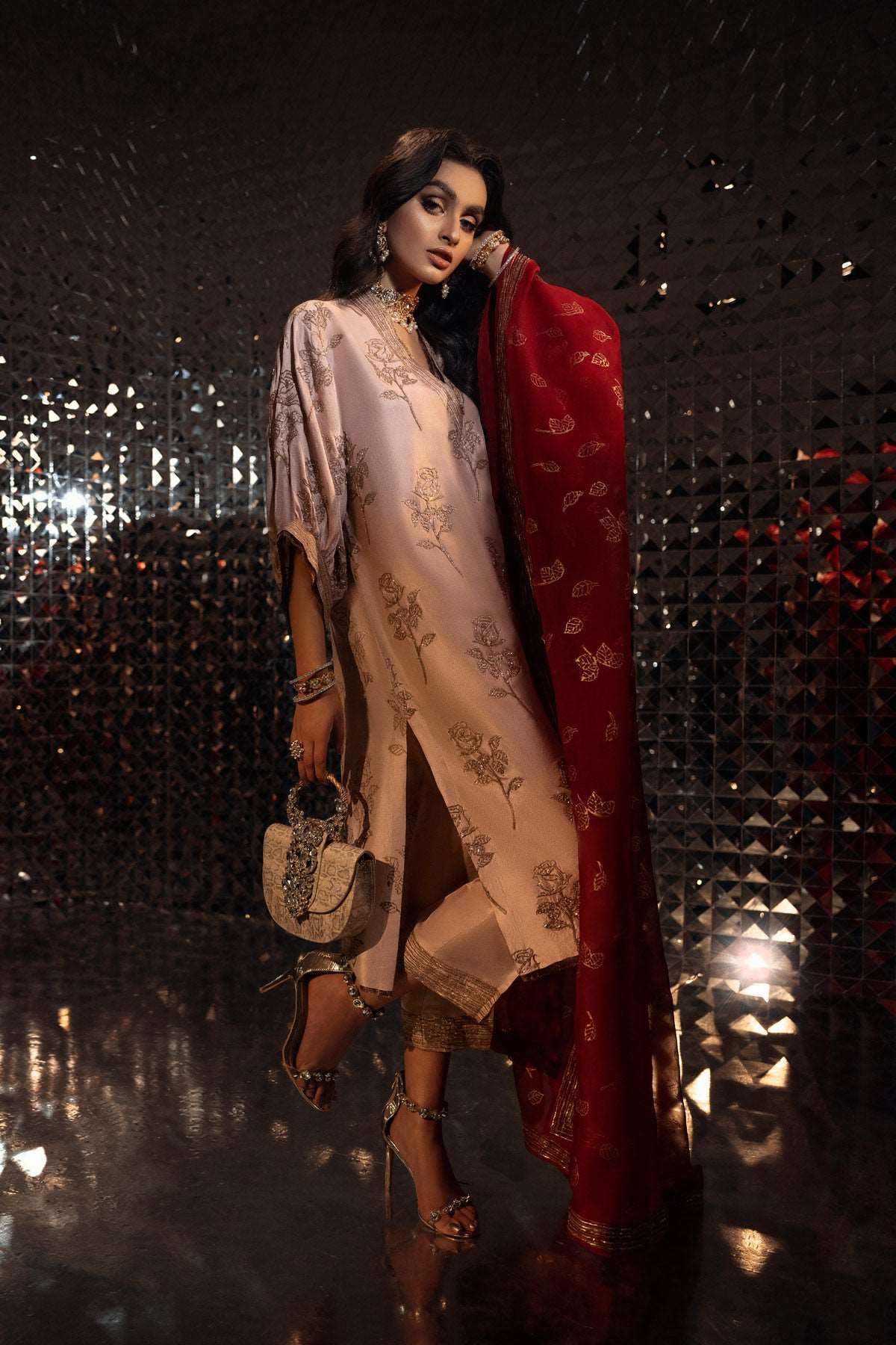 Beautifully composed gold roses, block printed on to a lush silk kurta. Delicately hand embellished, with glass cut beads and gold wirework embroidery. Paired with a cherry red dupatta that perfectly compliments the look.