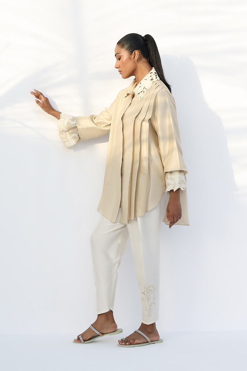 An effortlessly refined look in a serene ivory and champagne tone. The relaxed, button-down shirt in pure Raw Silk features an oversized silhouette with a scalloped cutwork collar and cuffs trimmed with applique and resham embellishment, lending a touch of soft romance. Paired with pure Raw Silk tapered shalwar detailed with sand-hued applique embroidery along the hem, the ensemble strikes the perfect balance between contemporary ease and quiet sophistication.