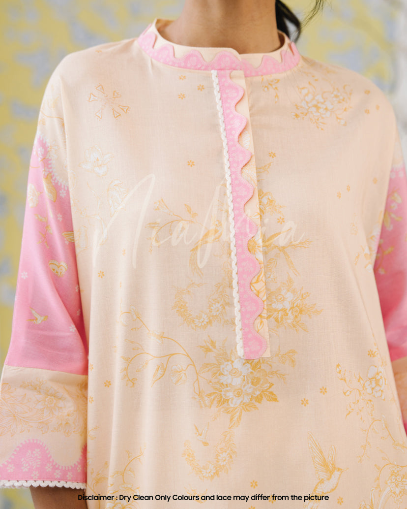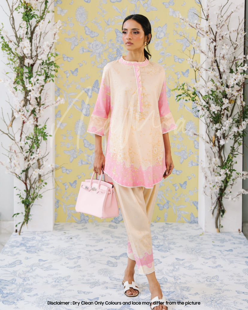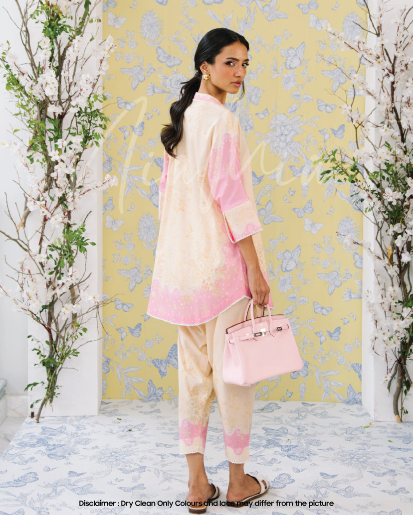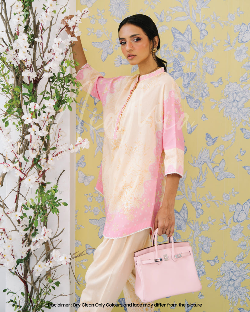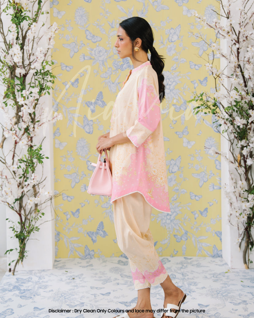 The kurta features a high rounded neckline with delicate button detailing, leading into an enchanting print that gently transitions from light floral sprays to a scalloped pink border with ornamental accents.