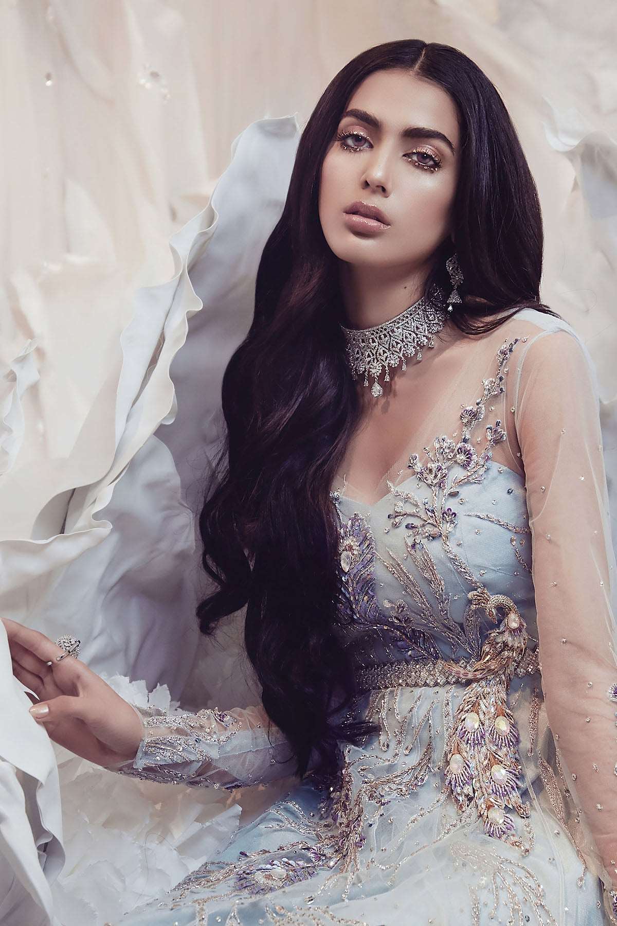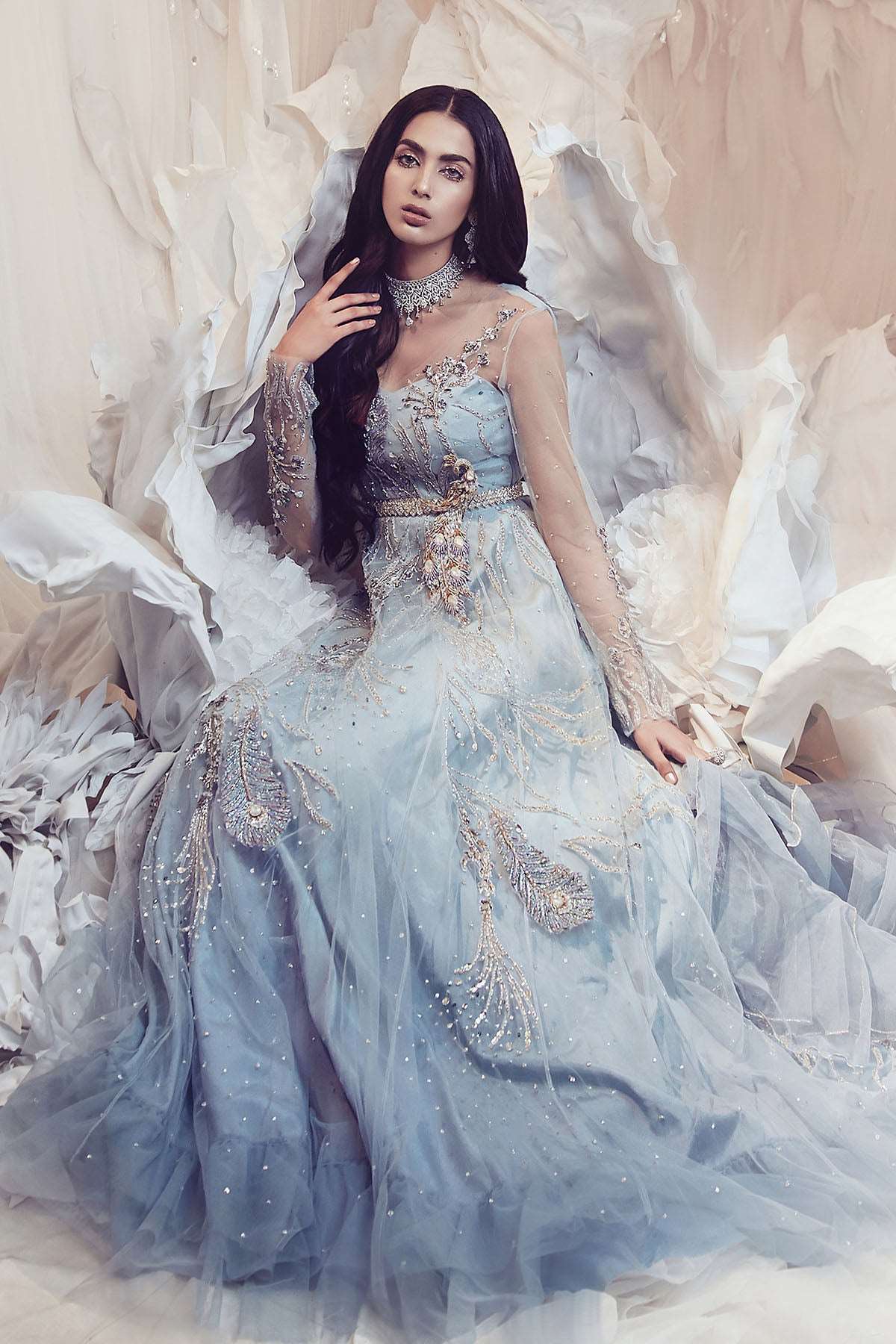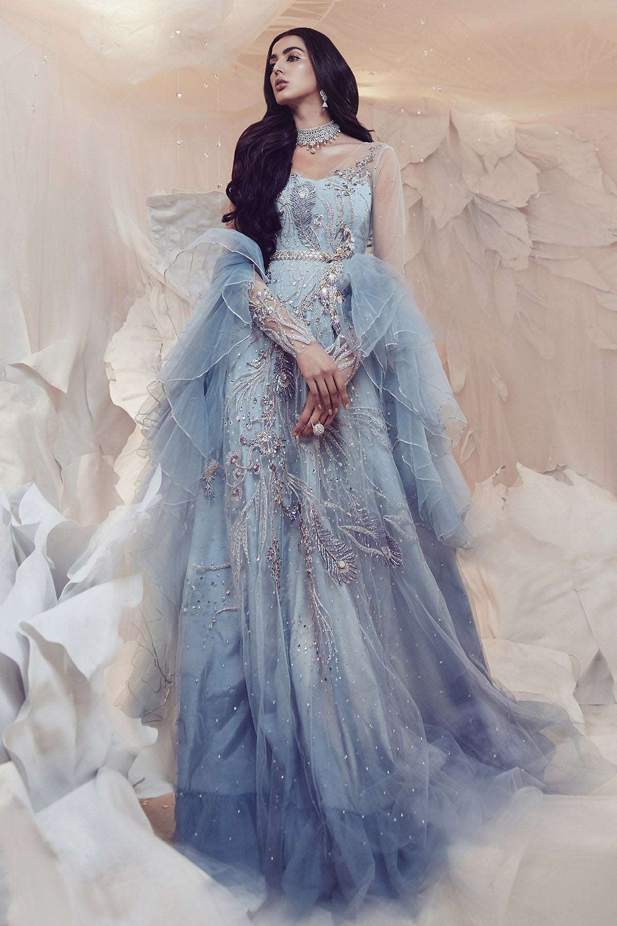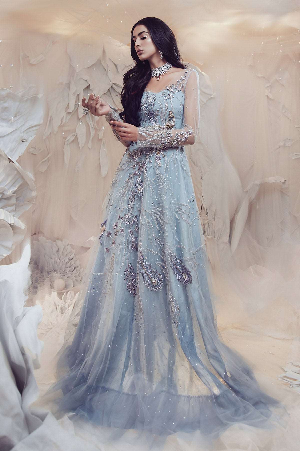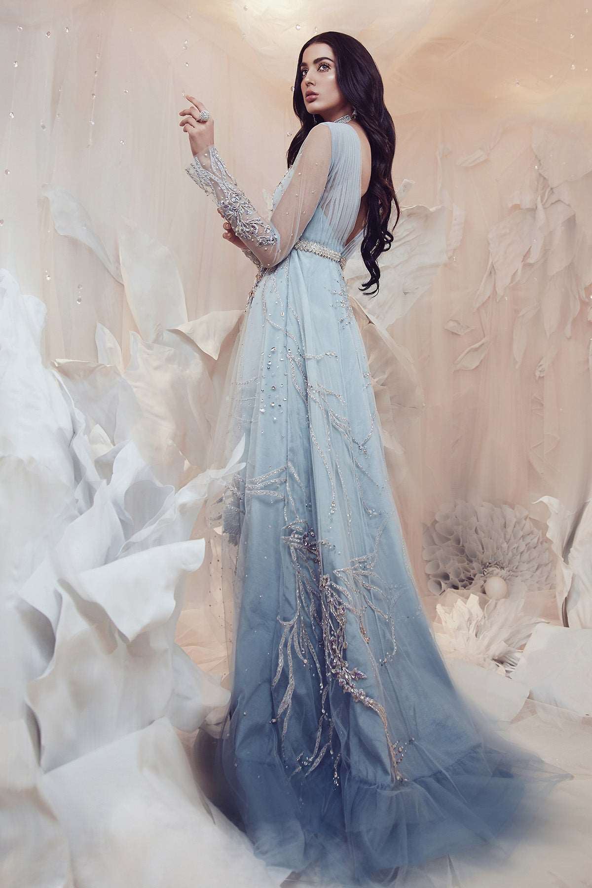An exquisite dress laden with crystals, glass beads and stones. It comes with a bejewelled peacock belt with heaven crystals and glass bead. It also has a broached ruffle stole.