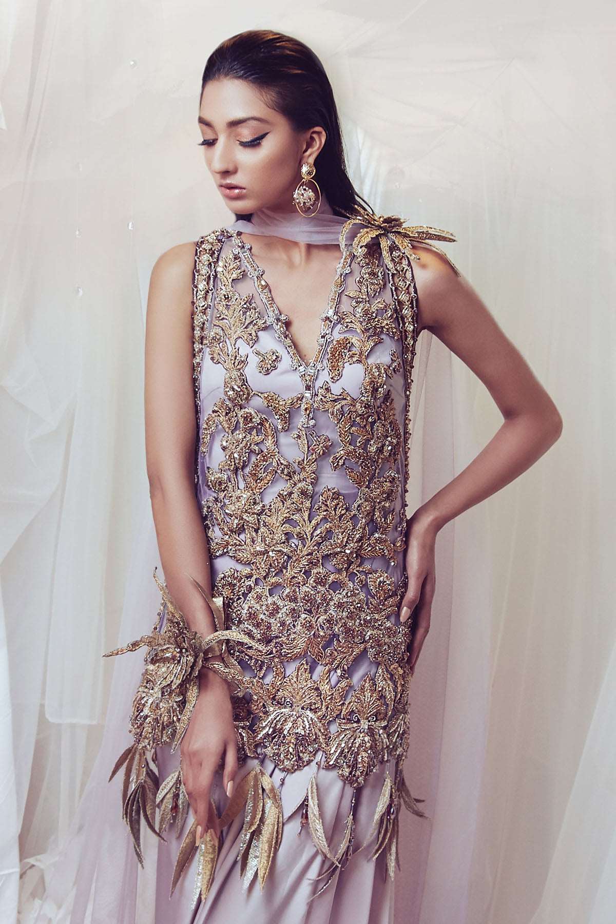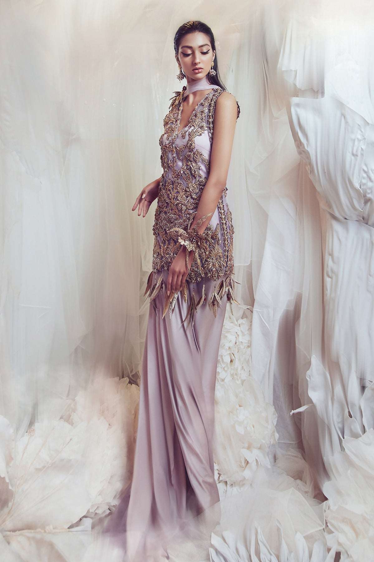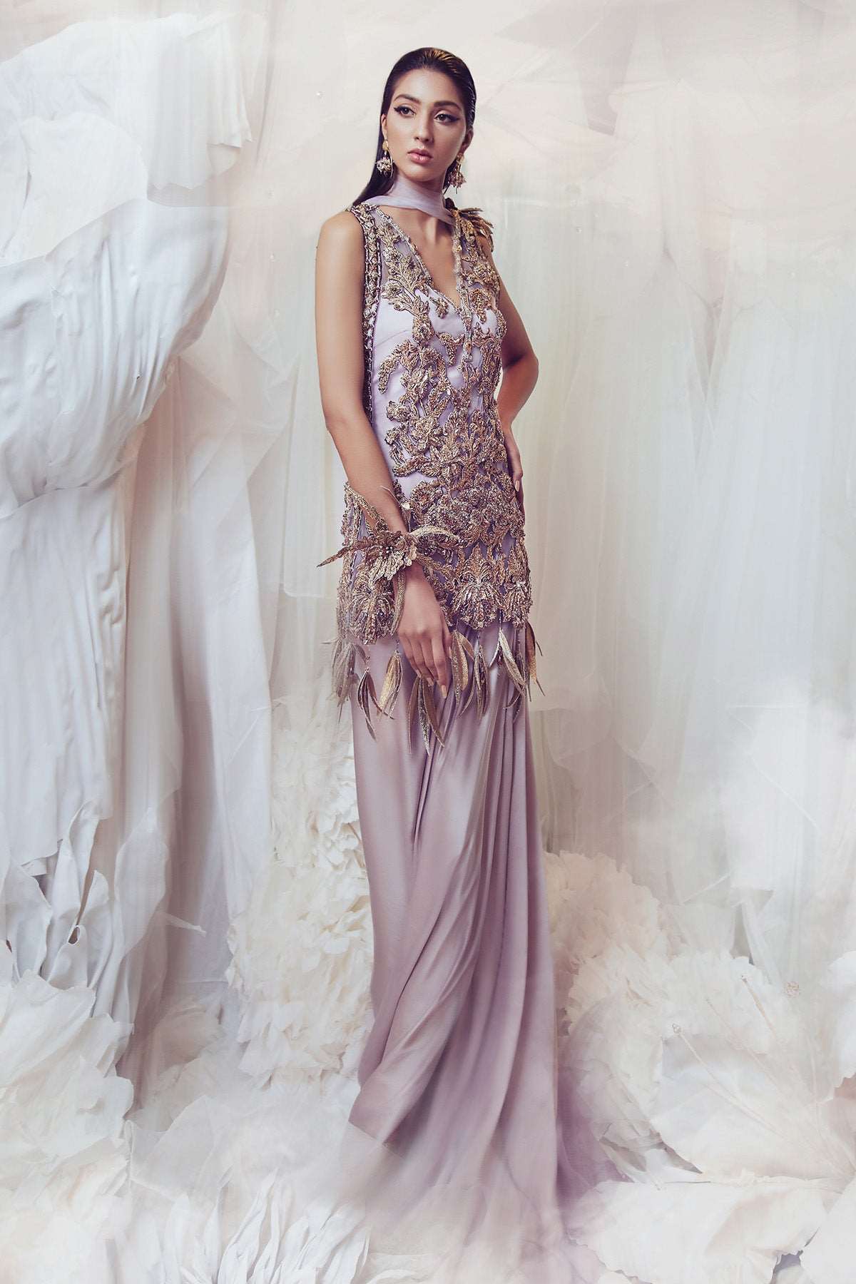 A mauve shift, fully hand embroidered with gold zari, glass beads, gold and silver wires and champagne crystals on a softly shaded tulle with a 3D flower on one shoulder, paired with an asymmetrical overlapped and pleated pillar skirt and comes with an ombré dupatta.