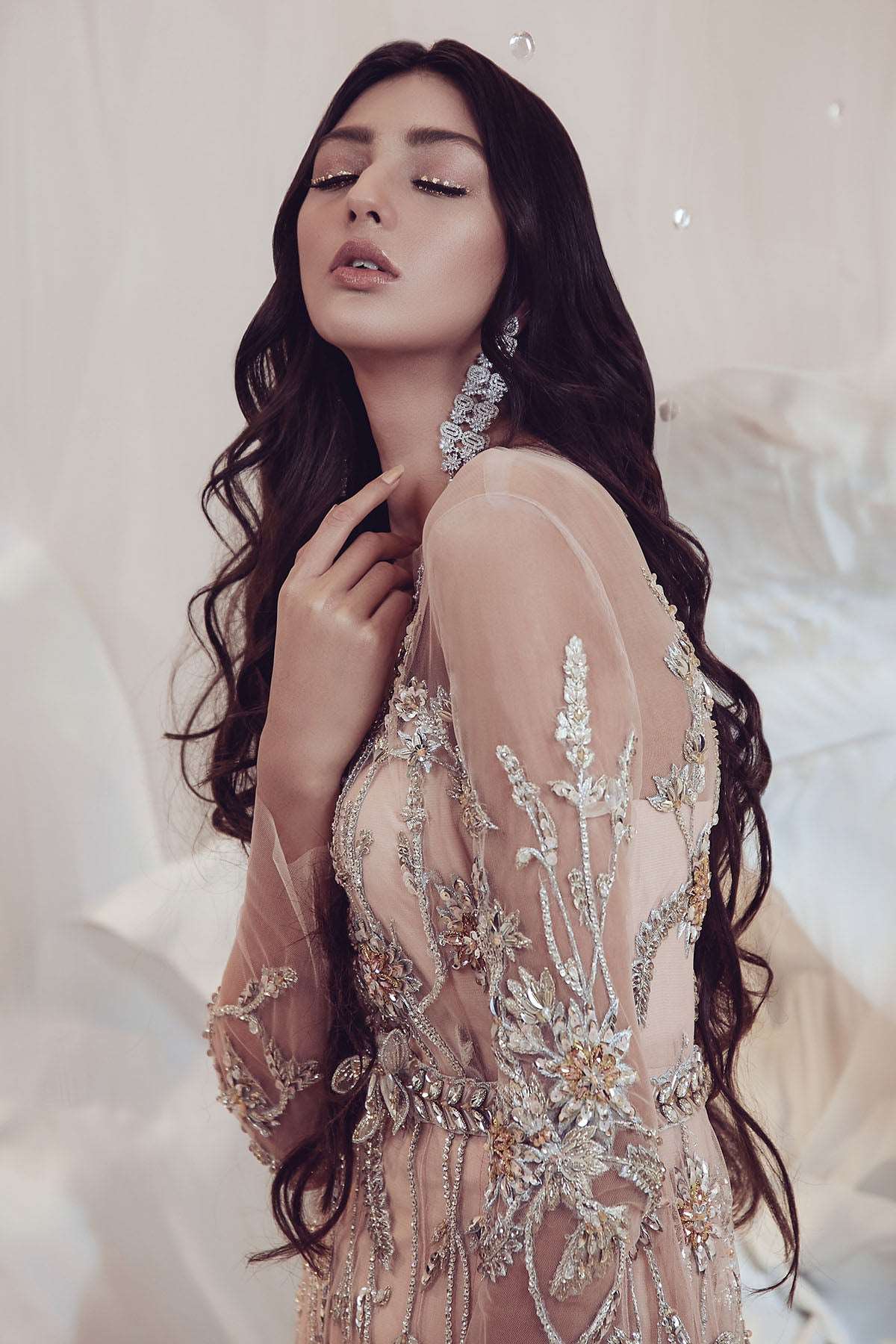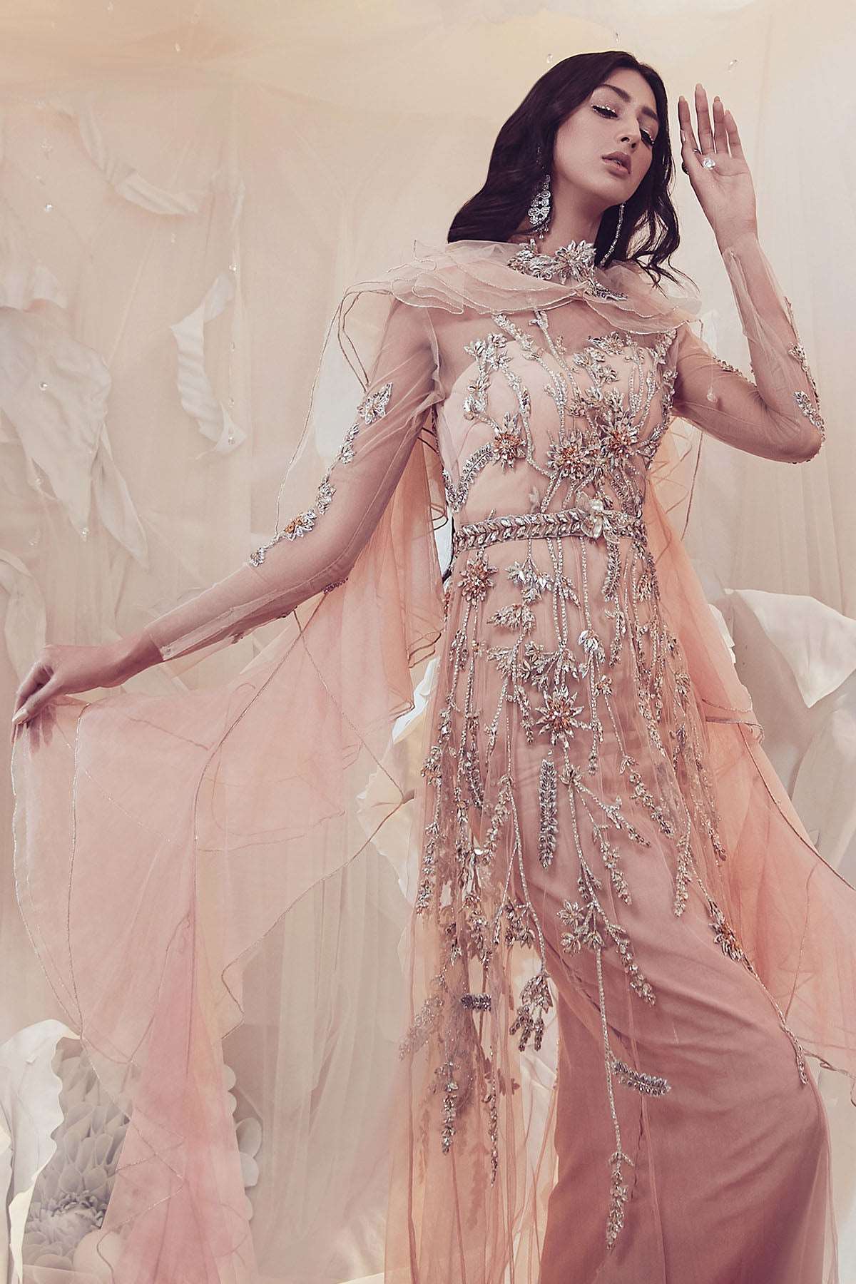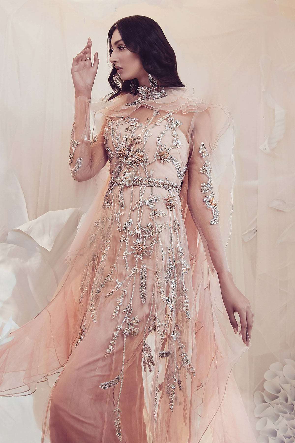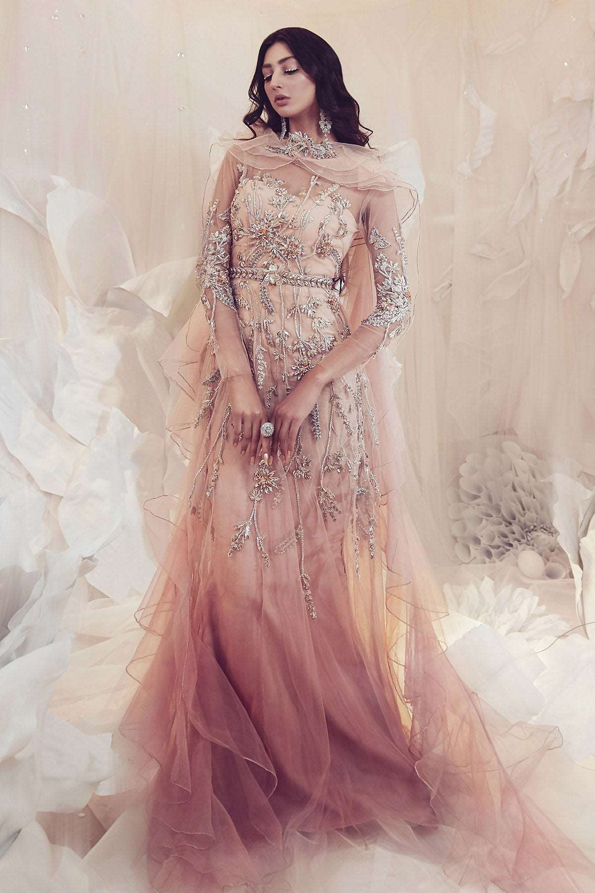A salmon ombré look exquisitely hand embroidered and embellished with petaled crystals and glass beads. It comes with a broached ruffle stole and a crystal encrusted beetle belt.