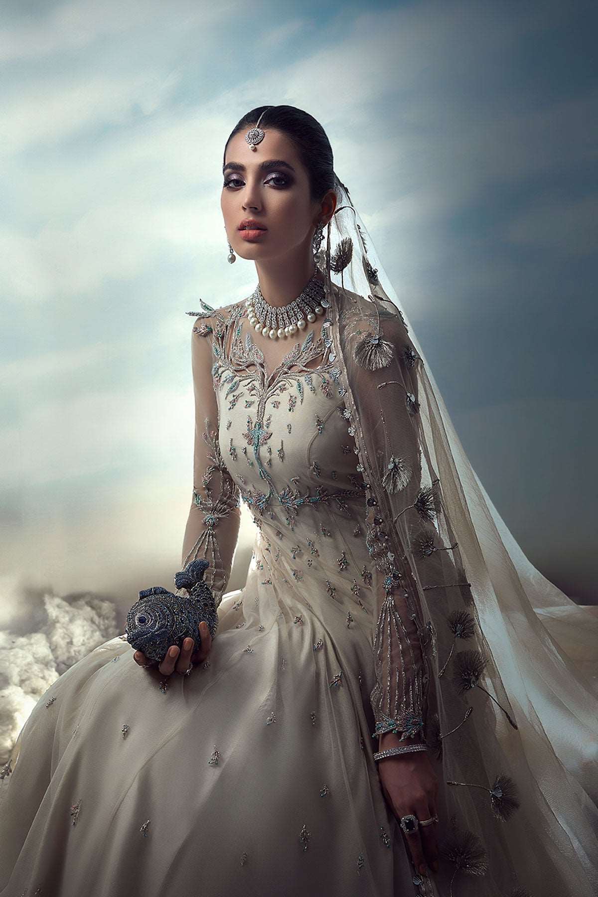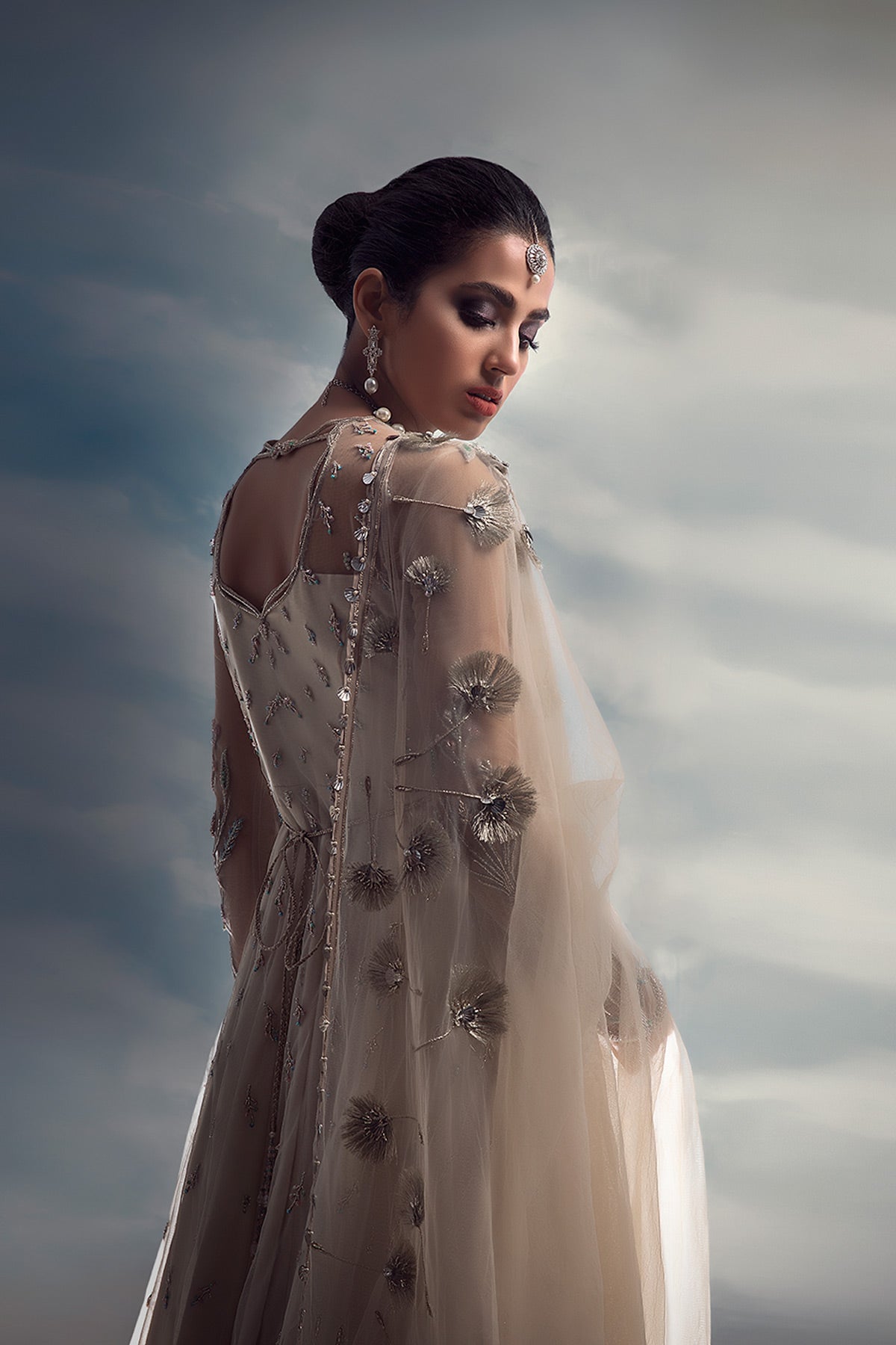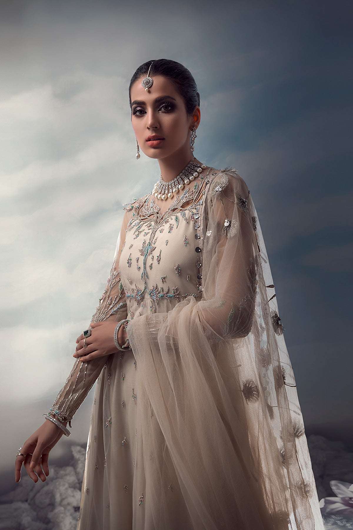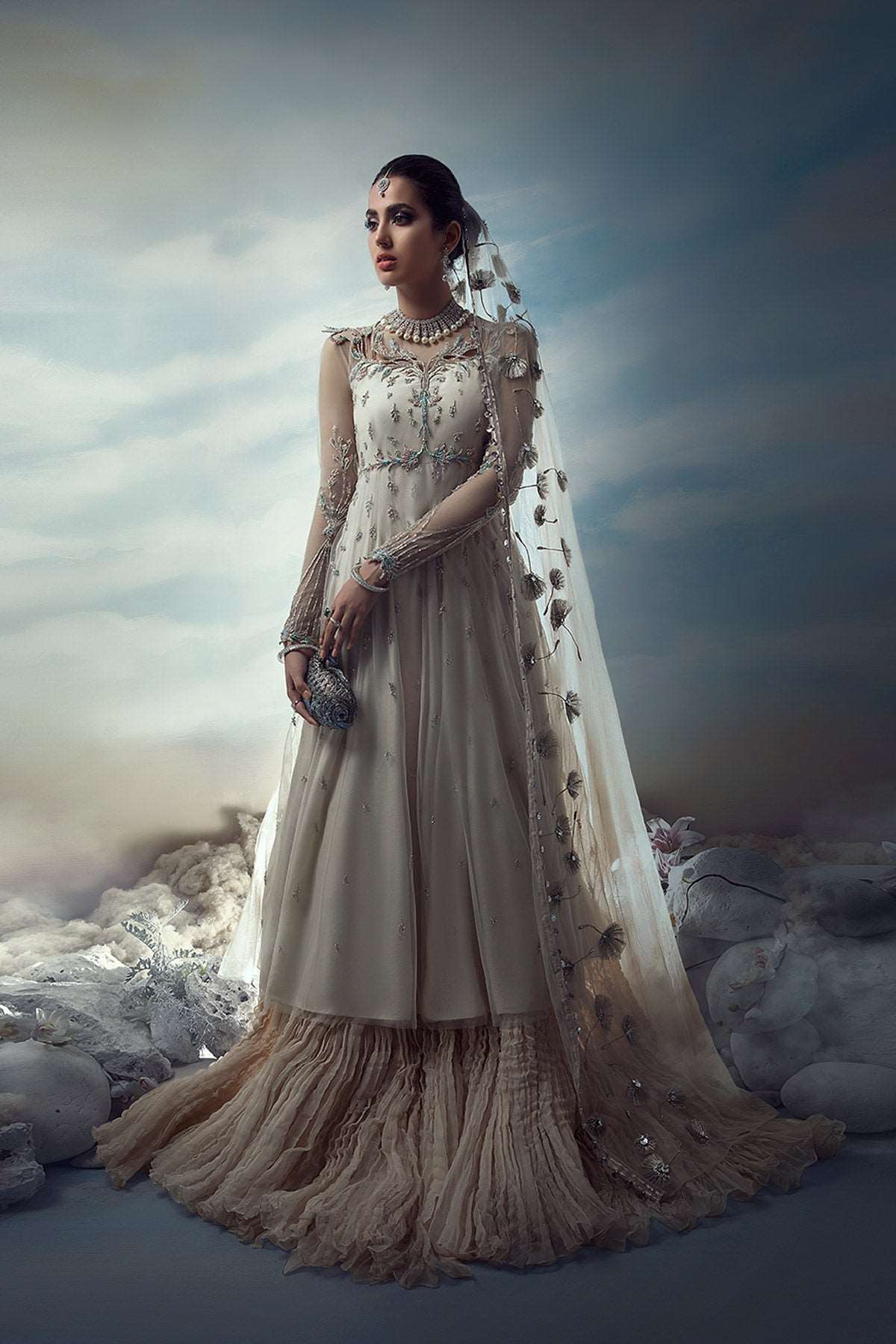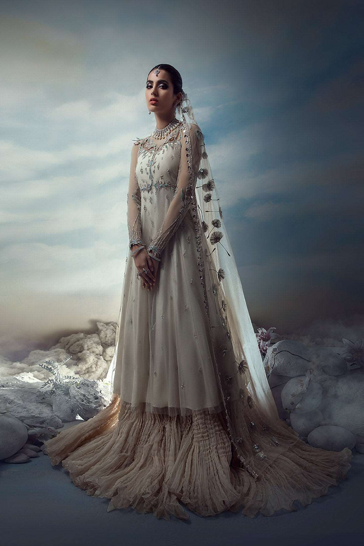 Wish upon a dandelion, as gentle beginnings appear on layers of pearl white tulle and crushed organza. Hints of blush and blue, on a paneled pishwas, are intricately hand-embellished and graced with delicate cutwork that softly flows into a floating disperse of flower-buds. Dancing dandelions course through the length of an ethereal dupatta, with whispers of twinkling love.