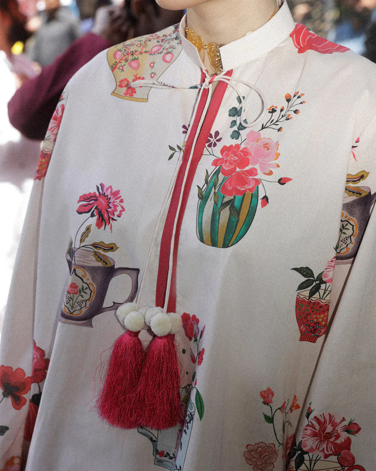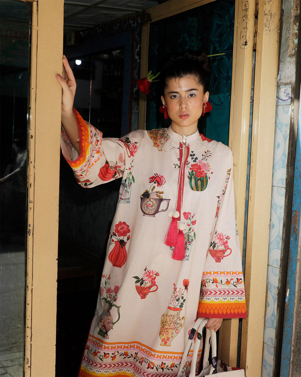Product Description:The ivory Loose fit shirt boasts a charming flower pot print, accentuated by a refined band collar and delicate tassel detail for a touch of sophistication. Paired harmoniously with ivory culottes featuring striking tangerine color blocking, each piece combines comfort with modern style. Elevate your ensemble with the printed silk dupatta, showcasing vibrant hues and floral patterns that effortlessly complement the outfit. Ideal for both casual gatherings and special occasions, Jugnu invites you to embrace effortless grace and timeless beauty in this versatile ensemble.