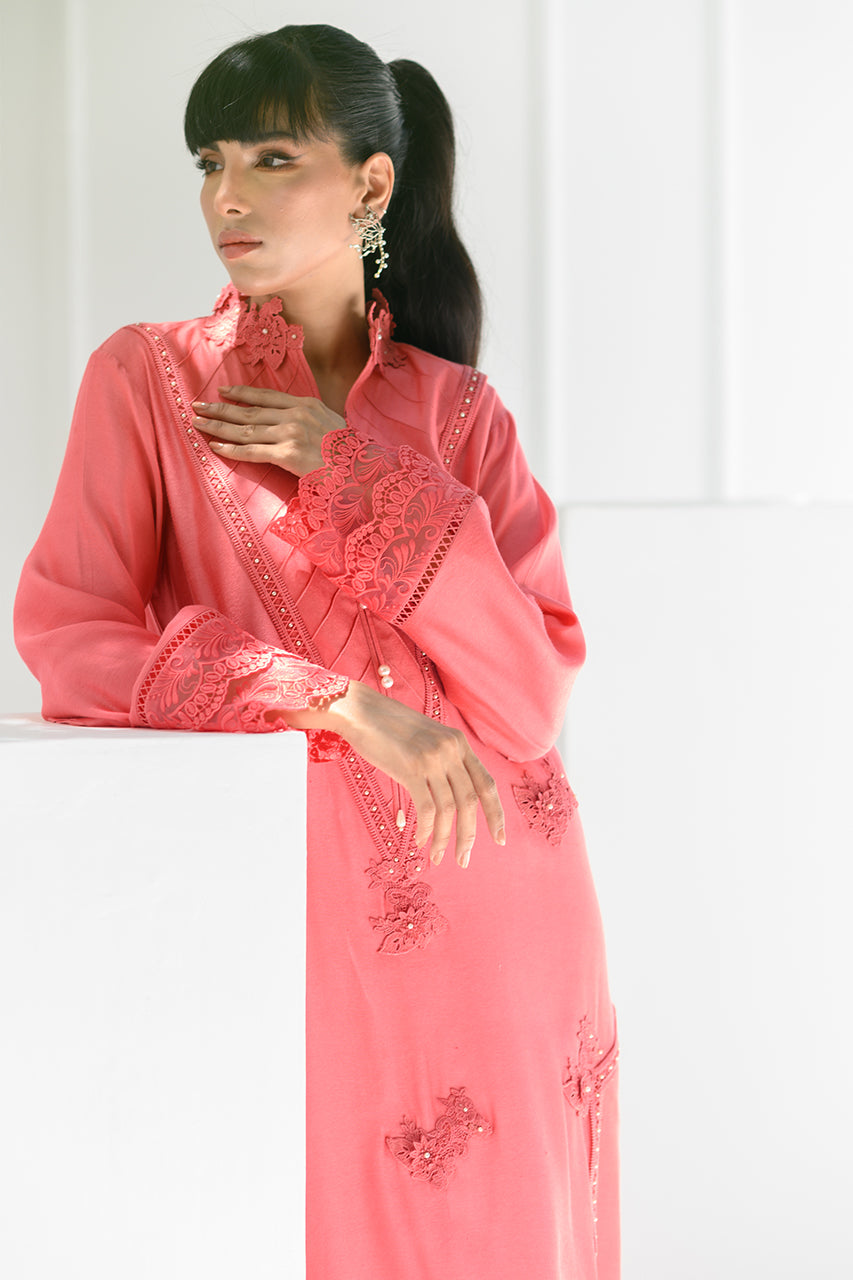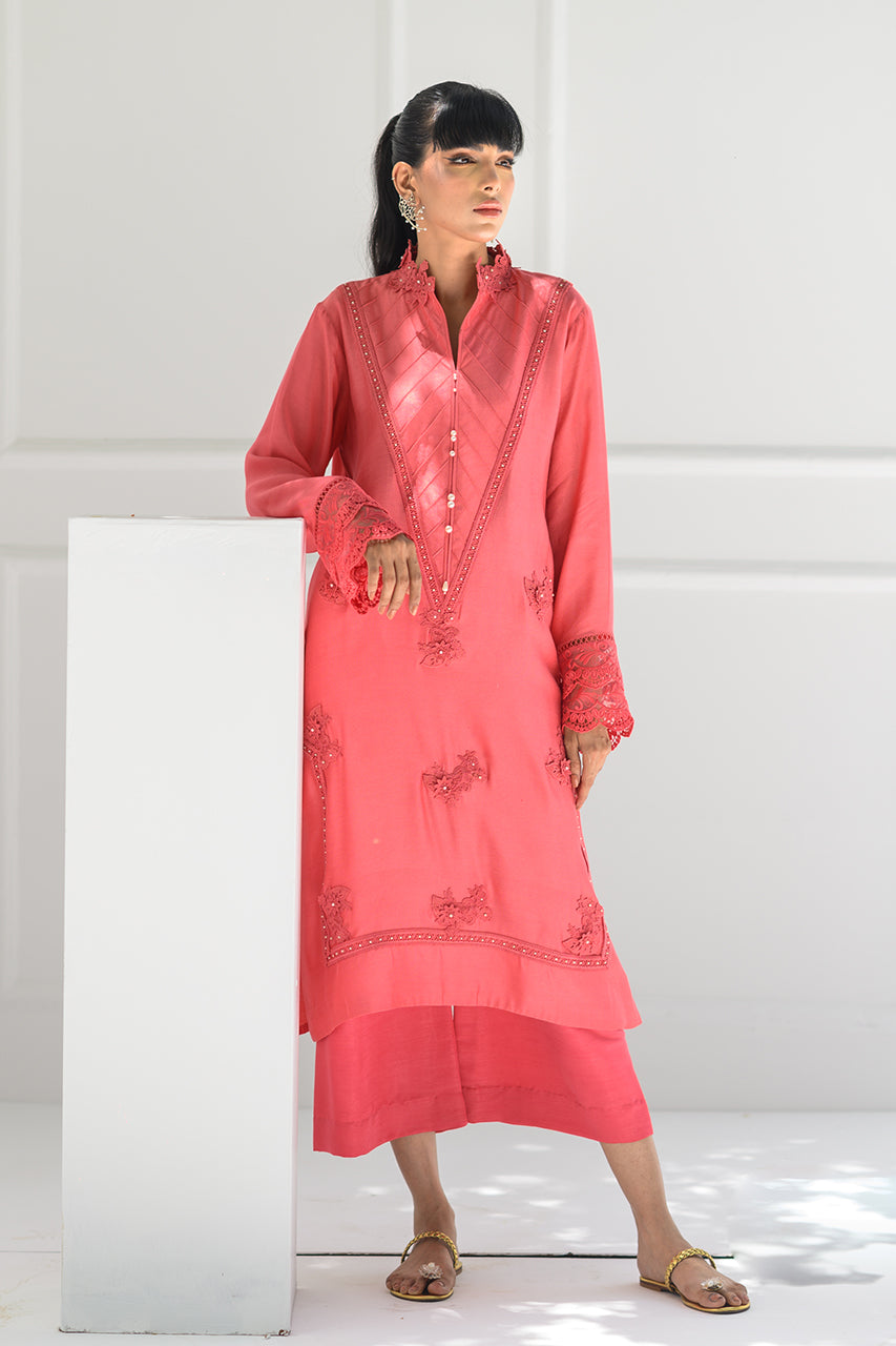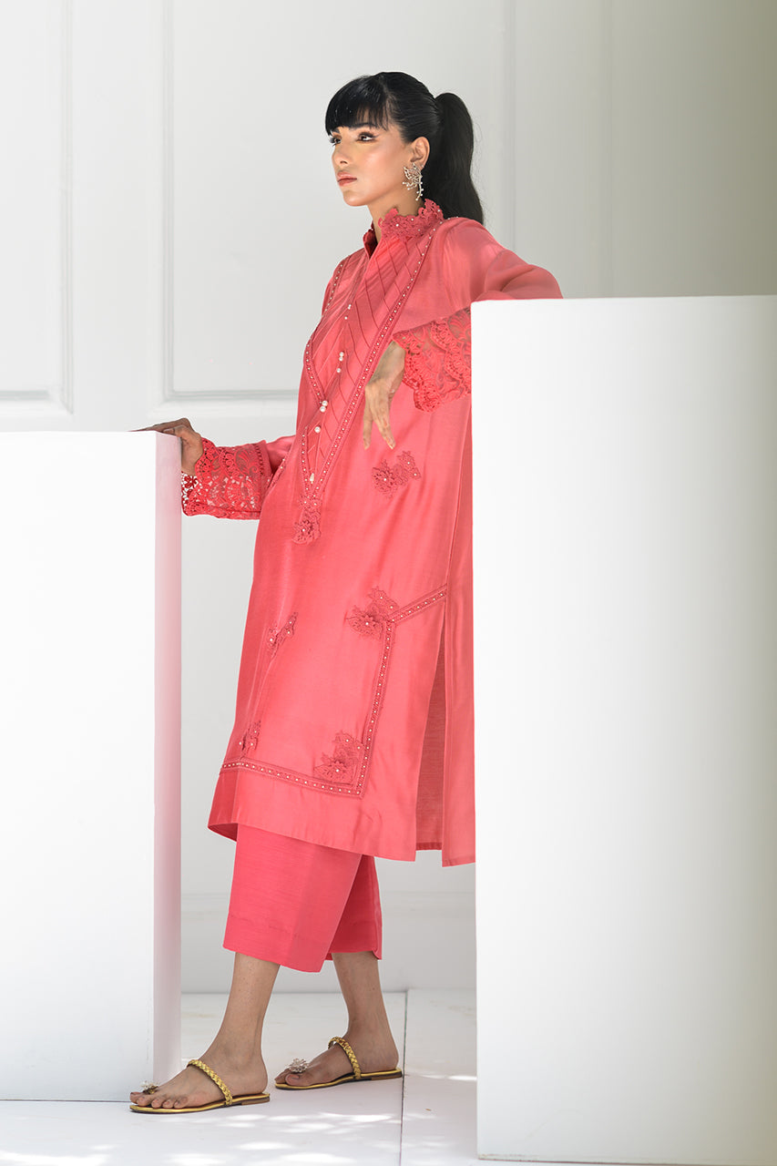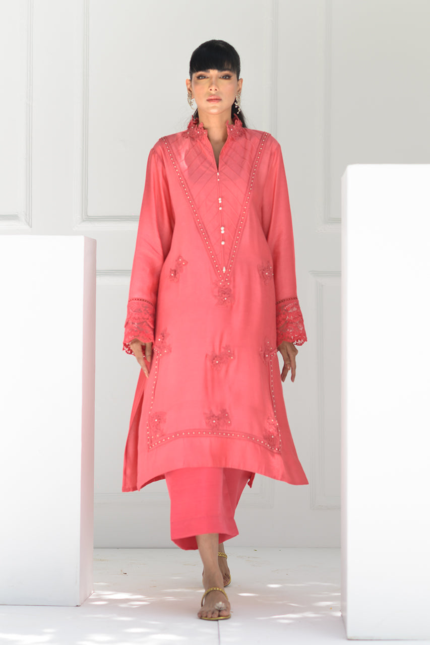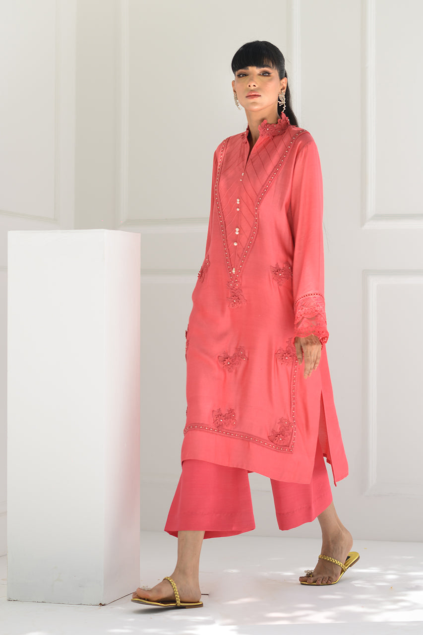This long cotton net A line shirt is all the feels this festive season. Featuringa a fresh salmon colour palette, the shirt is detailed with 3D rosettes, pearl work and delicate stitching detail. It is paired with matching culottes to complete the look.