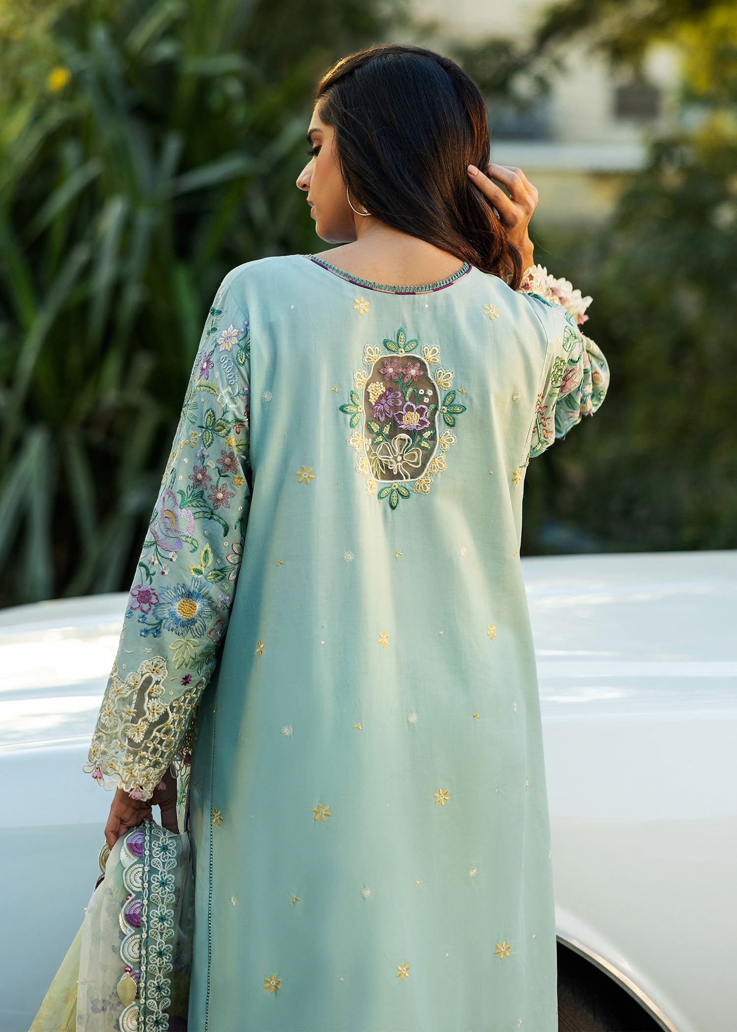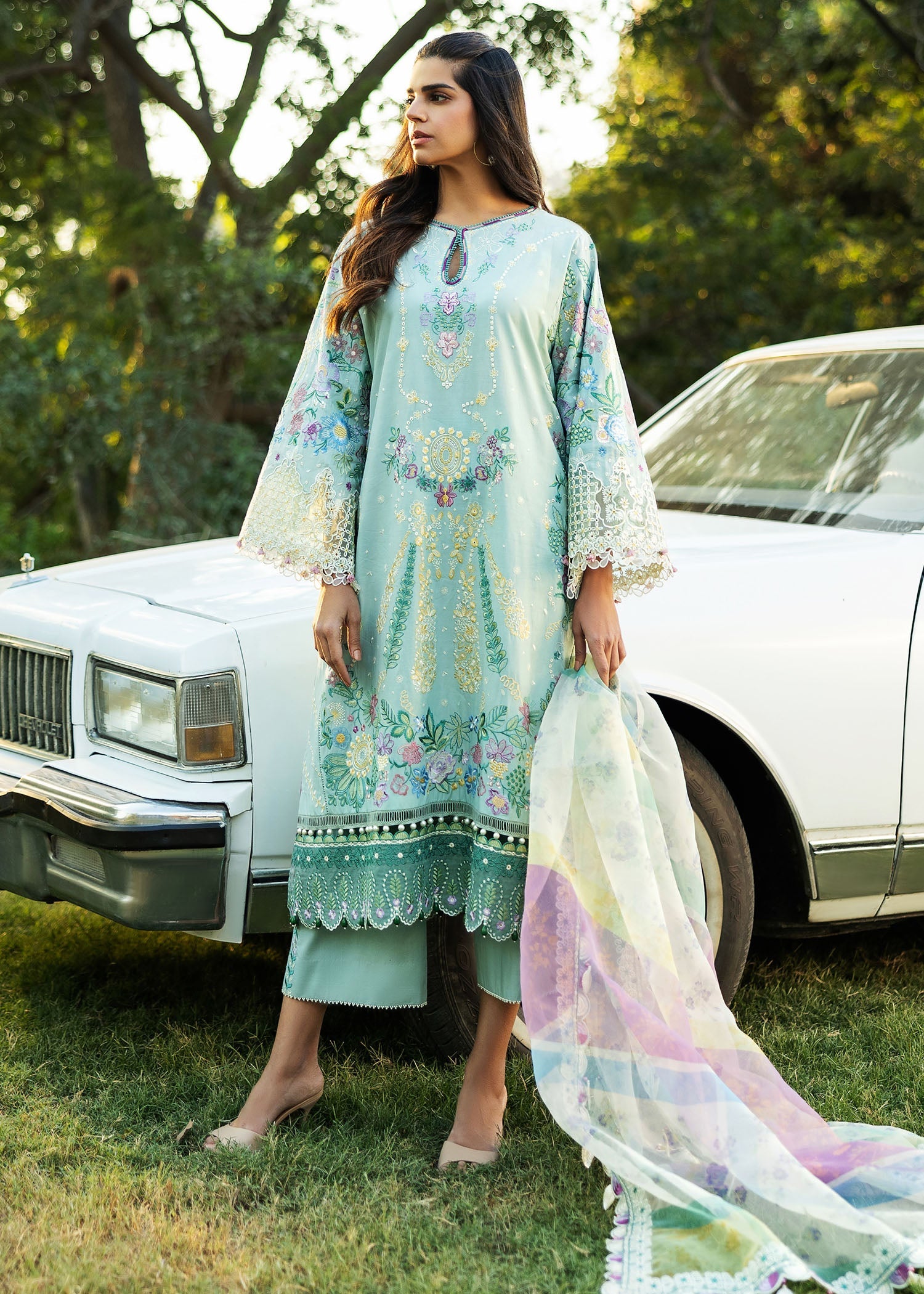 Romancing summer, this beautiful pastel palette based design is a keeper. Like spring in bloom, the densely crafted floral sleeves and an engineered heavily composed front offers the perfect soft look ! Paired with a gorgeous digitally printed organza dupatta with a bed or rose and a contemporary setting for color blocking to lift the overall look.