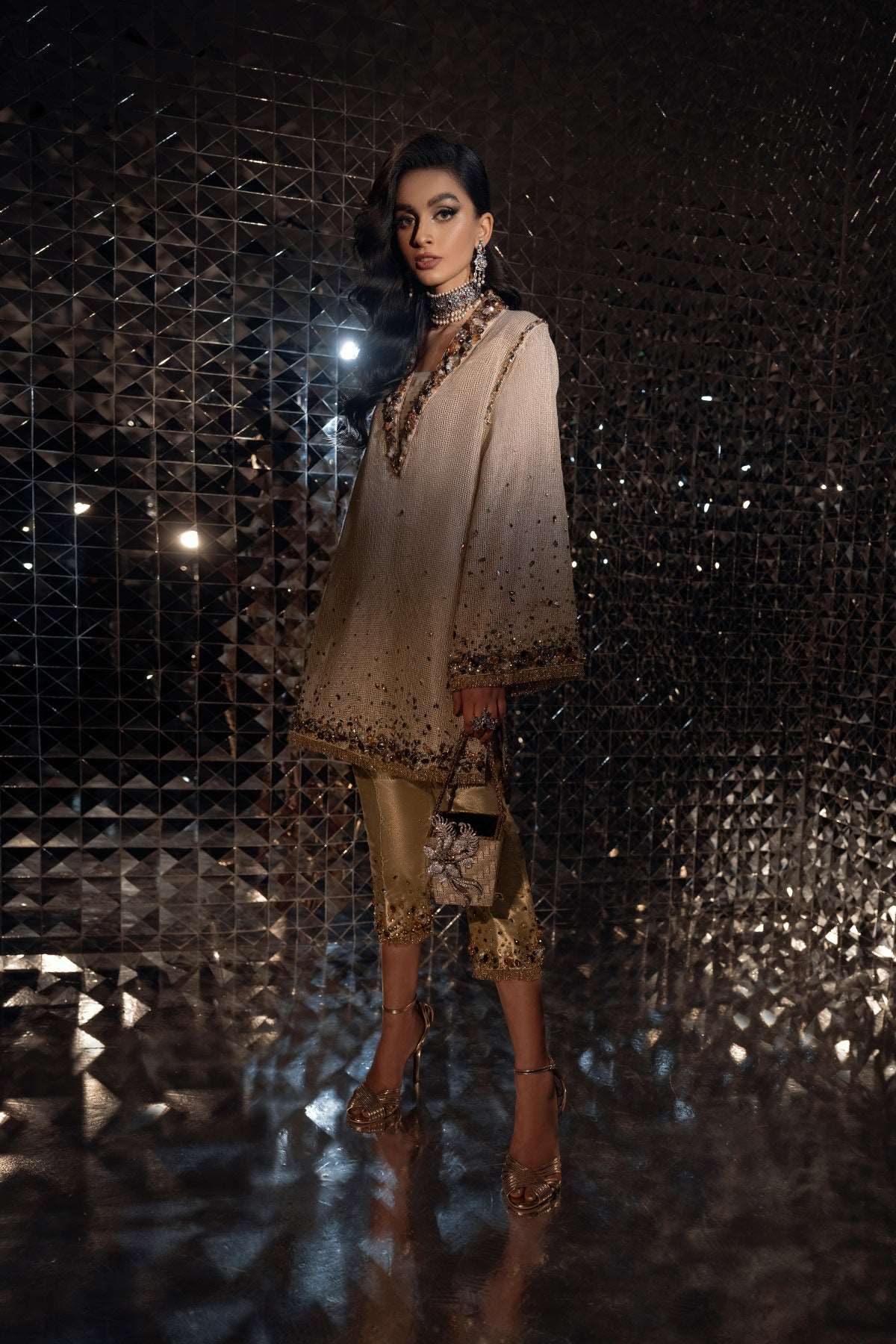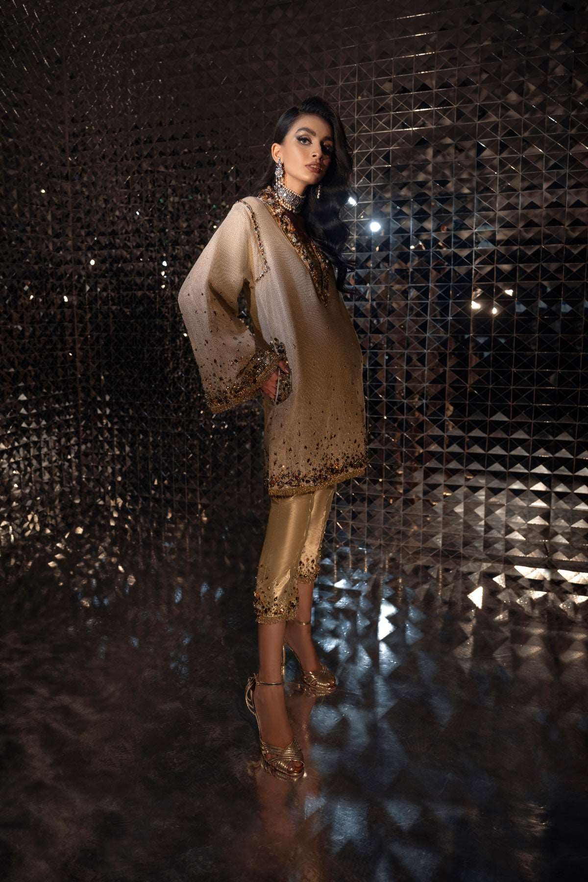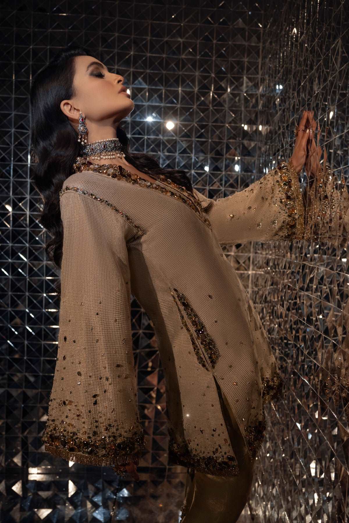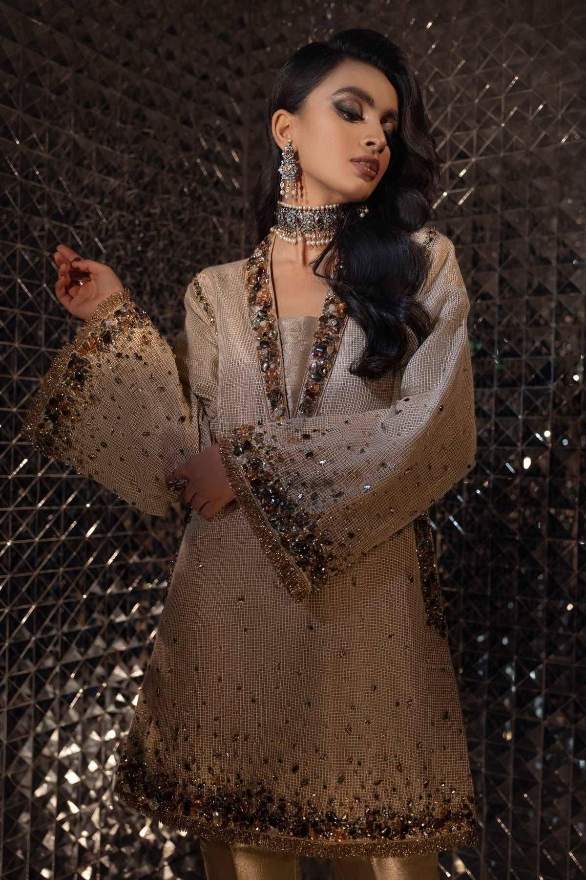 Cascading crystals and exotic stones course through rich zari net. This modern kurta is edged with fine gold threadwork and paired with a subtle gold tissue trousers that compliment the glimmer of the crystals and stones.