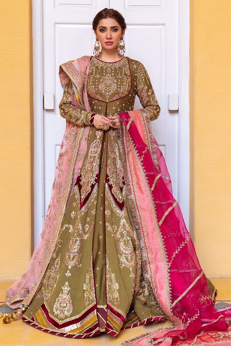 It’s a 5 piece bridal outfit consisting of our signature moss green pure silk peshwas, a full ghair lehnga with embroidered borders and 2 dupattas. A main handcrafted and embellished coral pink jaali dupatta and second dupatta which is a rich fuchsia hue to add more color and glamour.