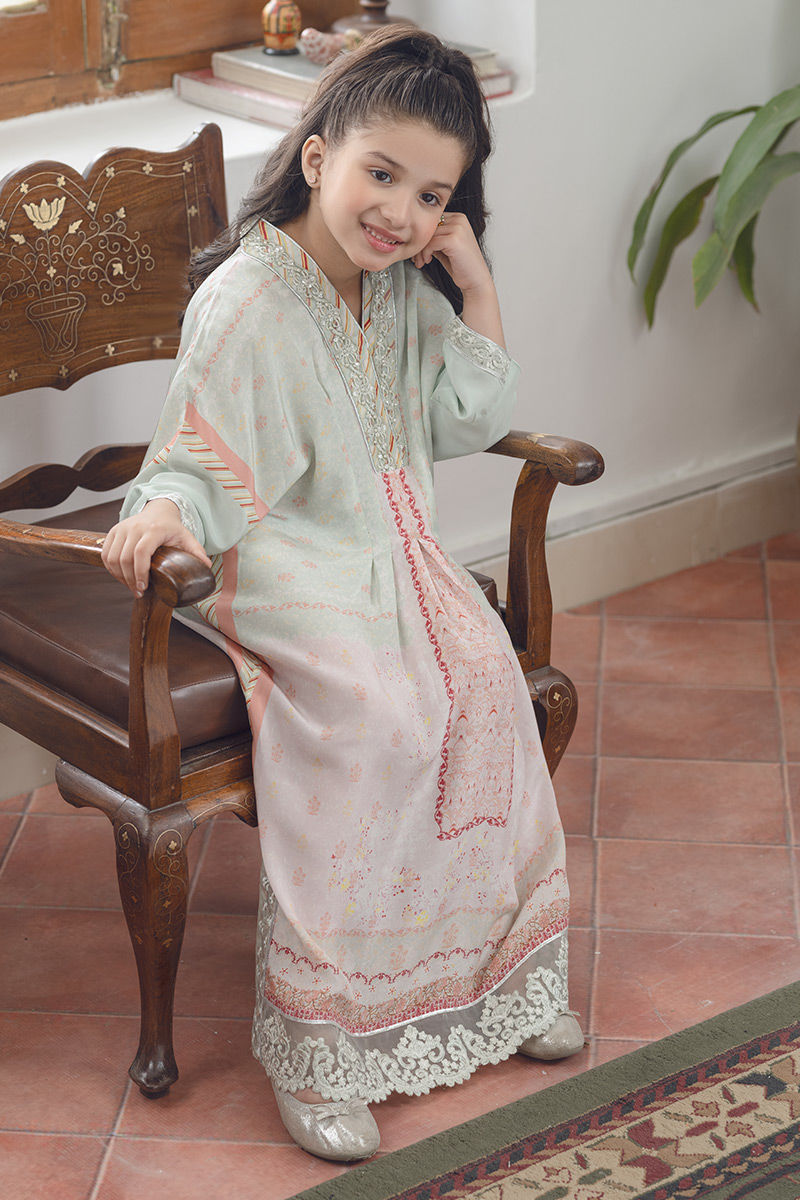 This digitally printed kaftan is a stunning and stylish piece of clothing that is perfect for any special occasion. The kurta features a powder baby pink color that adds a touch of femininity and grace to the overall design. The sleeves are adorned with a hint of green, which creates a beautiful contrast against the soft pink and adds a pop of color to the design. The kurta is further enhanced with a beautiful floral and paisley print in shades of pink, green, and gold. These intricate designs are expertly placed on the kurta to create a beautiful and harmonious pattern that is both intricate and delicate.
