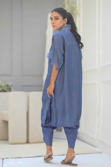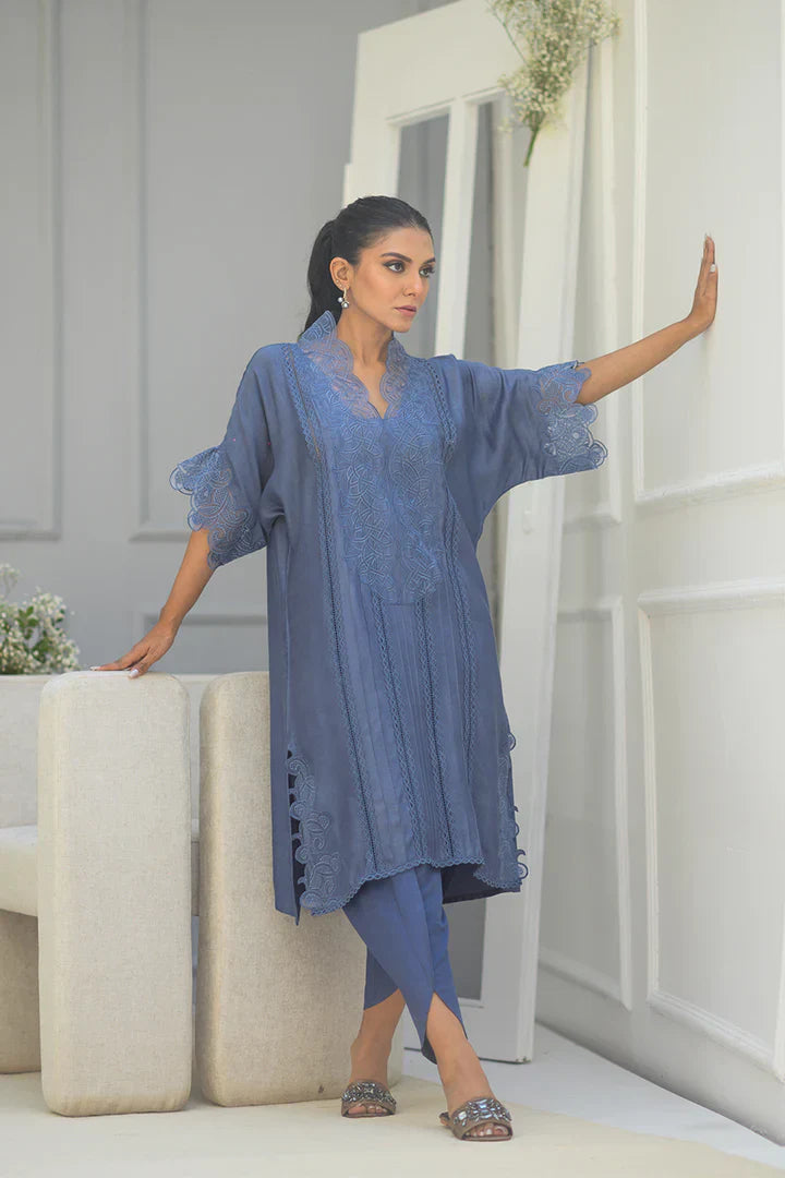 Elevate your seasonal style with this loose fit kurta in a signature N|F Winter Blue palette. It is adorned with stunning laces along the neckline, sleeves and back. Pair it with our minimalist pant shalwar to complete the chic look.