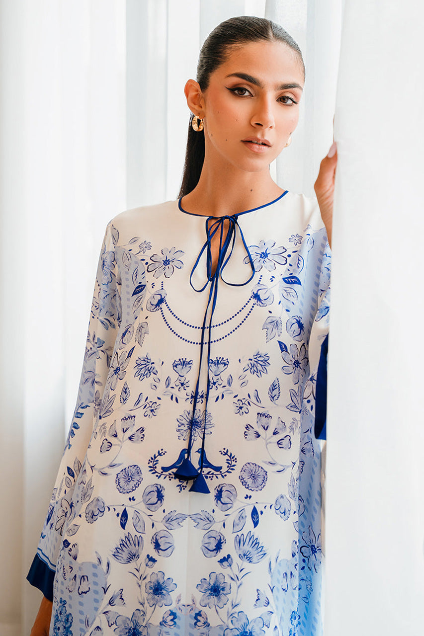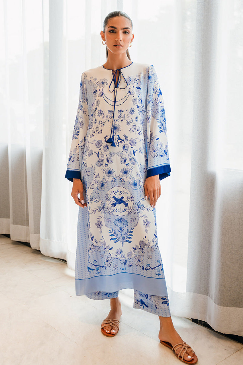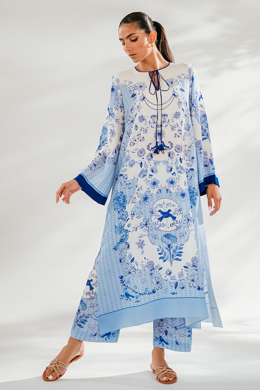A Kachō-e inspired sky blue print emboldens an ivory crepe kaftan style shirt. Paired with crepe culottes and a striking print, Nahla (A)'s relaxed silhouette is alluring.