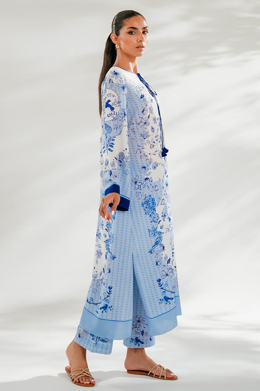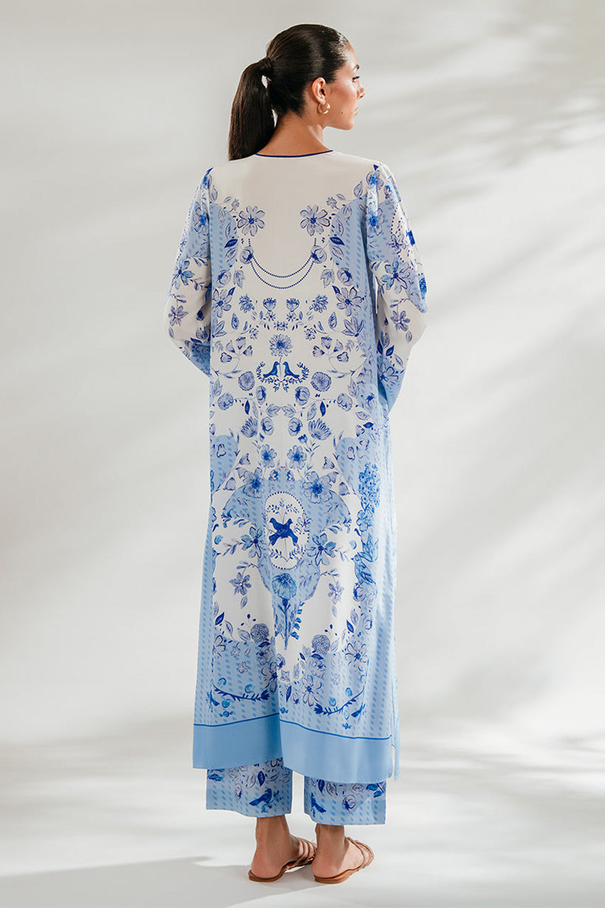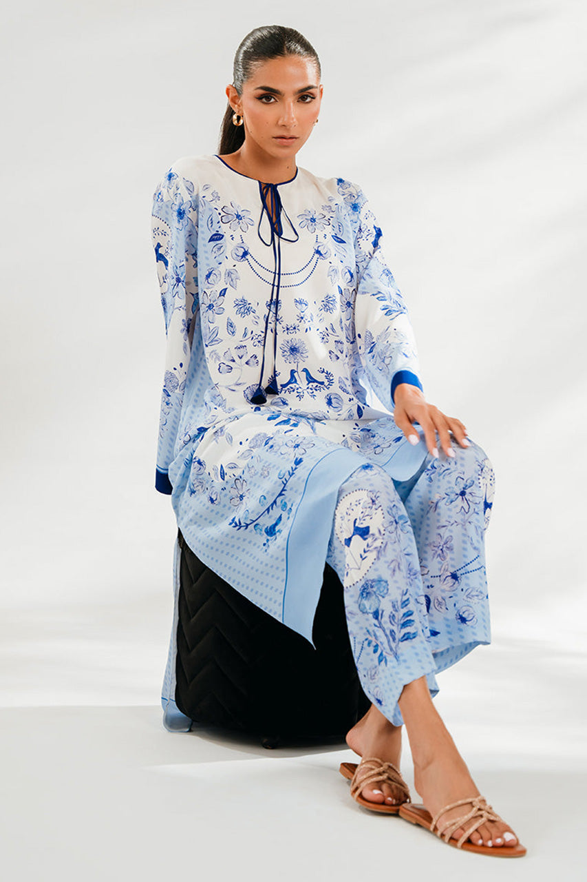 A Kachō-e inspired sky blue print emboldens an ivory crepe kaftan style shirt. Paired with crepe culottes and a striking print, Nahla (A)'s relaxed silhouette is alluring.