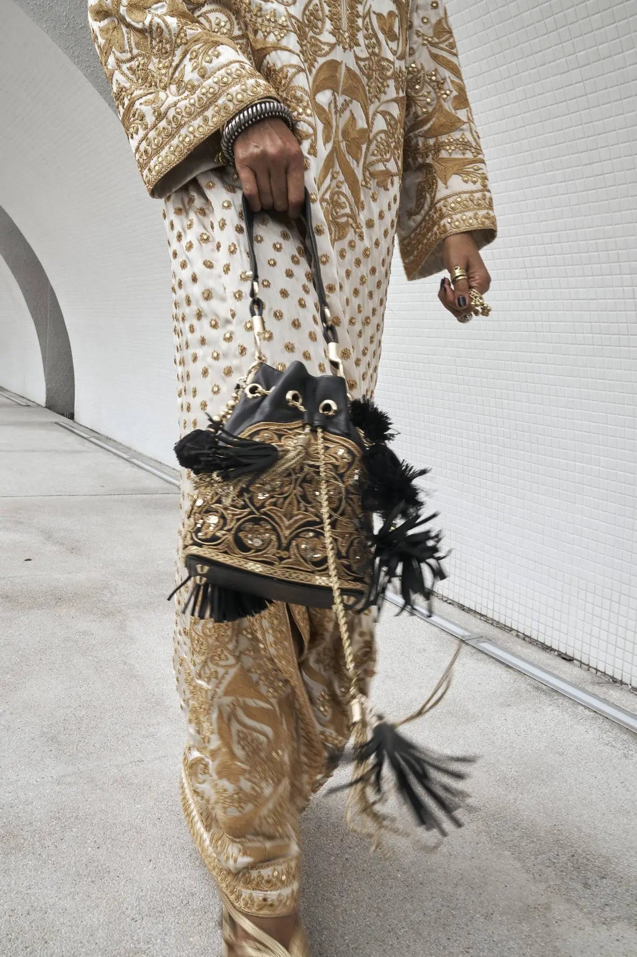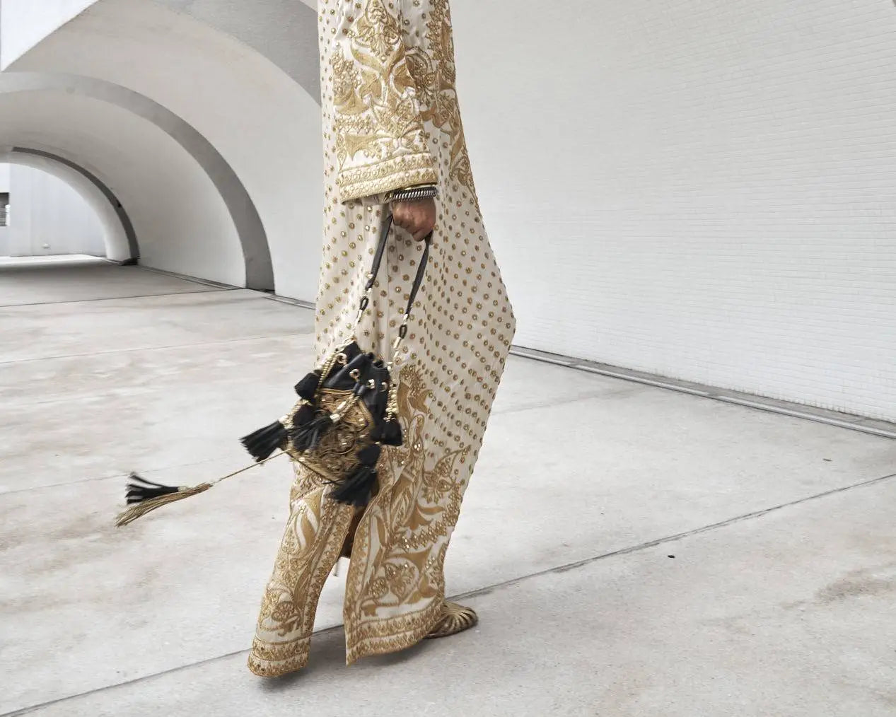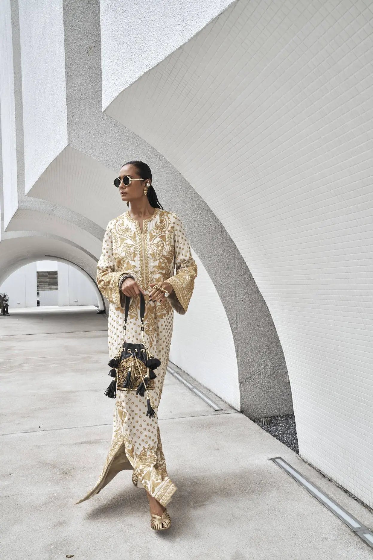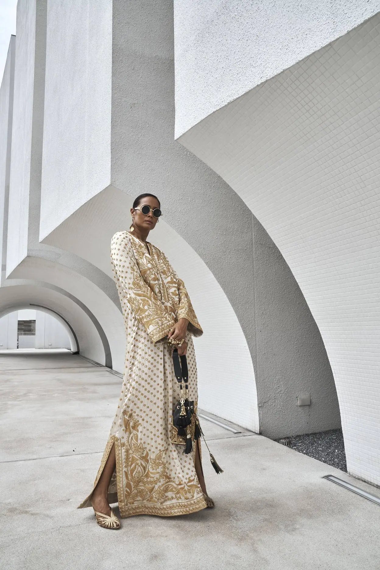 KAFTAN: Ivory pure silk floor length kaftan with side slits, all over golden dori and sequins work