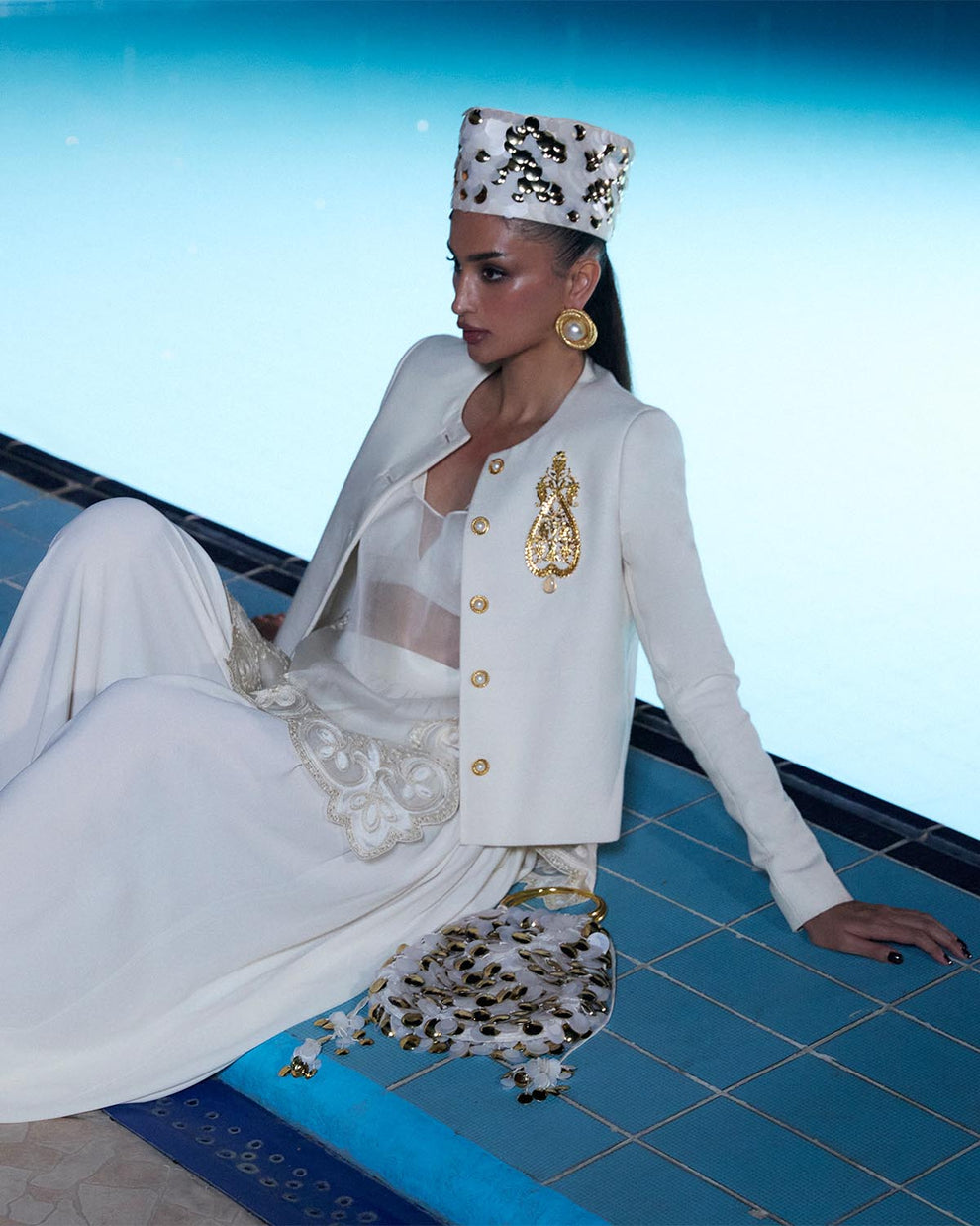 An ivory khaddar boxy jacket, adorned with customize pearl buttons framed in gold and finished with a carved heart shaped brooch on the upper right side accented an ivory stone that hangs with timeless charm. Paired with an ivory organza shirt delicately embroidered with tonal multihead motifs finished in a graceful cutwork. Completing the look is a fluid grip harem pants subtly detailed with buttoned ankle cuffs for a tailored edge.