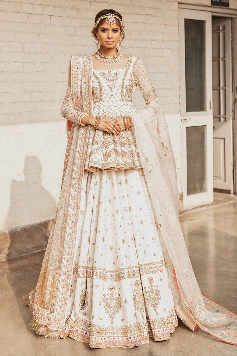 Maham Ali embodies the true grace of an MNR Muse in our 5 piece Nousha bridal. A pristine white matching set that consists of peach and antique gold accents. Filled with neatly packed embroideries and carefully hand-crafted embellishments it is stitched in a beautiful organza peplum with net sleeves worn on top of a beautiful raw silk lehnga with our signature hand embellished motifs. We have paired this set with an organza jaal dupatta with neatly placed hand-embellished borders and a minimal applique dupatta.