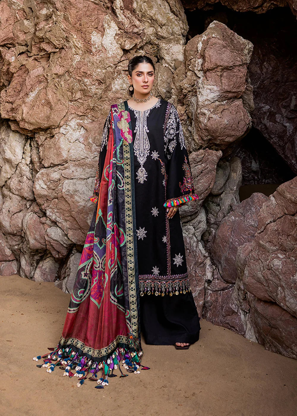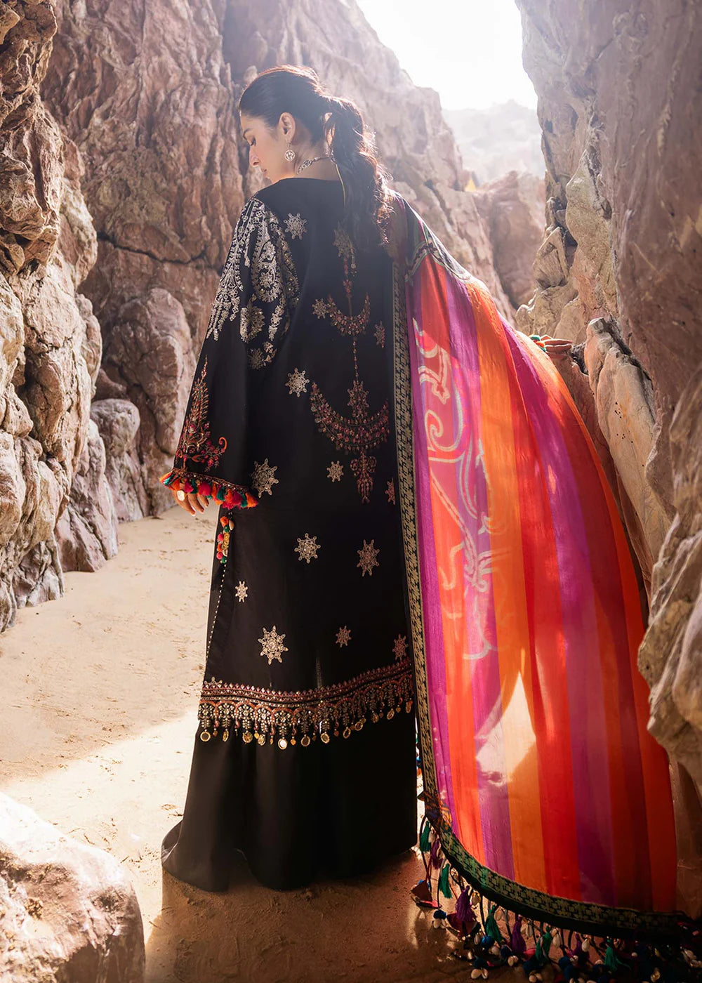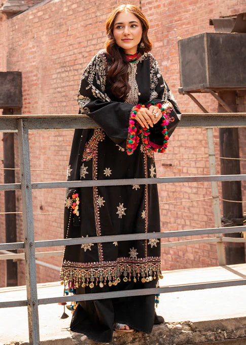 "Embroidered lawn taking inspiration from tribal and traditional textile patterns. This design is lifted beautifully with a spray of matte gold sequins that add subtle glamour to make a perfect look for an Eid get together or may we suggest, a fun summer dholak ! The outfit is paired with a bright digitally printed silk dupatta."