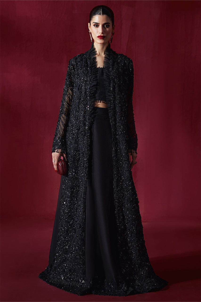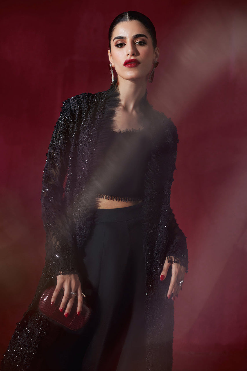 Adorned with obsidian beads in an exquisite cutwork technique, the 'Nuit Étoilée' ensemble exudes opulence and sophistication. Its flowing, front-open jacket captures attention with its intricate craftsmanship and shimmering sequins that add a touch of allure. Paired with the quintessential Elan tassel blouse, this ensemble radiates refined glamour. Finely crafted organza pants, delicately bordered with scintillating sequins, complete the look, showcasing an exceptional blend of luxury and artistry.Step into the enchanting allure of the festive season with the distinguished elegance of ‘Cristal Foncé’. This opulent ebony ensemble showcases a long jacket adorned in a mesmerizing lattice of obsidian crystals, each meticulously positioned to radiate unparalleled brilliance. Paired flawlessly with impeccably tailored pants, this bespoke creation exudes fluid grace, making a resolutely sophisticated statement at every turn."