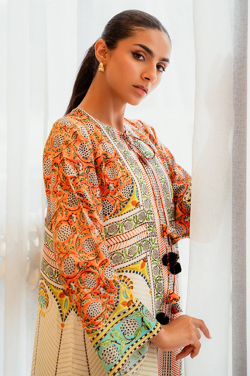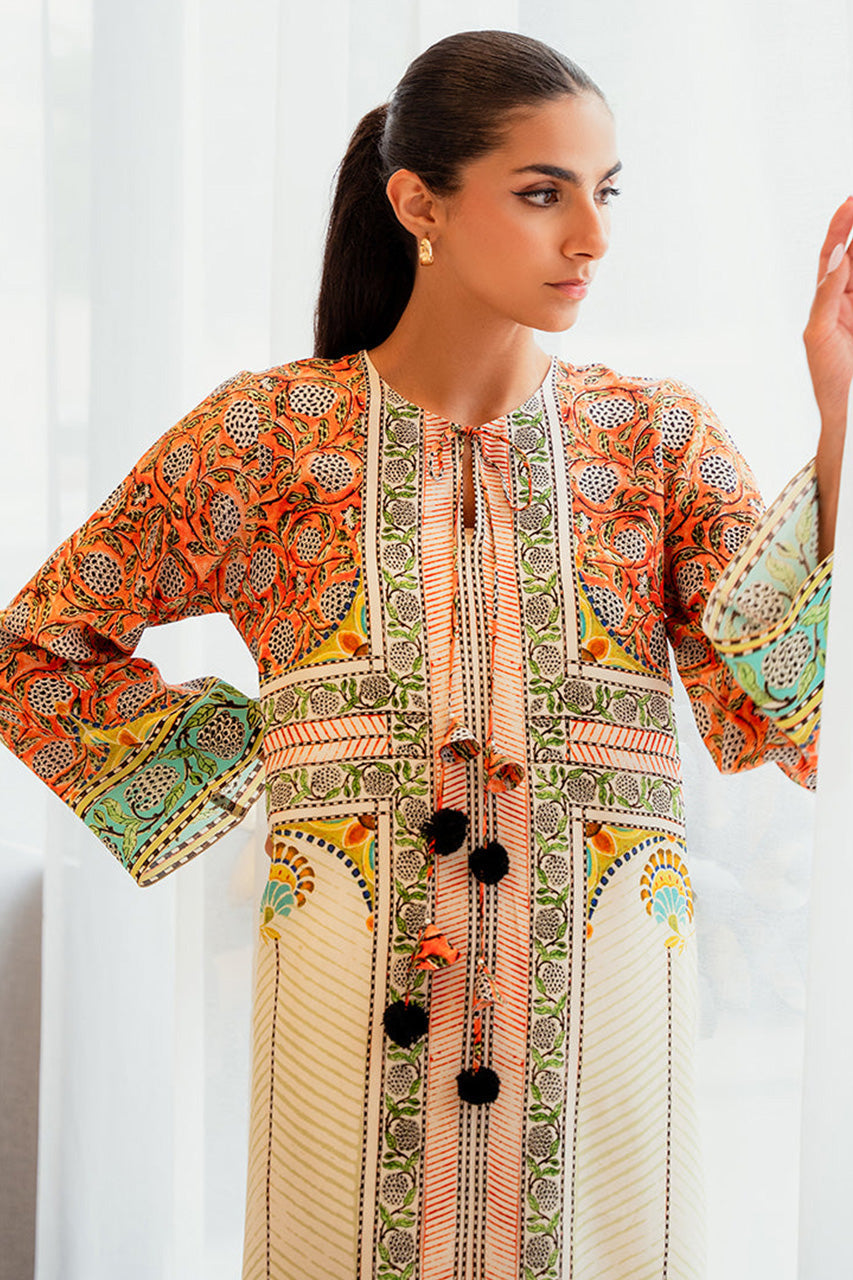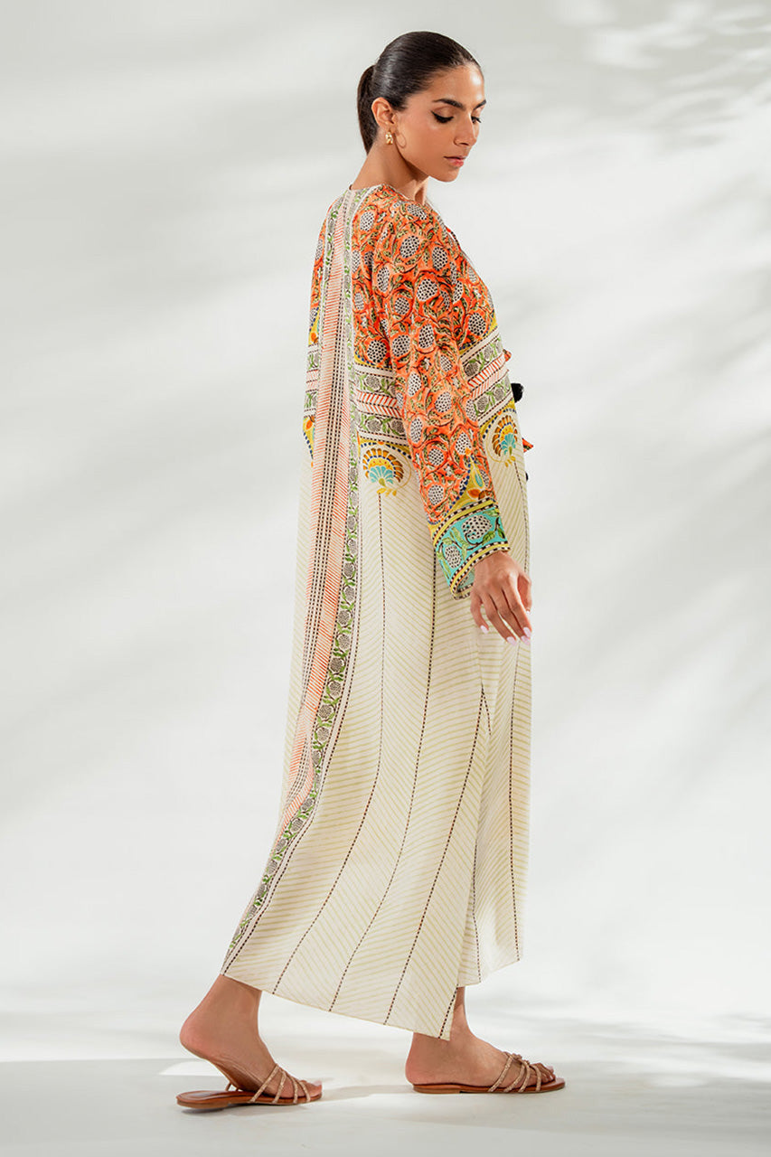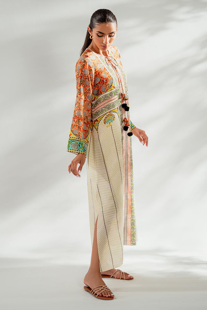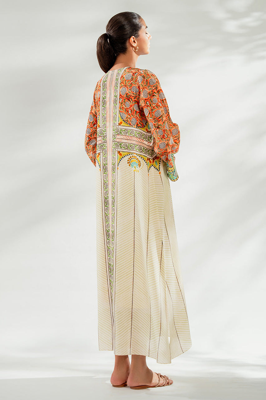 Playful print meets geometric lines in a crepe kaftan. The eggshell Kaftan, with tangerine and mint botanical print, exudes subtle allure and effortless charm that can be dressed up or down to fit your lifestyle.
