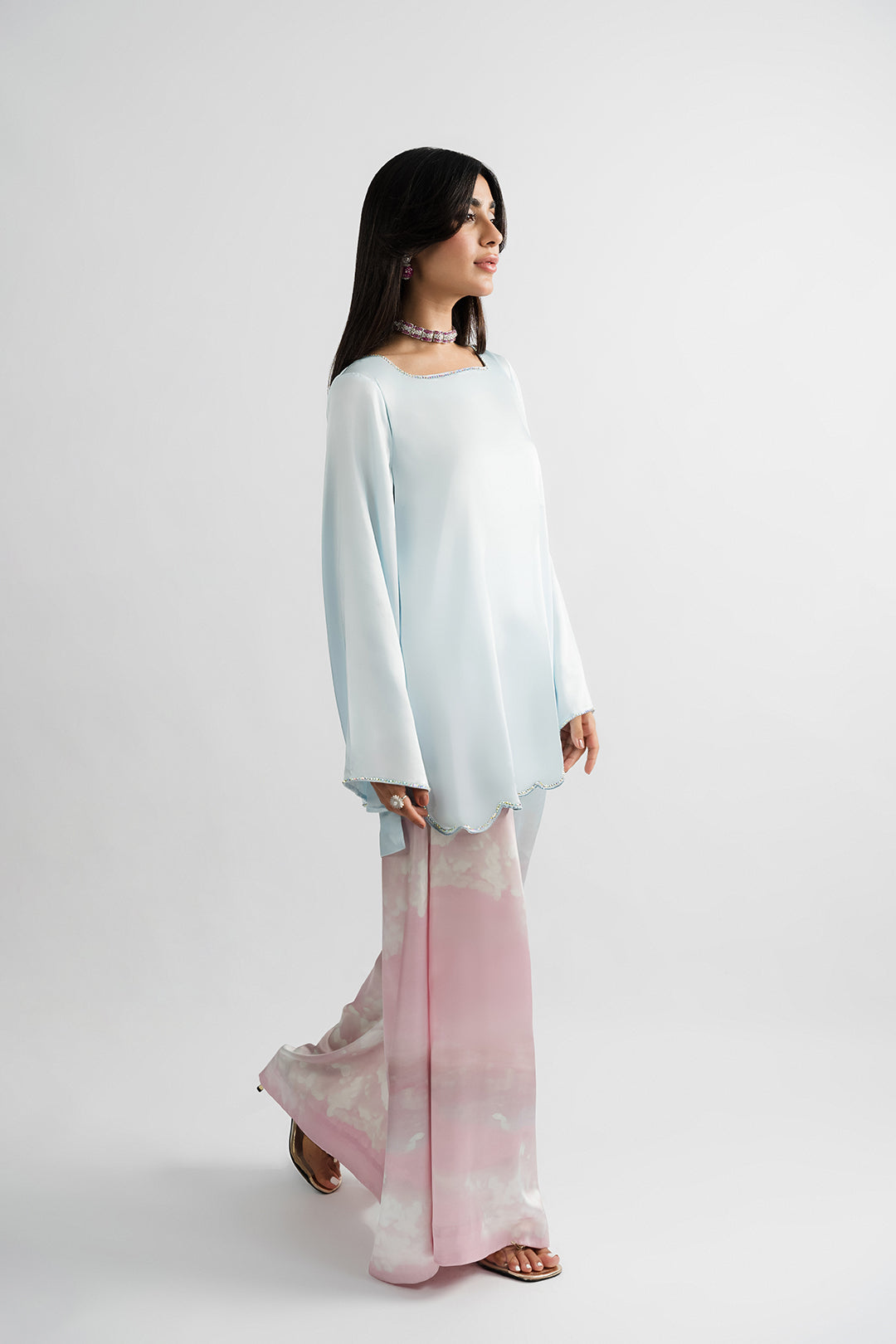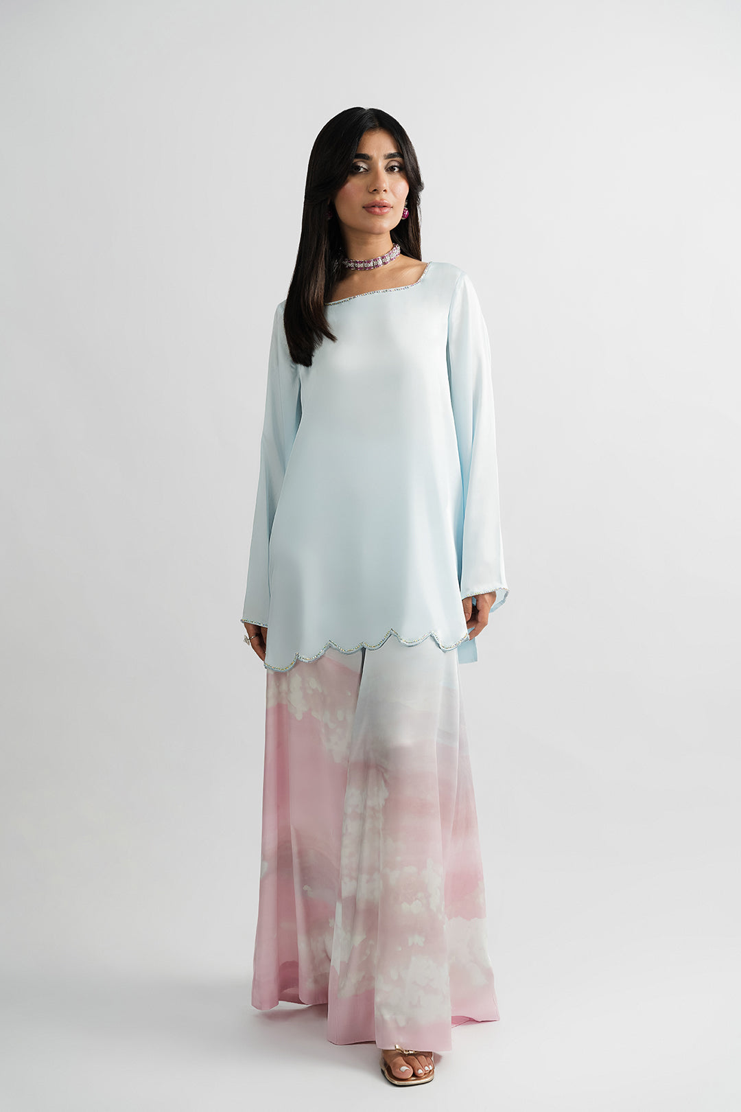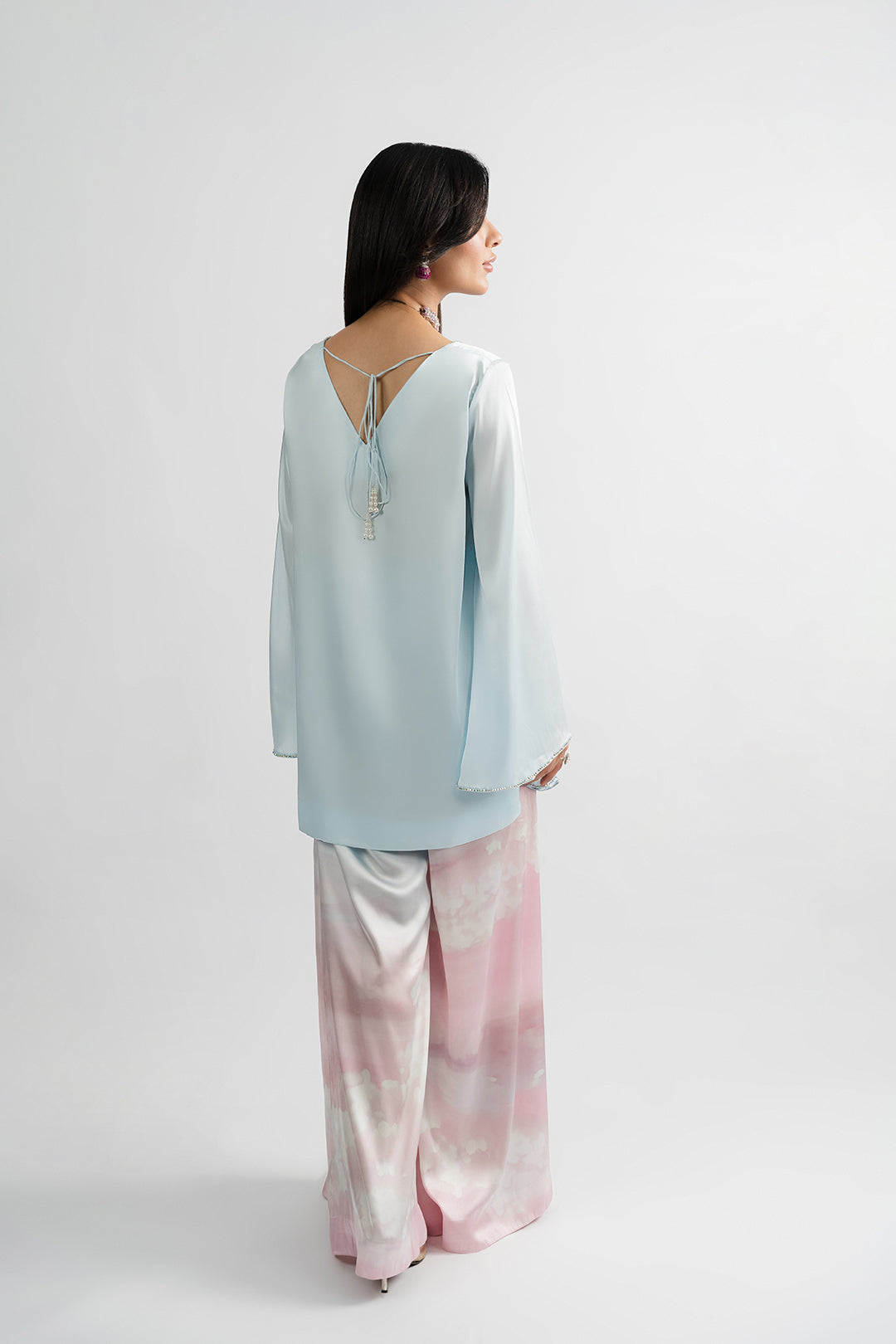- This ice blue top made in soft charmeuse silk fabric features front square neck, back V-neck with crystal tassel & dori detailing, full length flared sleeves and side slits. The top has an intricately embellished neckline finished with a scalloped hem.