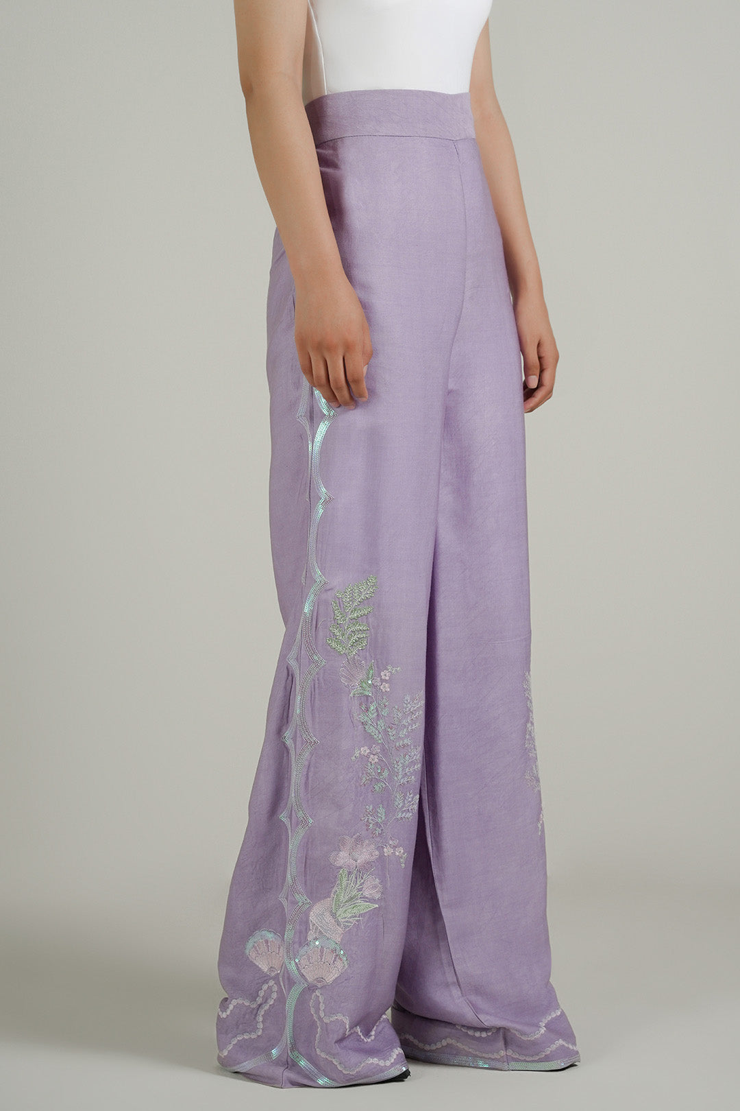 - These lilac embroidered flared pants made in soft satin viscose fabric features semi-elasticated waist band, side zipper opening, hook & eye closure and flared hem.