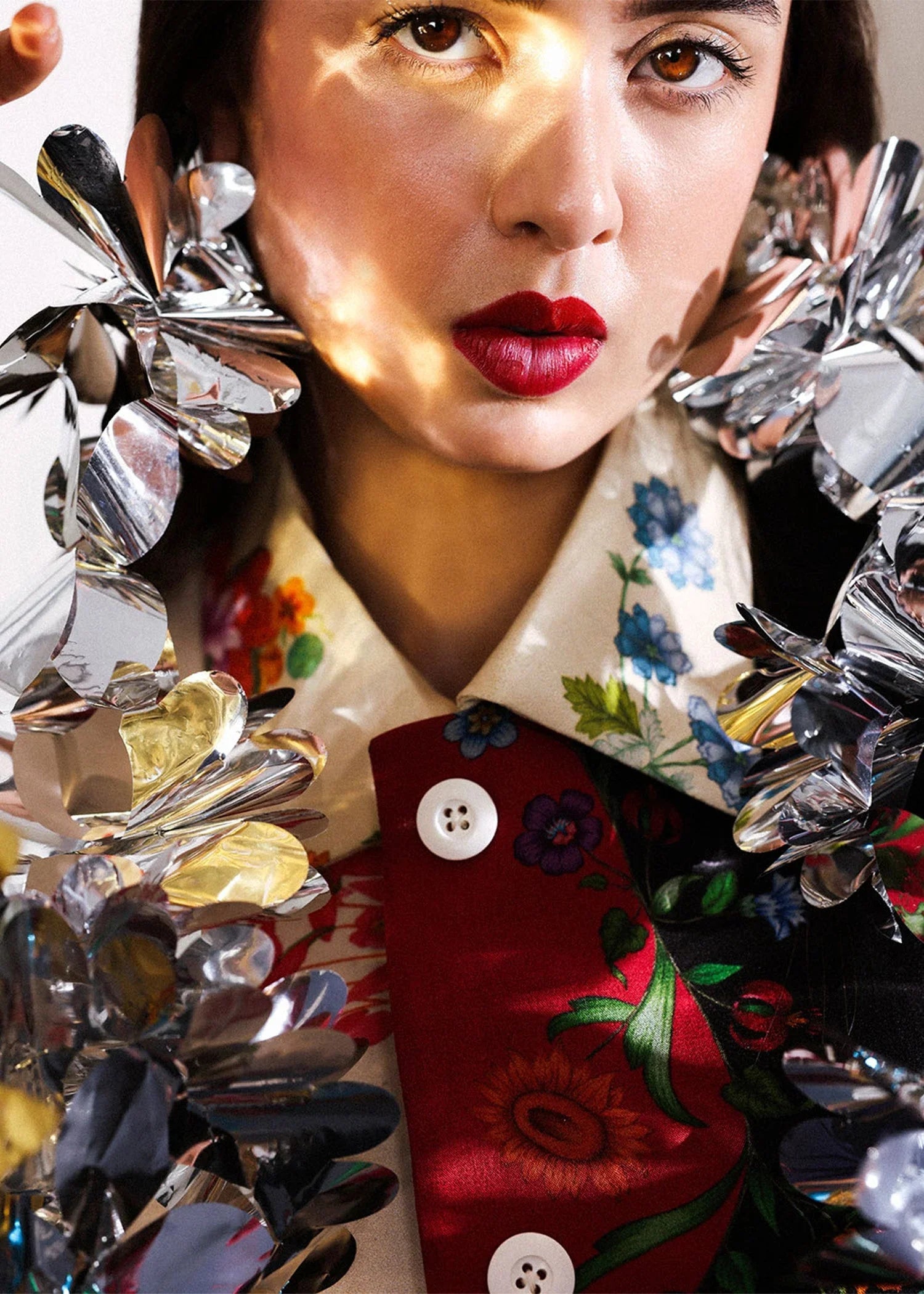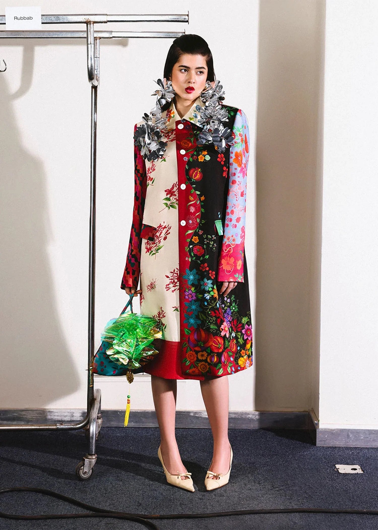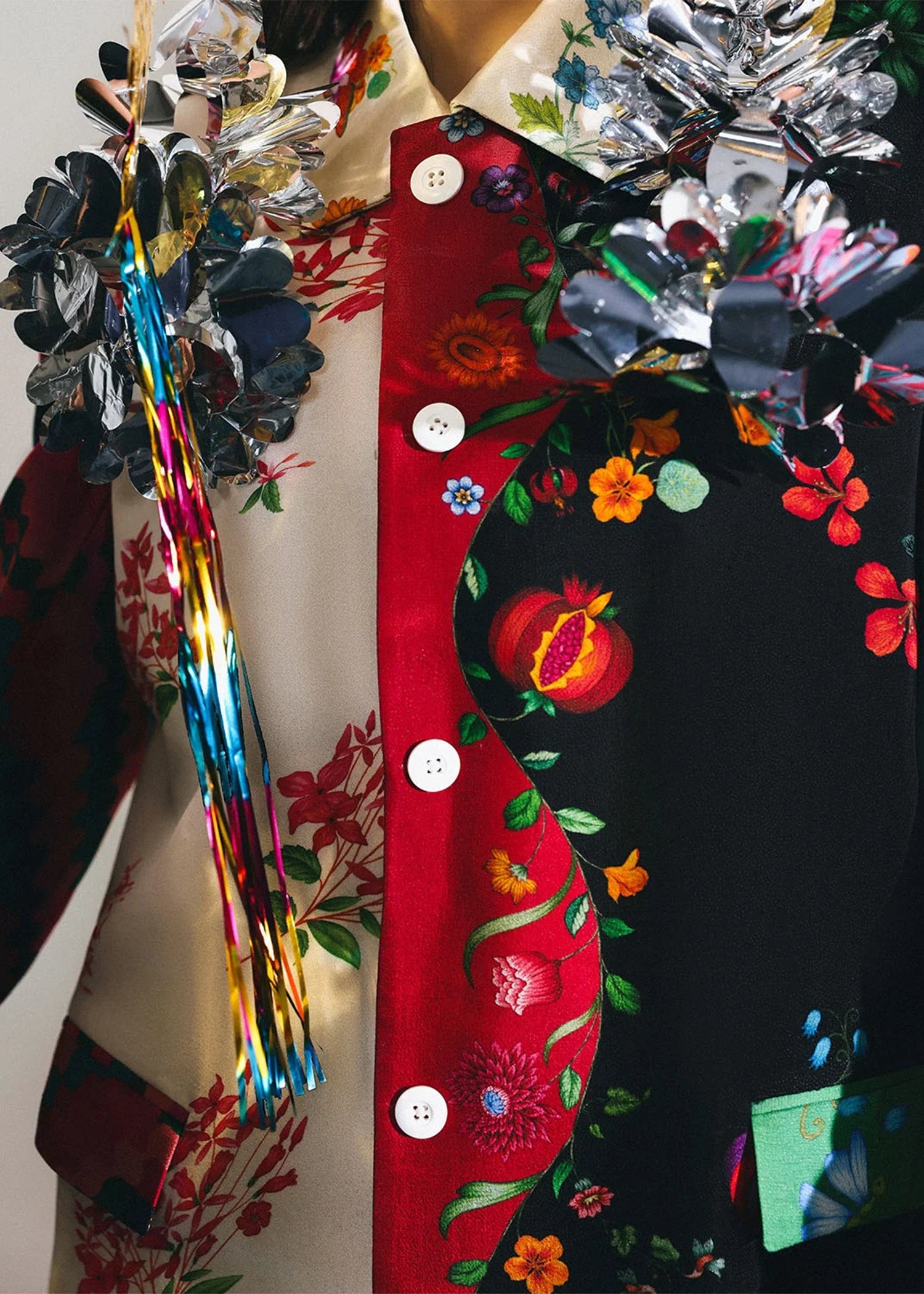 This eclectic silk trench coat is a vibrant fusion of print, texture, and bold storytelling. Designed with asymmetric paneling, it showcases a patchwork of florals, pixels, and whimsical illustrations in a palette ranging from soft creams and pastels to deep blacks and reds. With a straight silhouette, front button closure, and mid-length cut, the coat balances structure with artistic chaos.