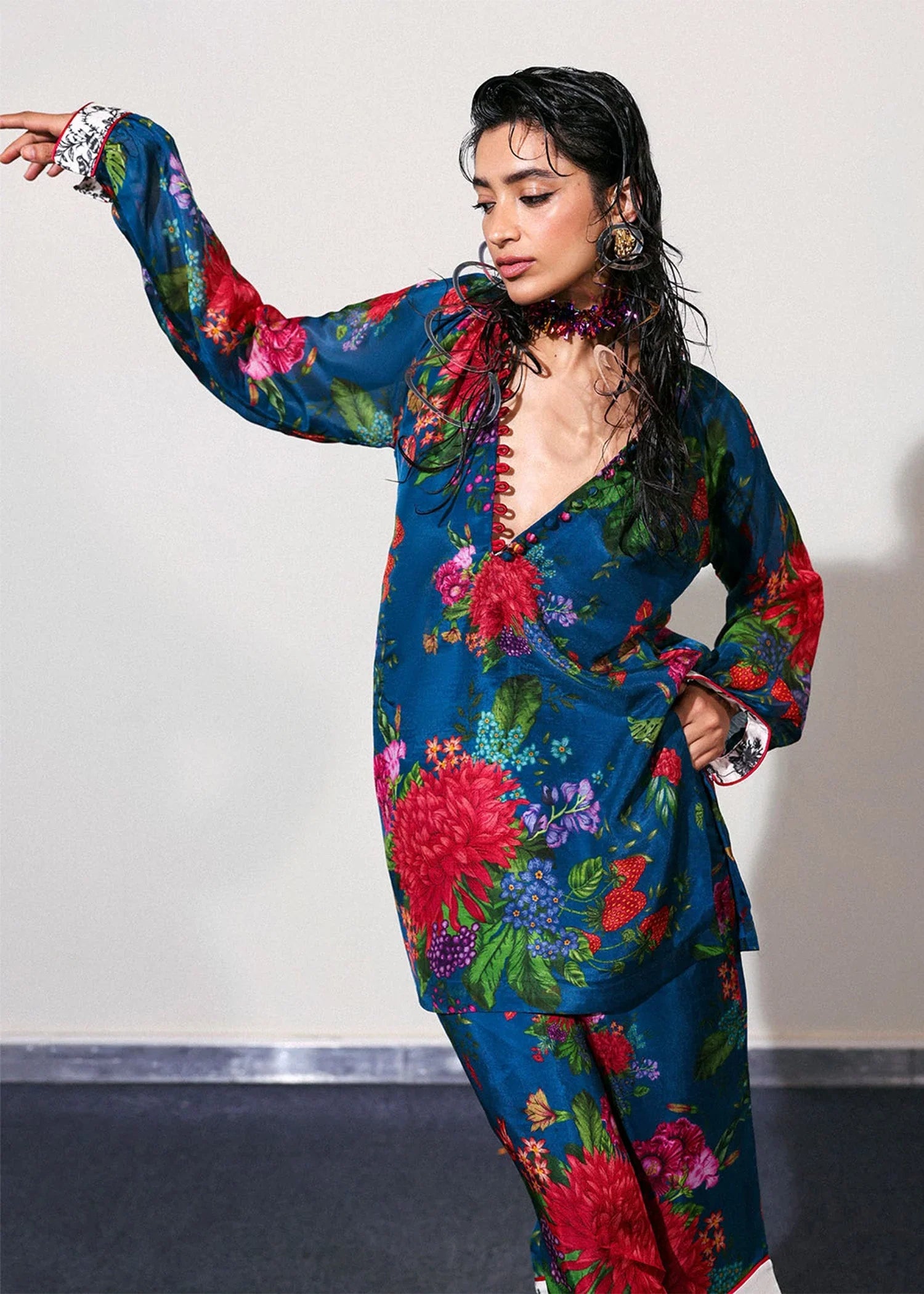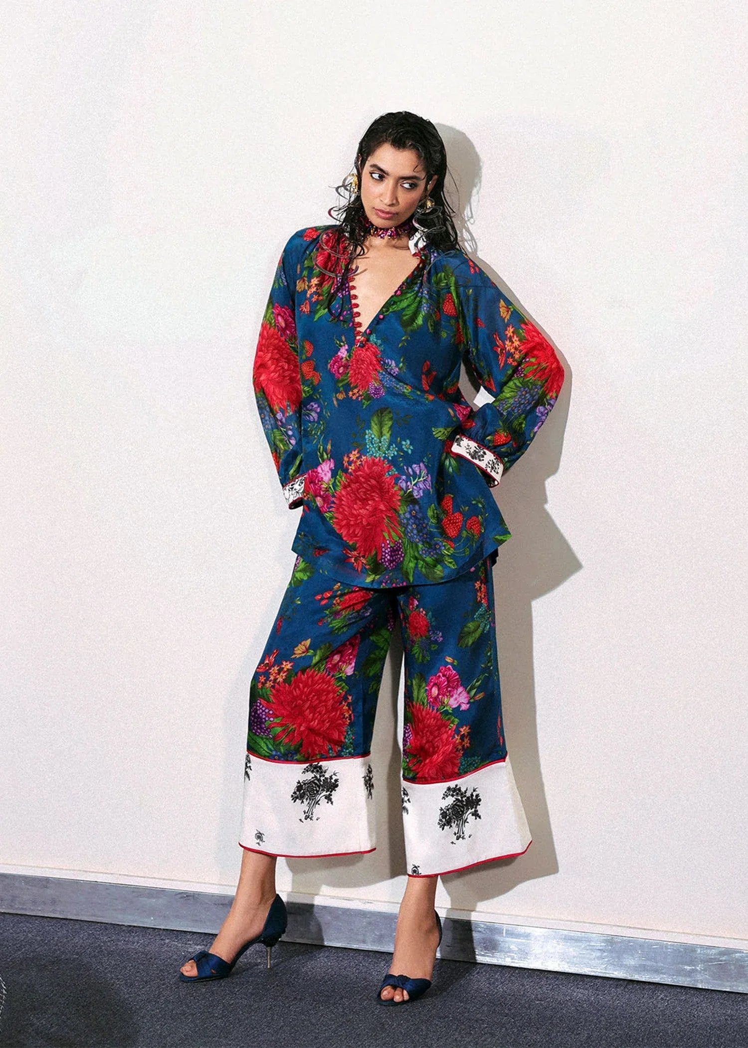 A bold floral printed coord set in cobalt blue silk, featuring a short shirt with contrast ivory floral print accents on the sleeve cuffs. Designed with raglan sleeves, gathered at hem with the contrast print cuffs. The silhouette is softened with smocked and button loop detailing at the neckline. Paired with matching culottes that are finished with contrasting ivory print on the hem. Elevated with rich red satin silk trims for a striking finish.