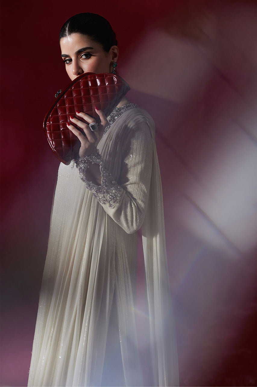 Exquisitely crafted from the finest fabric in a soft, ethereal hue, this masterpiece glimmers with intricate hand embellishments, captivating all who behold it. The luxuriously frosted chiffon in 'Poussière de Lune' drapes the body with enthralling delicacy, as a cascade of scintillating sequins creates a mesmerizing display of opulence. The meticulously draped dupatta, lavishly adorned with sequins, is elegantly fastened to the shirt, achieving an effortlessly regal formal look.